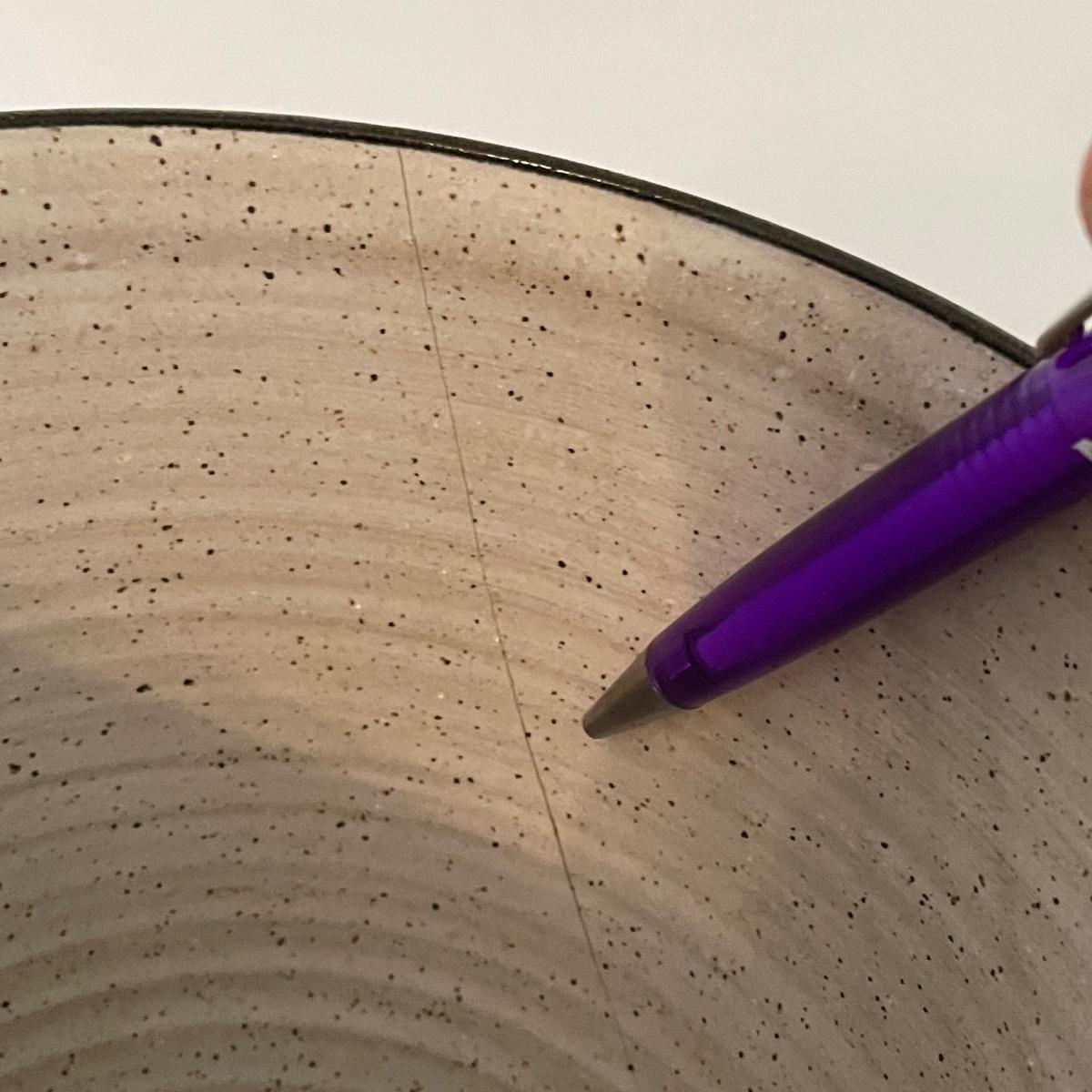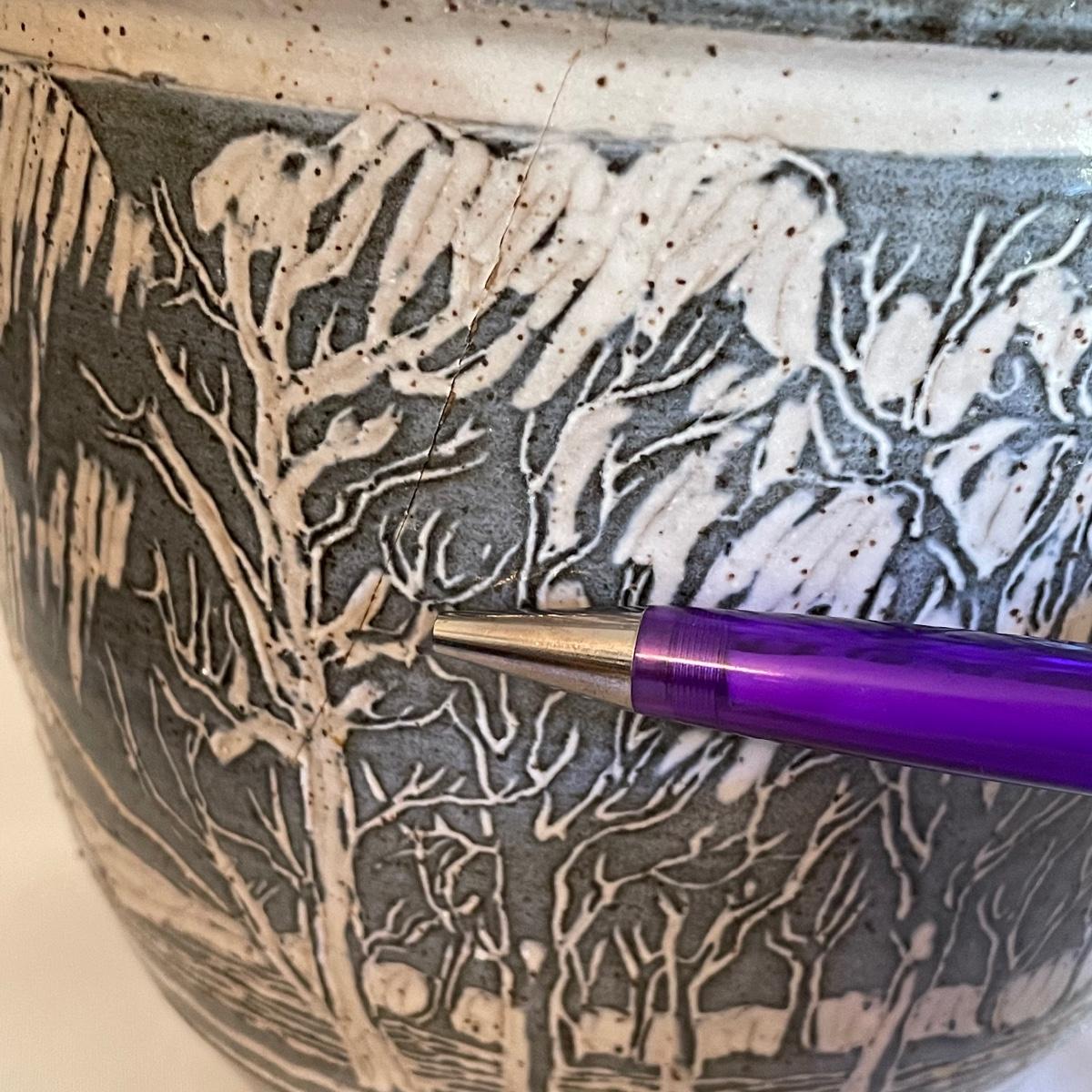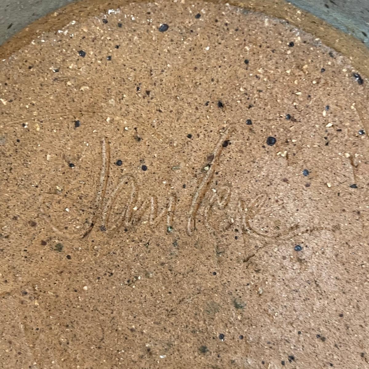 Two pieces of local pottery for you here. The speckled stoneware vase is signed by Jan Lee. The tall bowl is also speckled stoneware with a mountain/cabin scene that has been carved u to the piece. It does have a small chip near the rim and a hairline crack that is barely visible from the outside, see images.