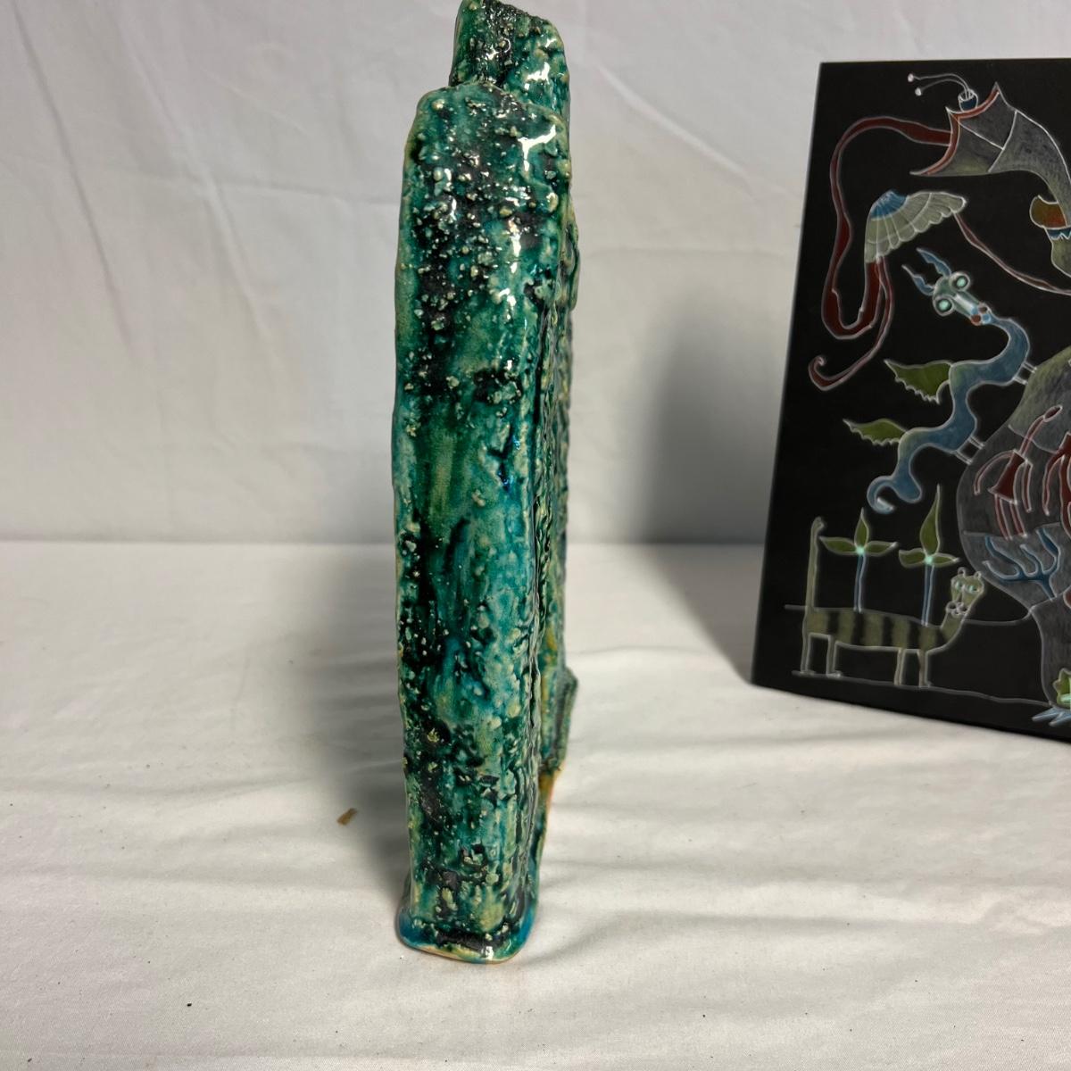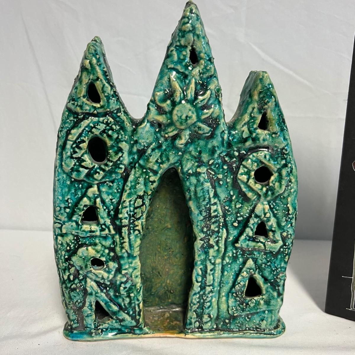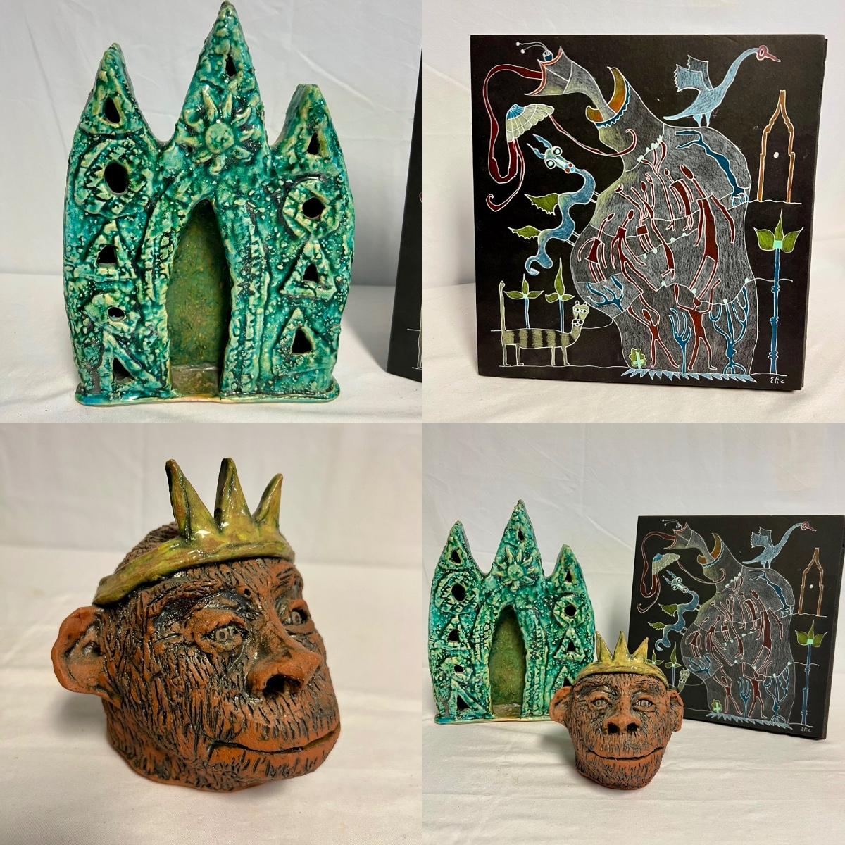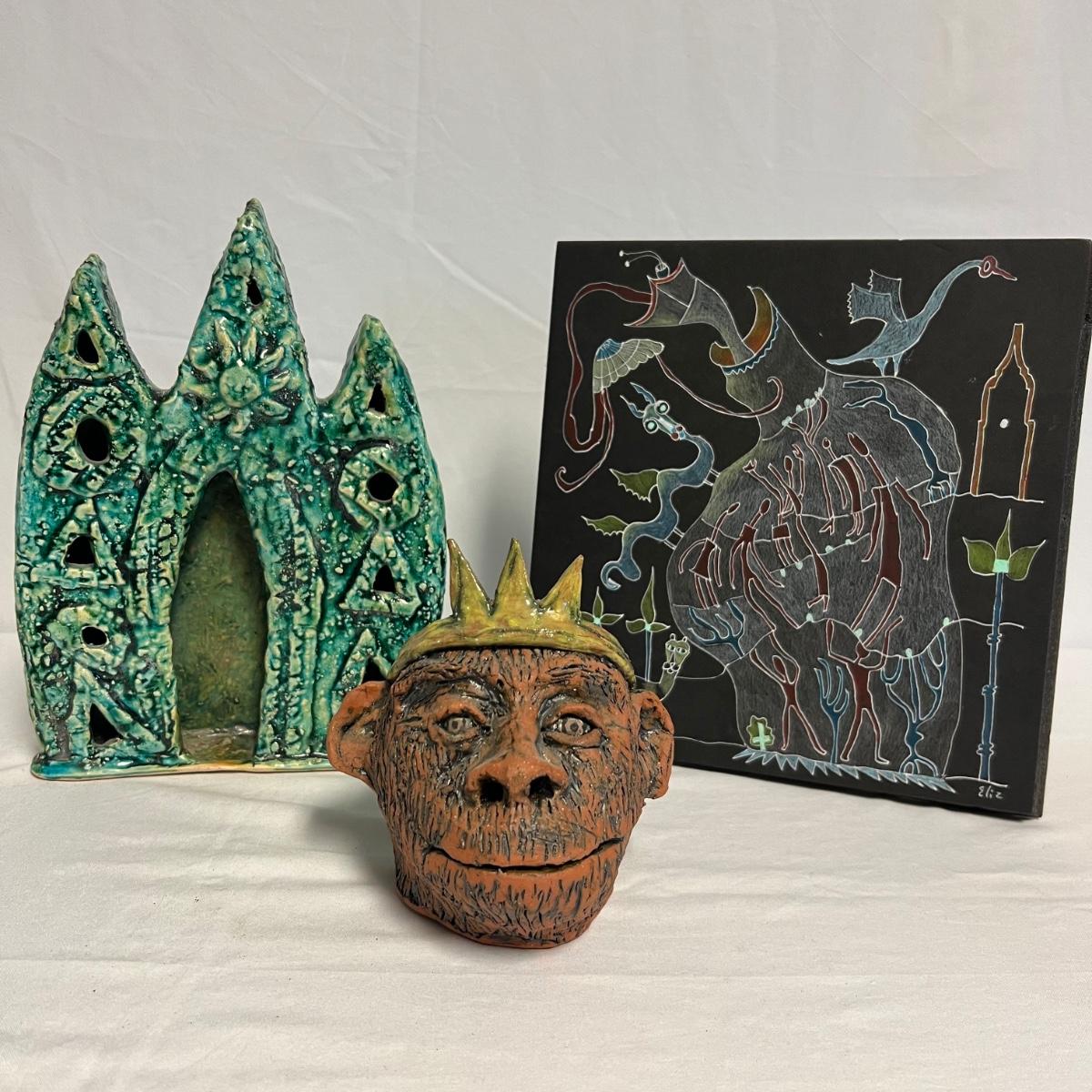 Three pieces of art by local artists. The two pottery pieces include a monkey figurine and a castle like statue that can be hung or stand alone. These pieces are signed by the owner of this estate - Laleah. The art piece by Elizabeth Henderson appears to be possibly a watercolor mounted onto a black foam board; it measures 9.5" square.