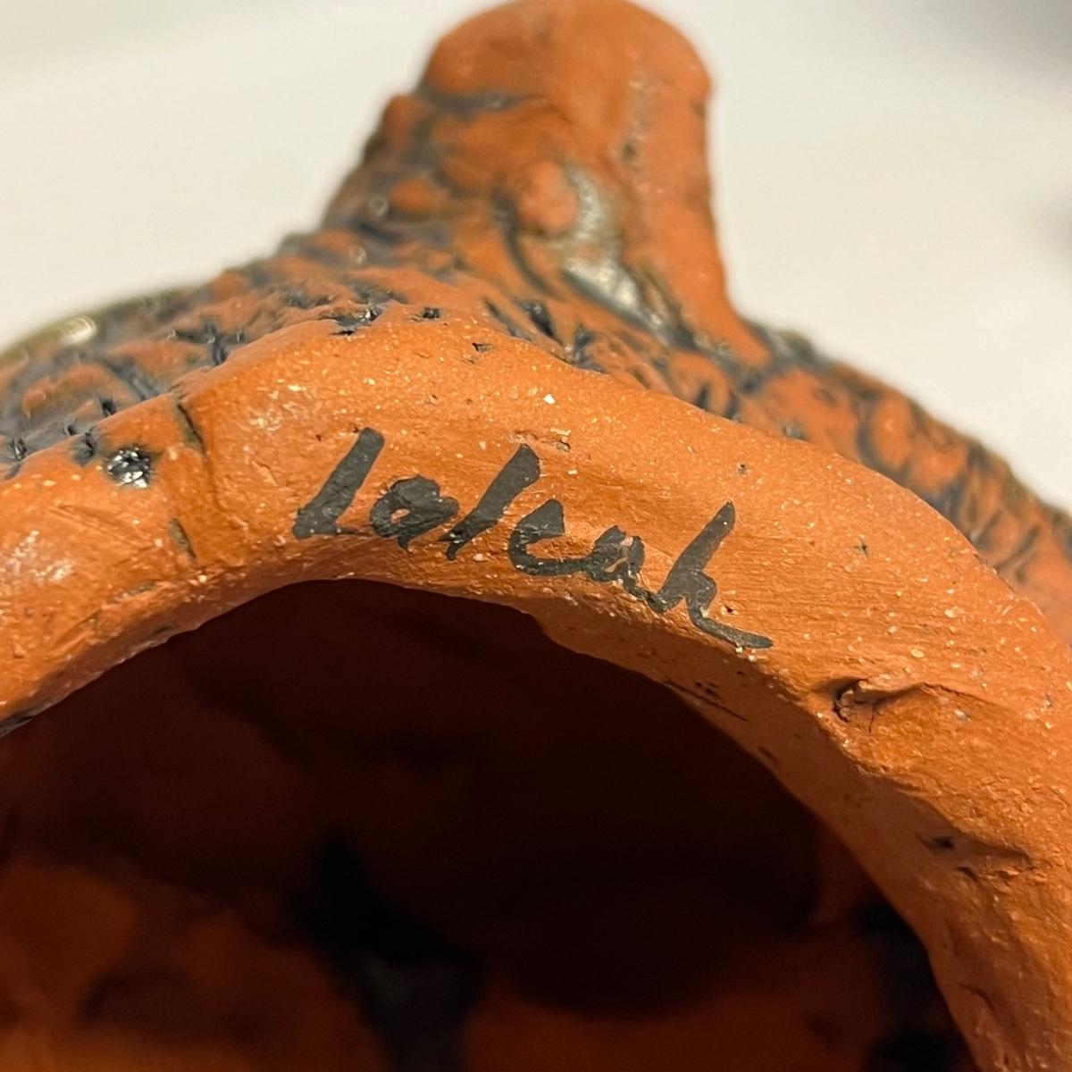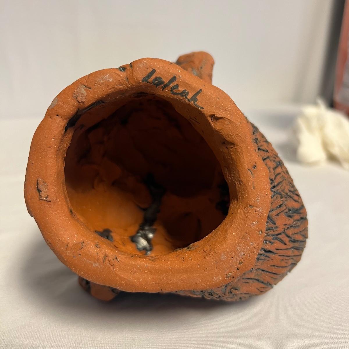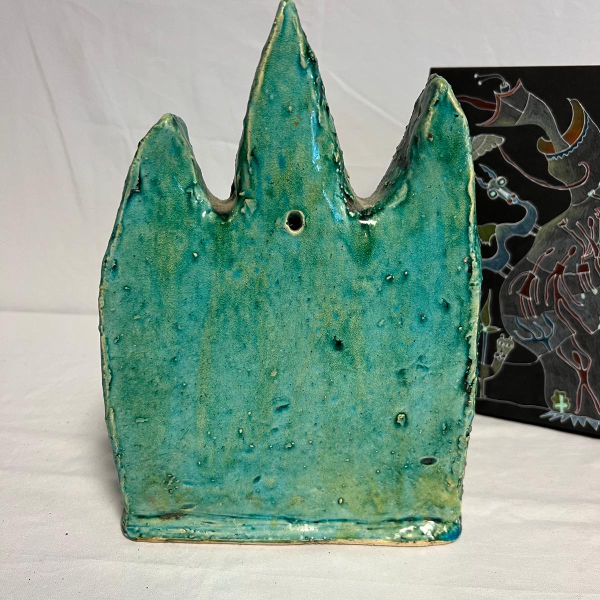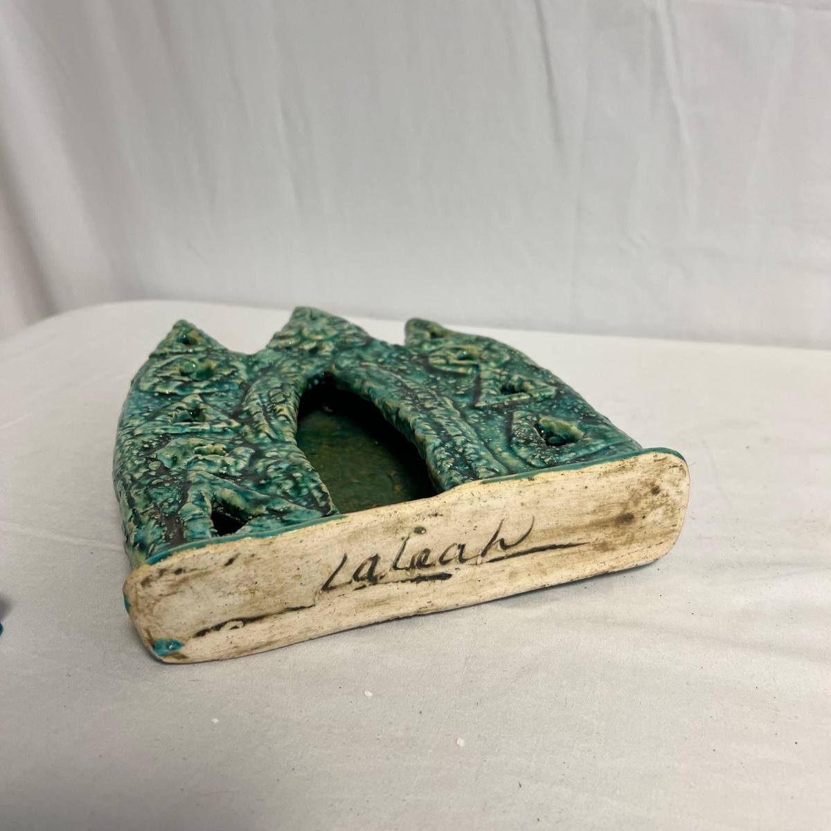 Three pieces of art by local artists. The two pottery pieces include a monkey figurine and a castle like statue that can be hung or stand alone. These pieces are signed by the owner of this estate - Laleah. The art piece by Elizabeth Henderson appears to be possibly a watercolor mounted onto a black foam board; it measures 9.5" square.