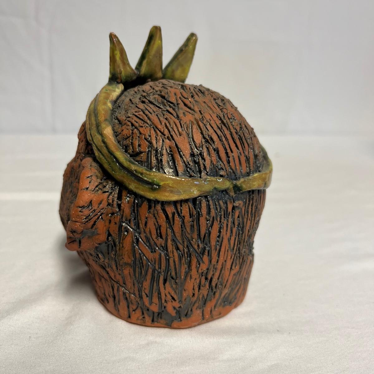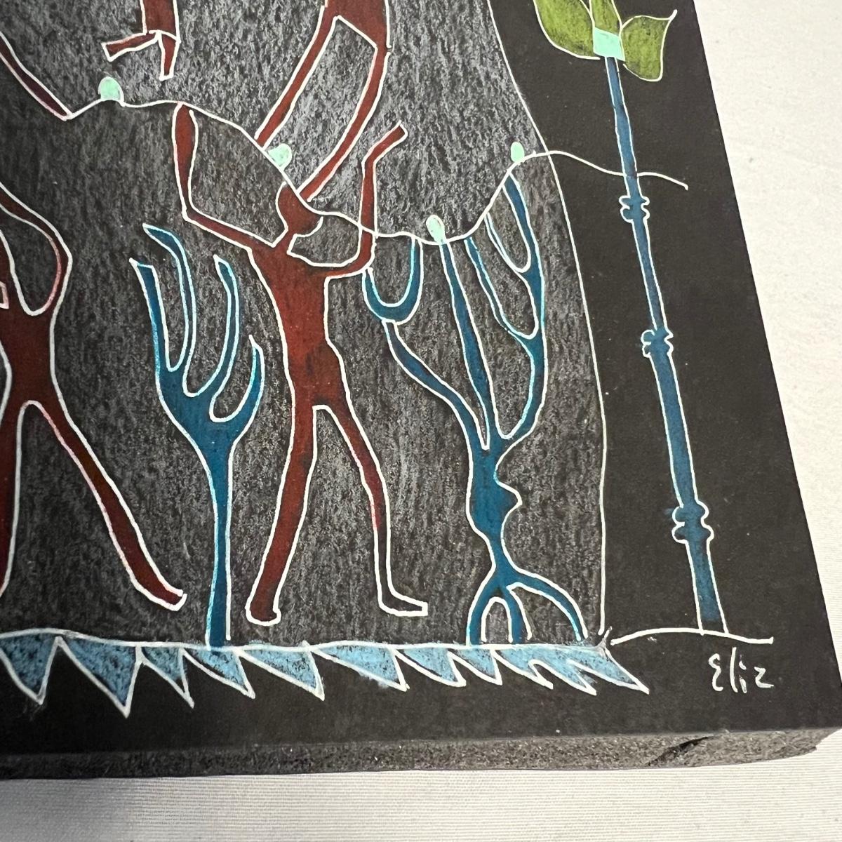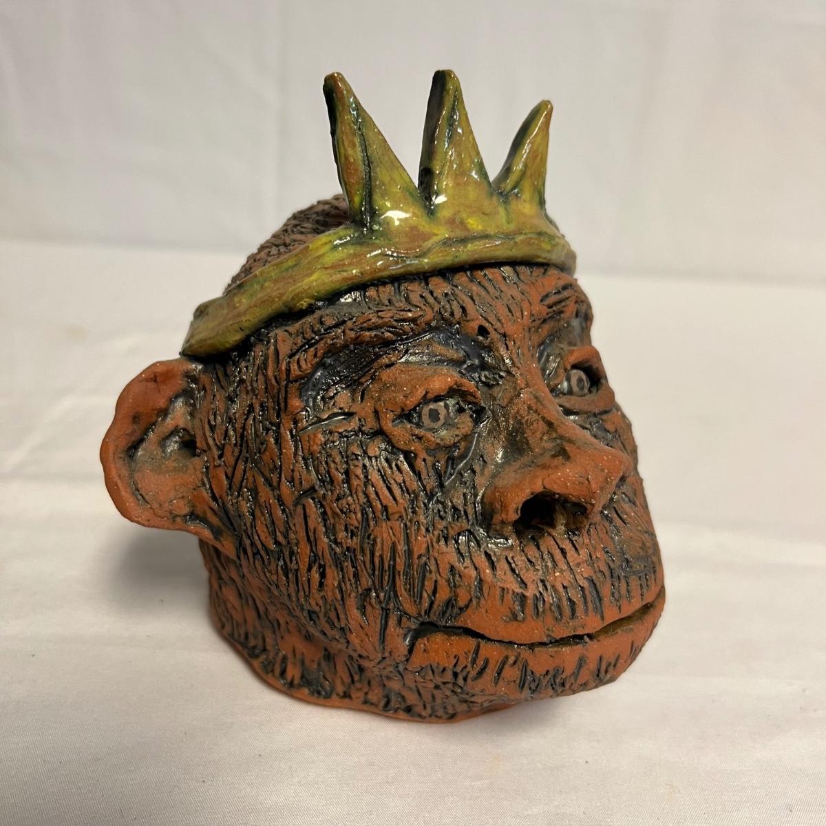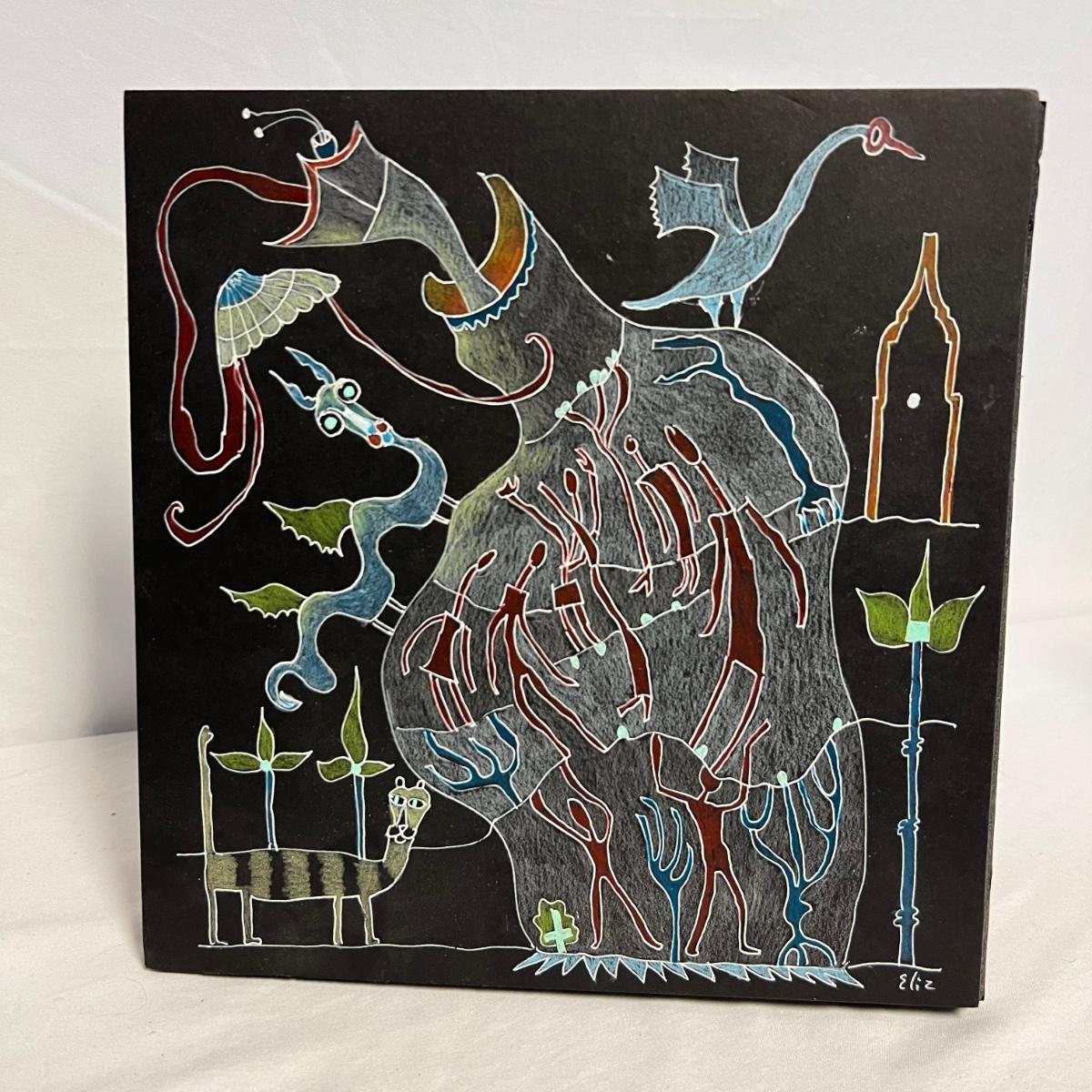 Three pieces of art by local artists. The two pottery pieces include a monkey figurine and a castle like statue that can be hung or stand alone. These pieces are signed by the owner of this estate - Laleah. The art piece by Elizabeth Henderson appears to be possibly a watercolor mounted onto a black foam board; it measures 9.5" square.