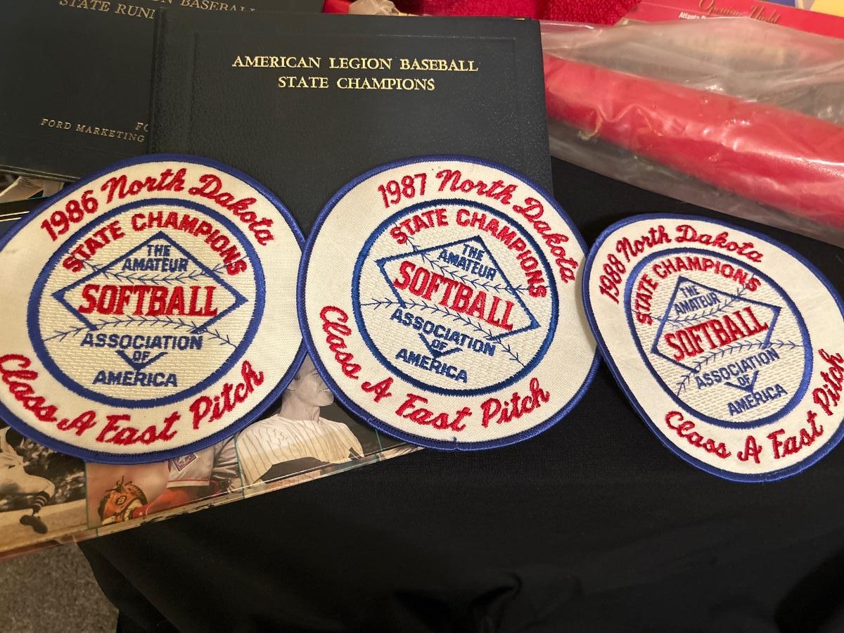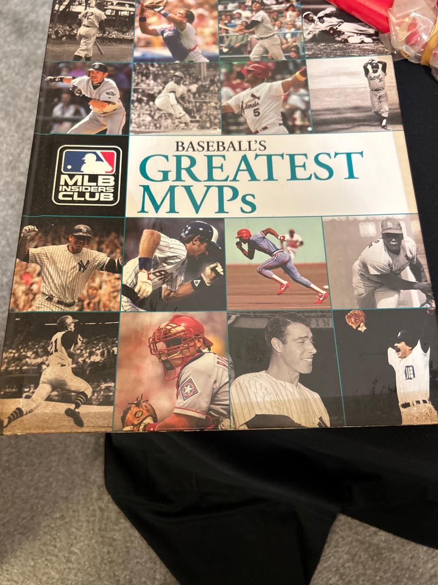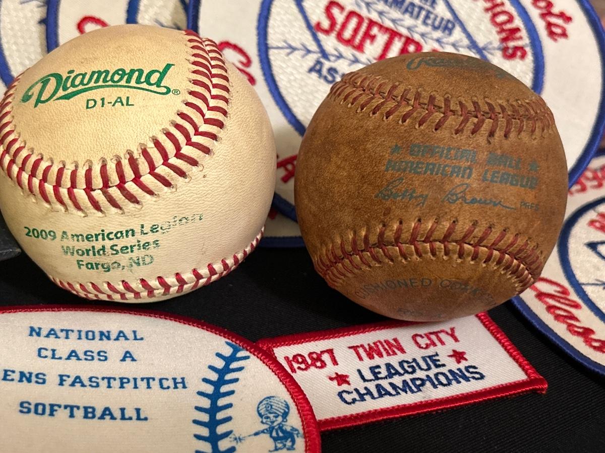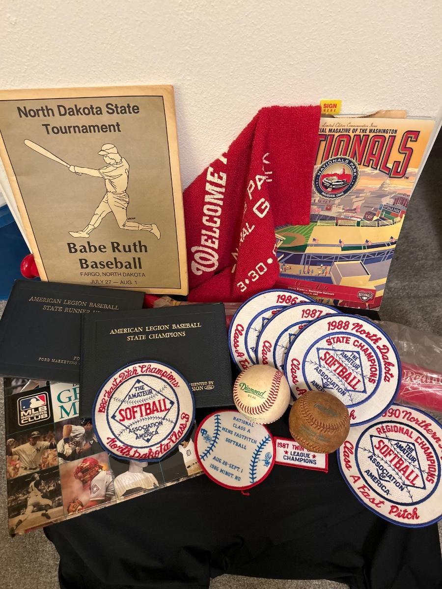 The towel & magazine are professional baseball & the MLB book. The bat is Redhawks, The white ball is the 2009 American Legion World Series Fargo, North Dakota ball and the other one is an official ball of the American league. The book in bottom left is MLB but it’s a little warped & has some staining on the bottom.