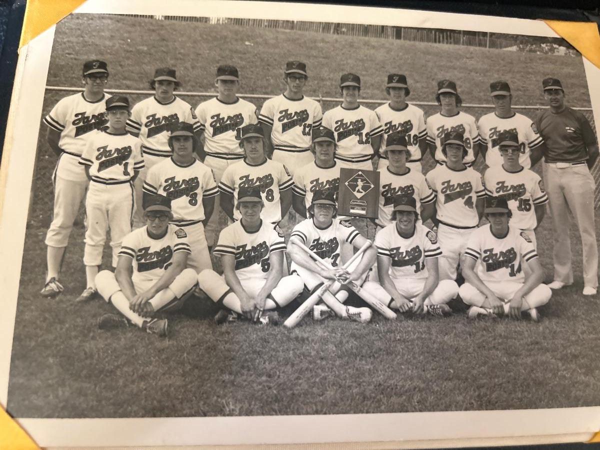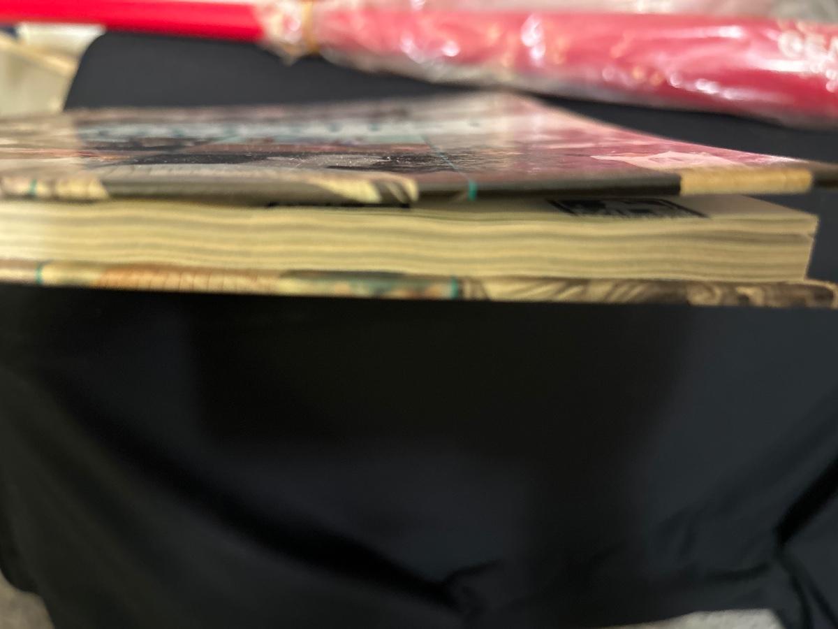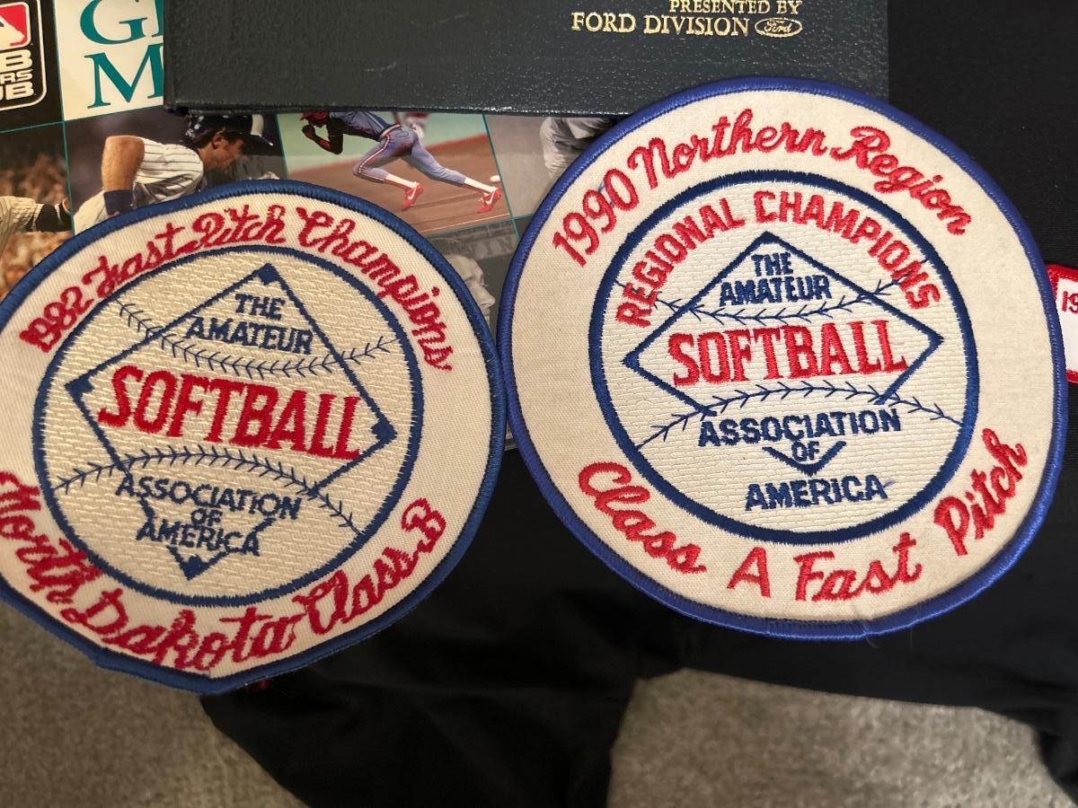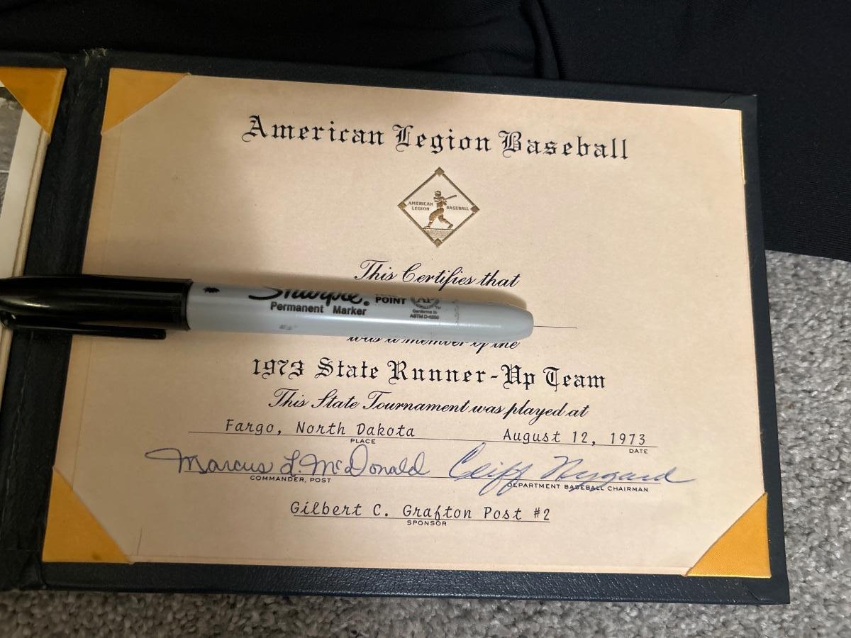The towel & magazine are professional baseball & the MLB book. The bat is Redhawks, The white ball is the 2009 American Legion World Series Fargo, North Dakota ball and the other one is an official ball of the American league. The book in bottom left is MLB but it’s a little warped & has some staining on the bottom.
