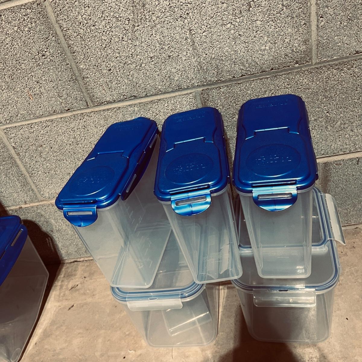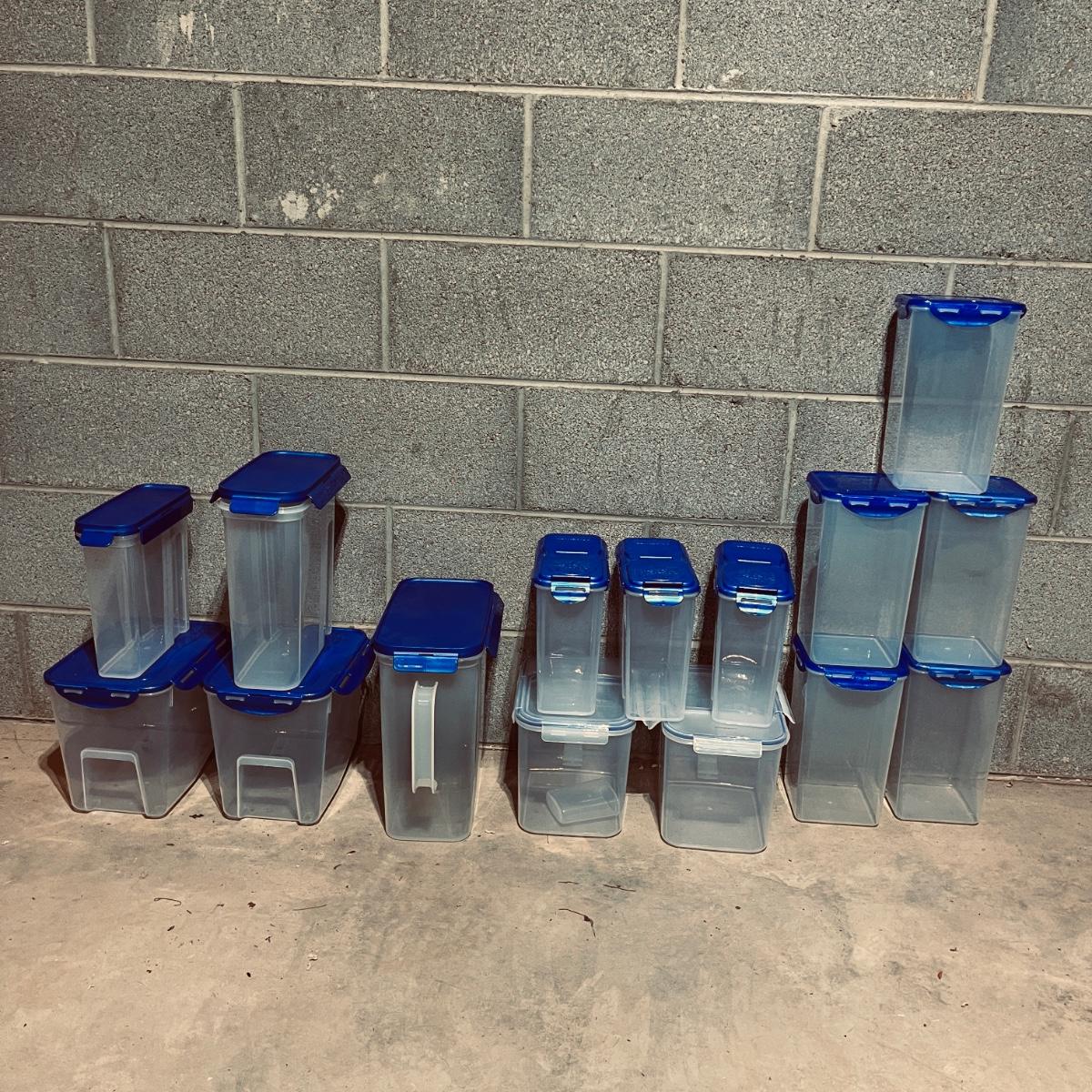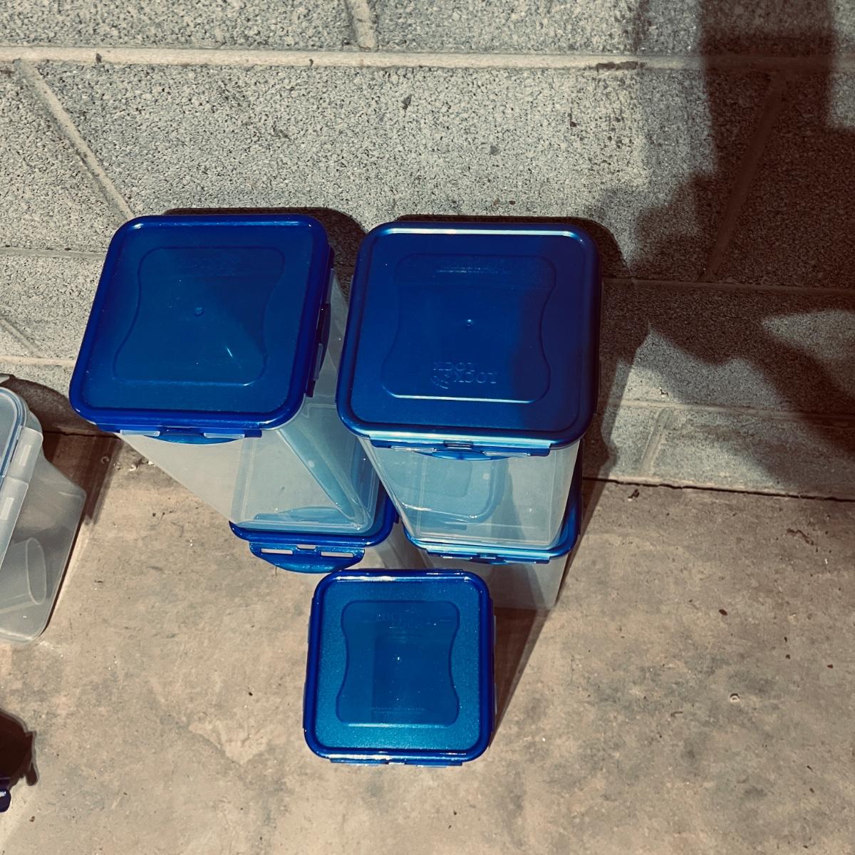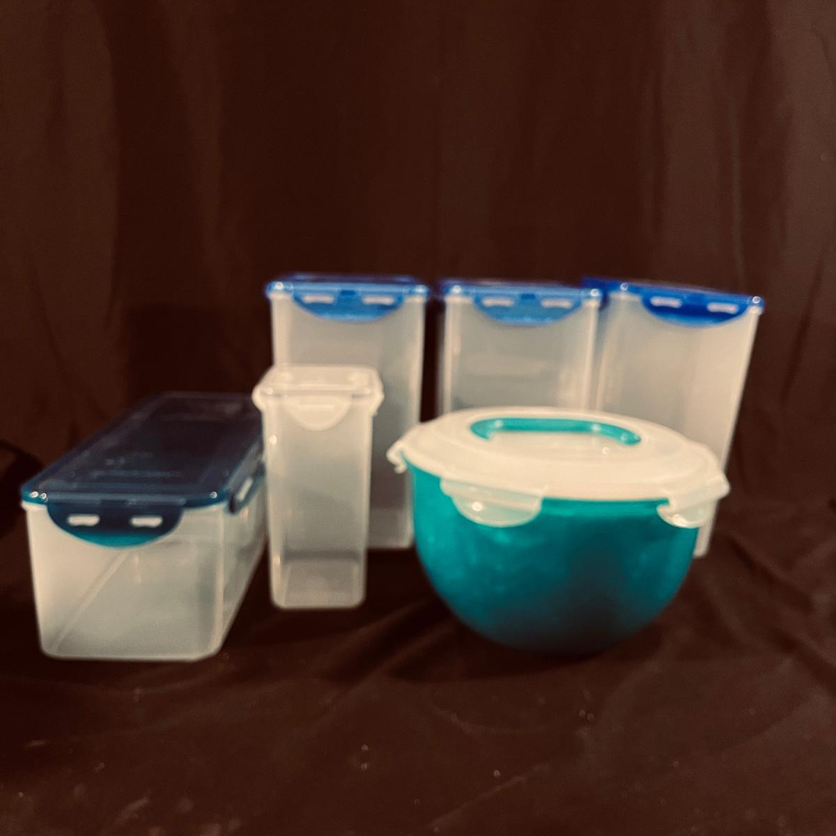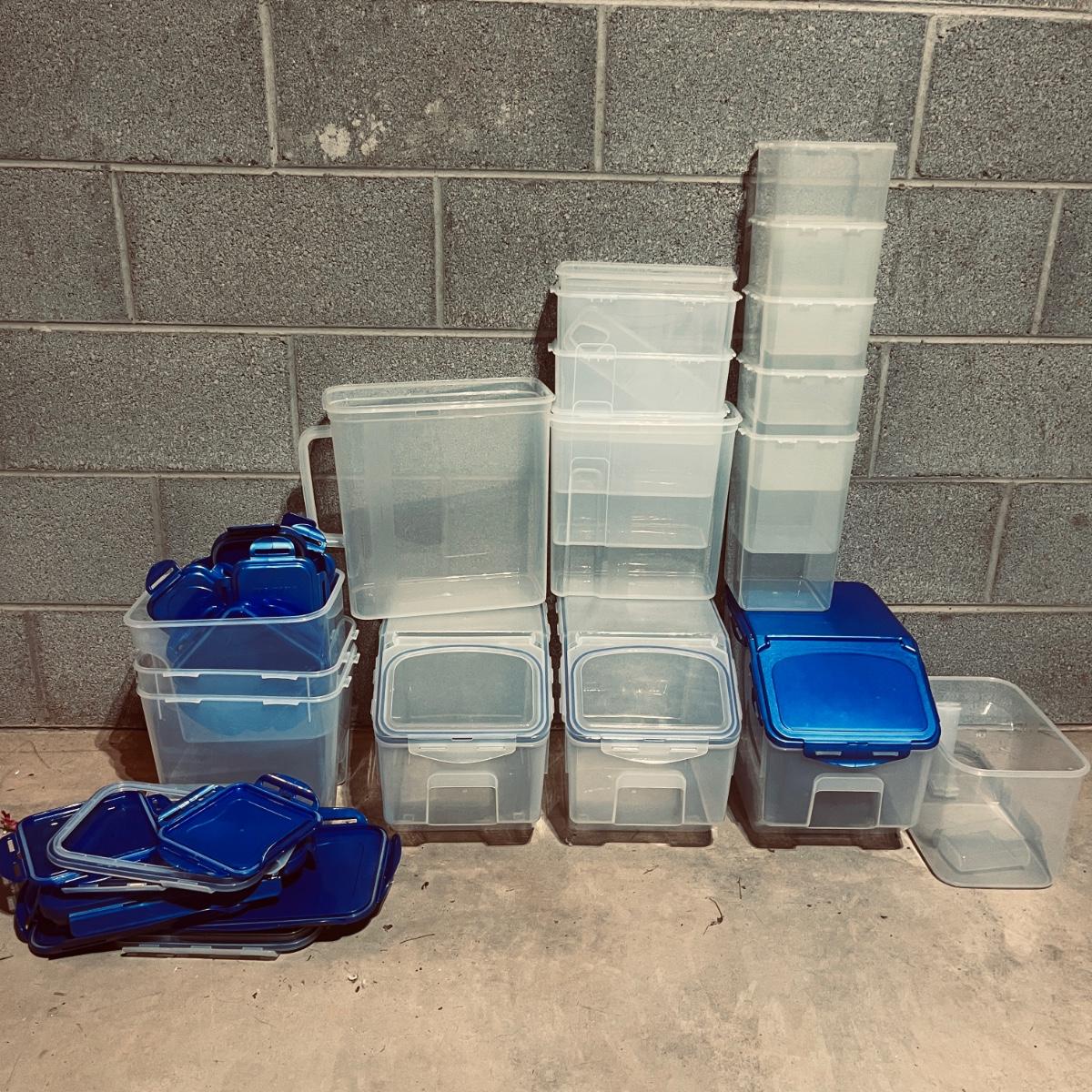 Lot includes over 20 pieces of Lock & Lock plastic containers with lids in a variety of sizes and styles. Largest container measures 9” x 13” x 10”H. The last six pictures show items added later and not in original picture.