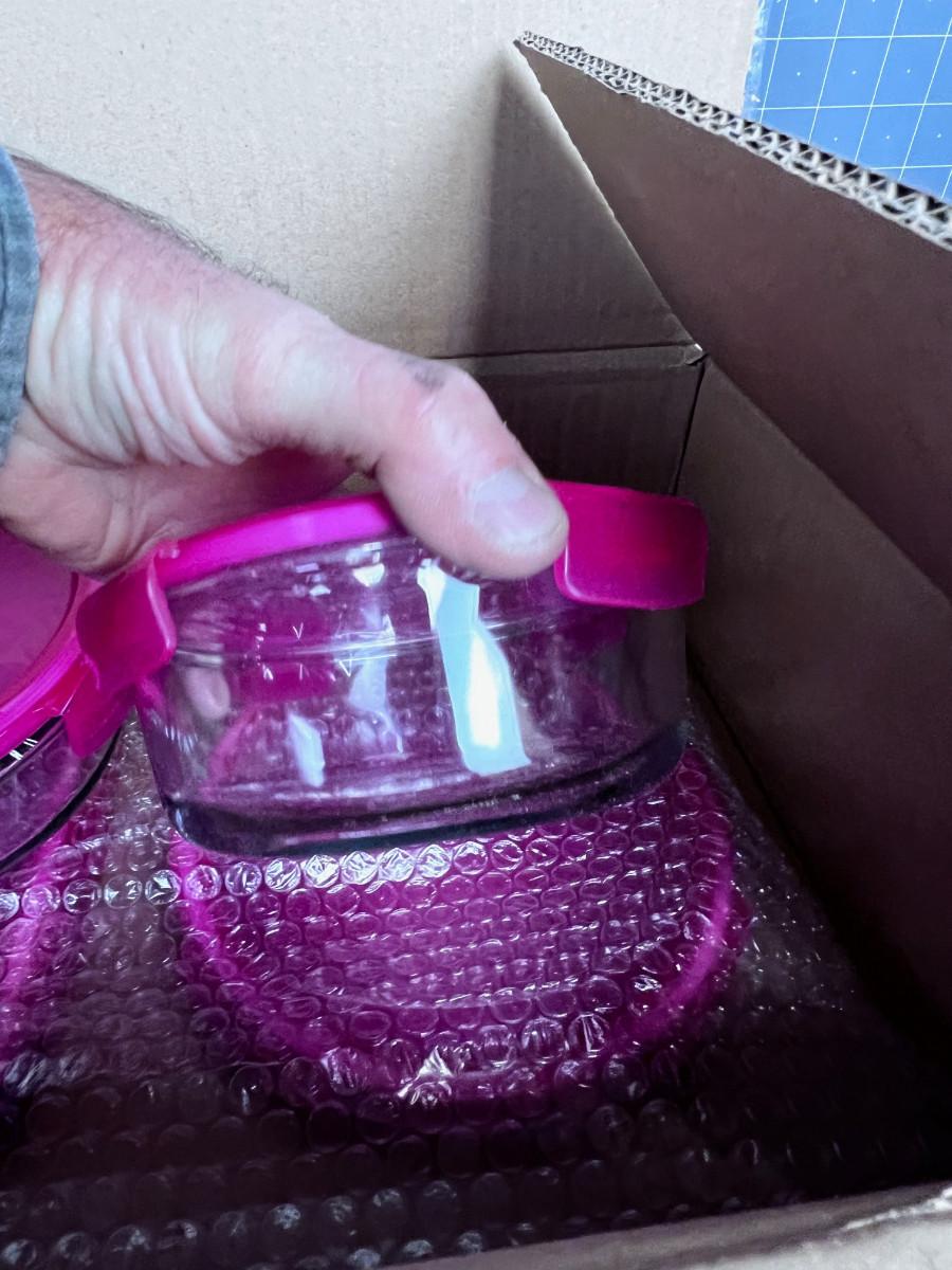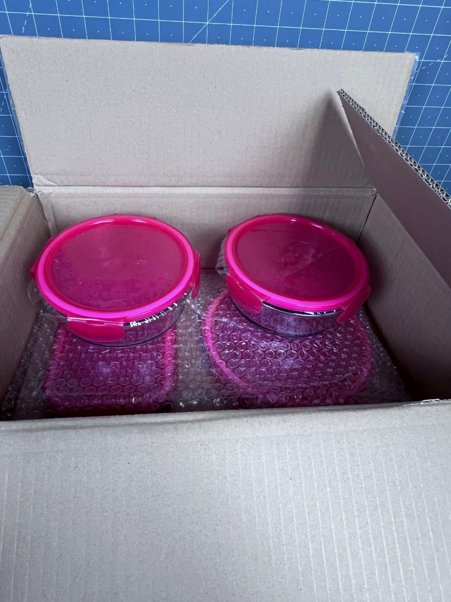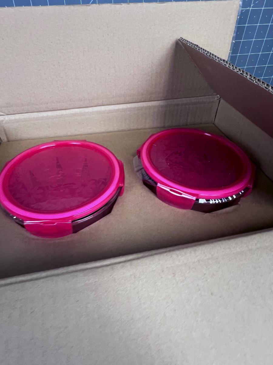 NEW in the BOX ! Lids are Pink! Microwave and Oven Safe Glass both Round and Rectangular. Shipping Available.