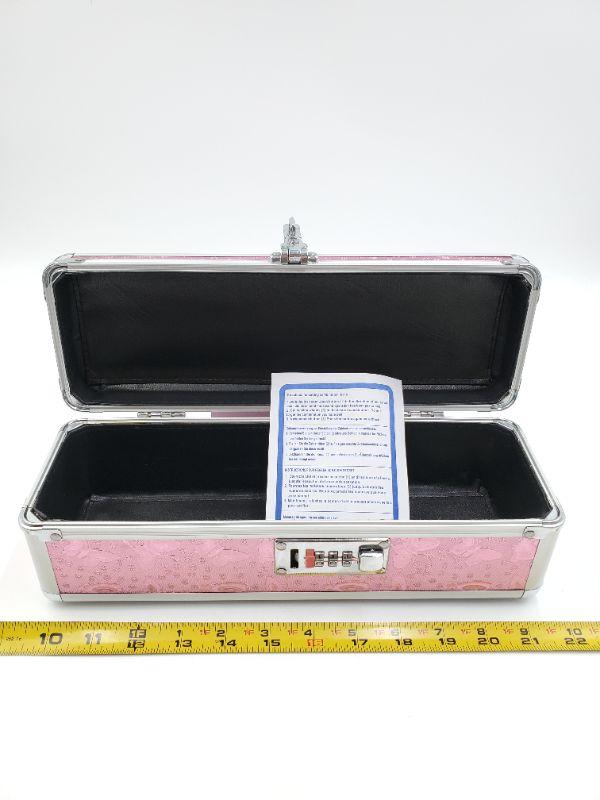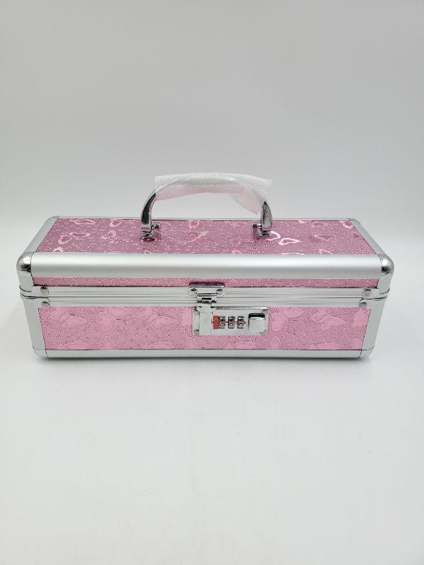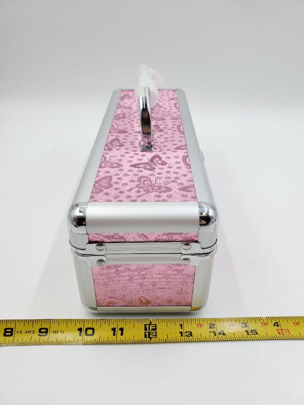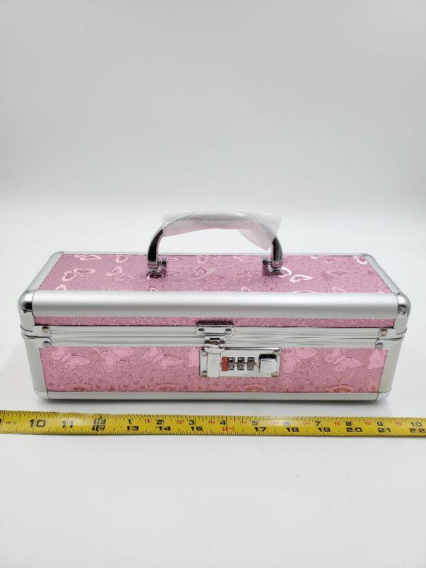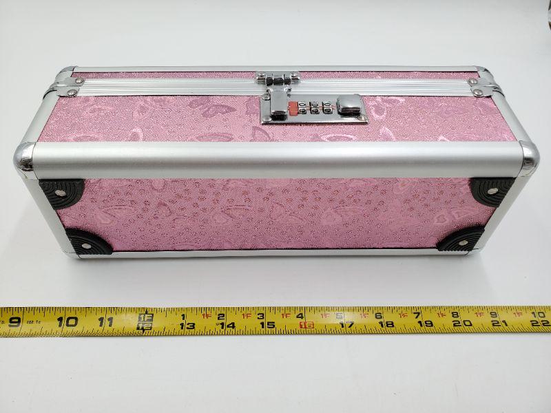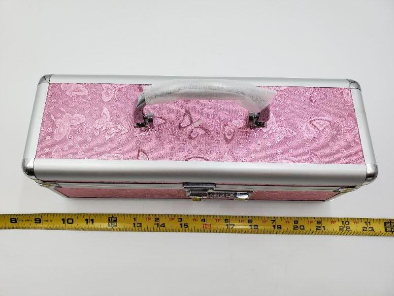 This adorable storage tote is adorned with lovely pink butterfly fabric and silver toned accents of metal. Hard case, measures approximately 12in wide 4in deep and 4.25in tall. Instructions to set code included. New condition
