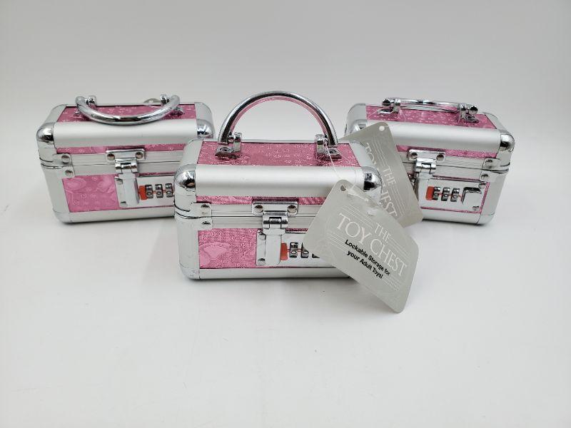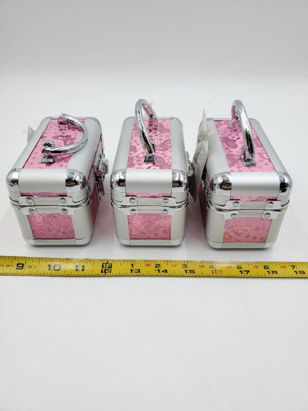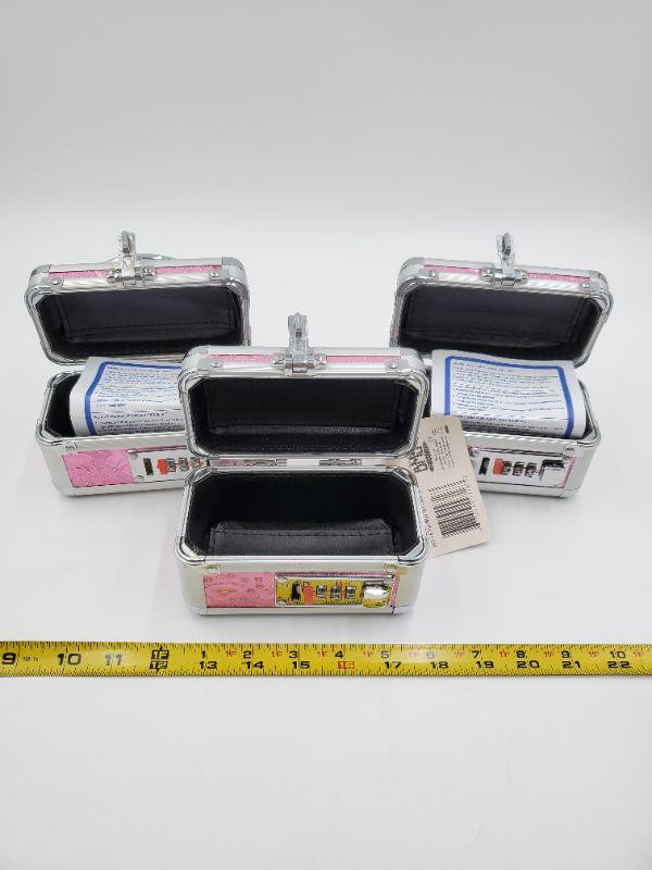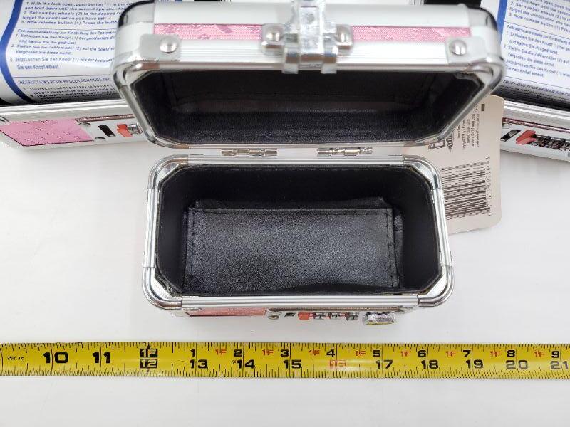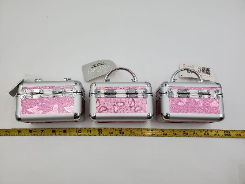 These little lockable storage totes, set if 3, come with instructions on setting the lock code, new condition. Pretty pink butterfly fabric accented with silver toned metal, hard shell.