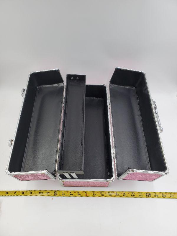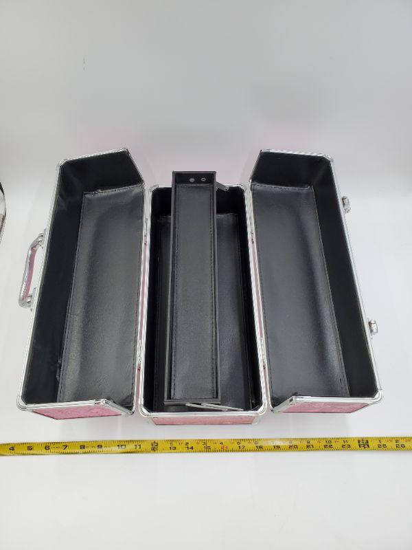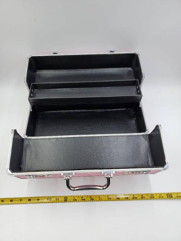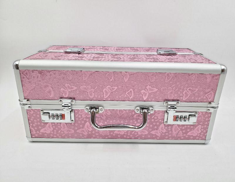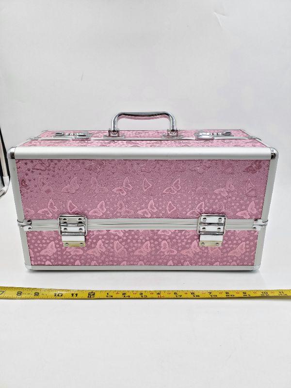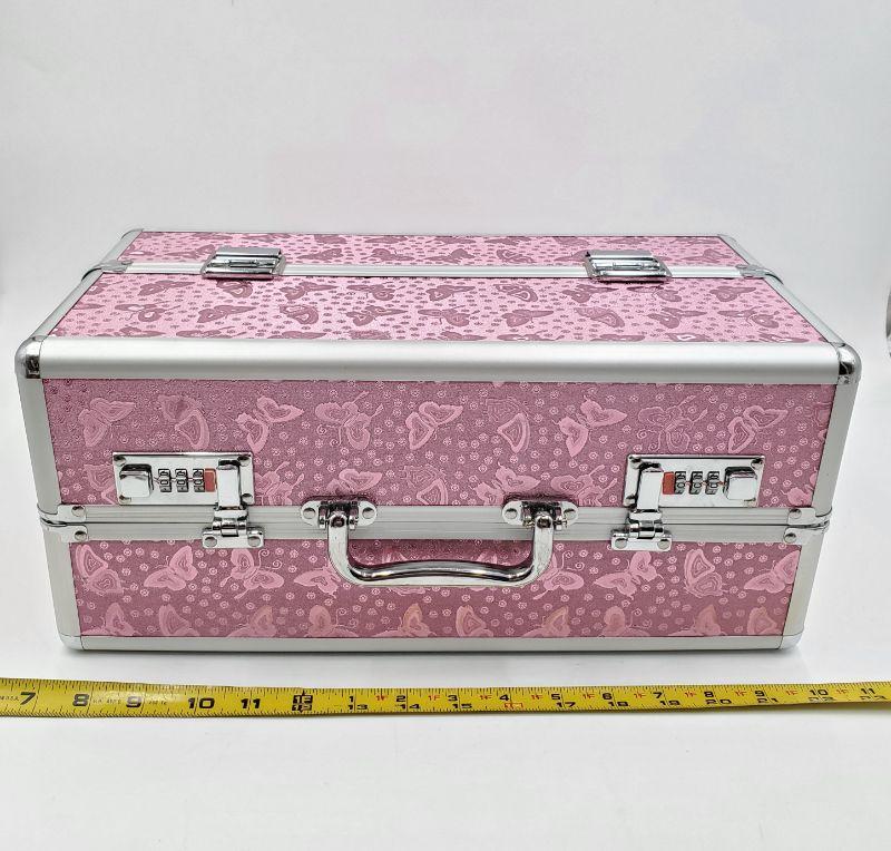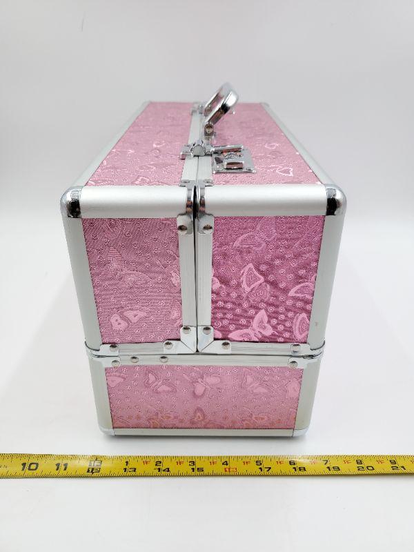 This large lockable storage tote still has the tag stuck through the lock, like new condition. Very pretty pink butterfly fabric accented with silver tones trim. This would be perfect for someone selling jewelry to transport merchandise!