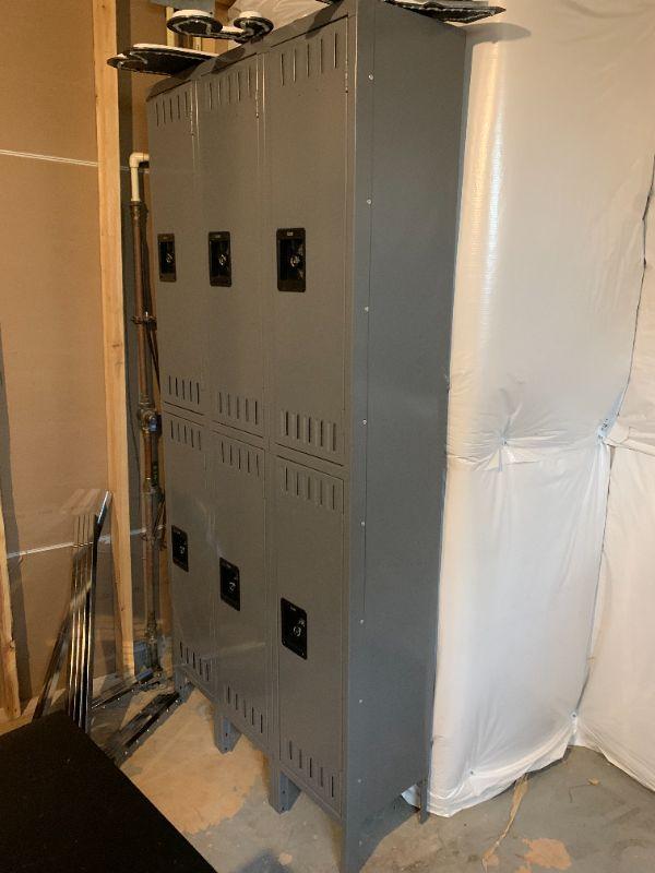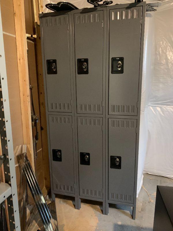 ULINE double-tiered locker set with six individual lockers. Four of them have codes, two have accidentally been closed inside the lockers. A master key is available for purchase for $7 online to open all of them.