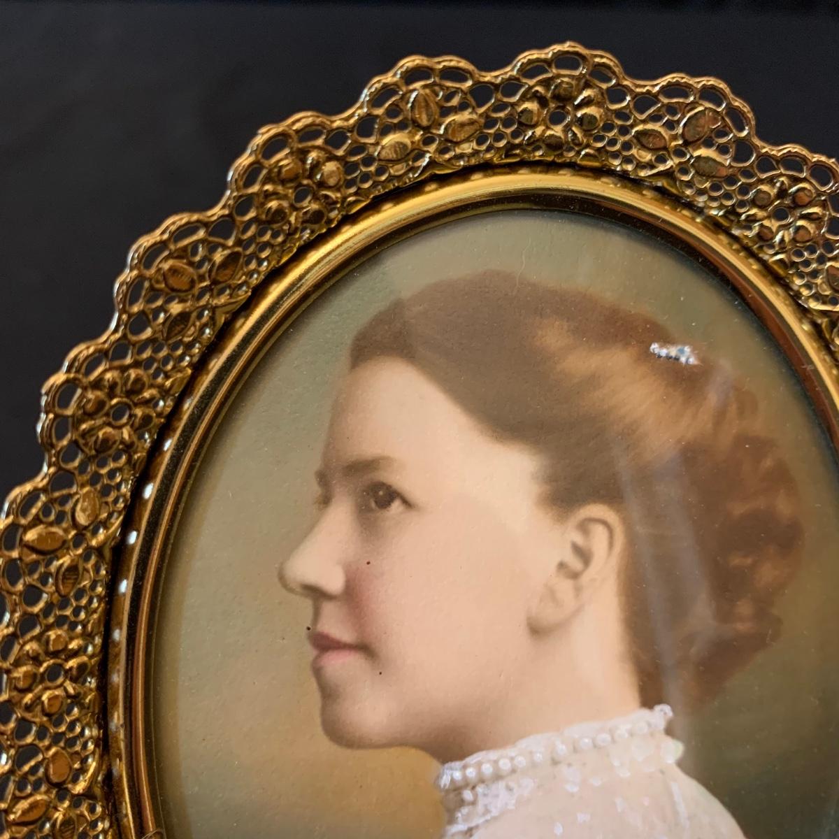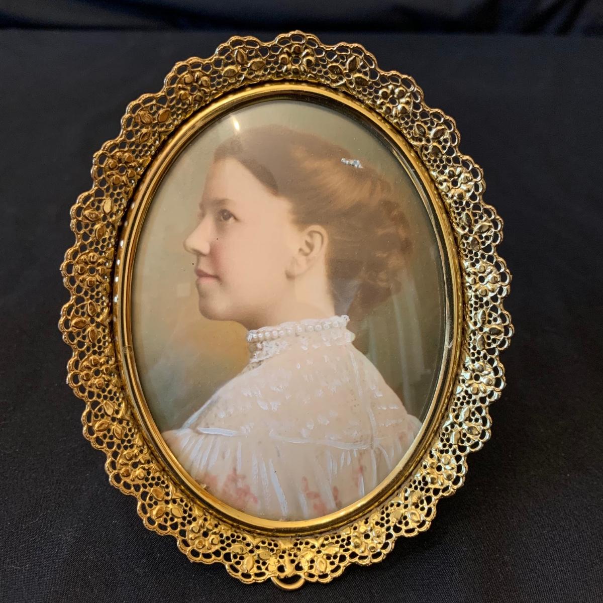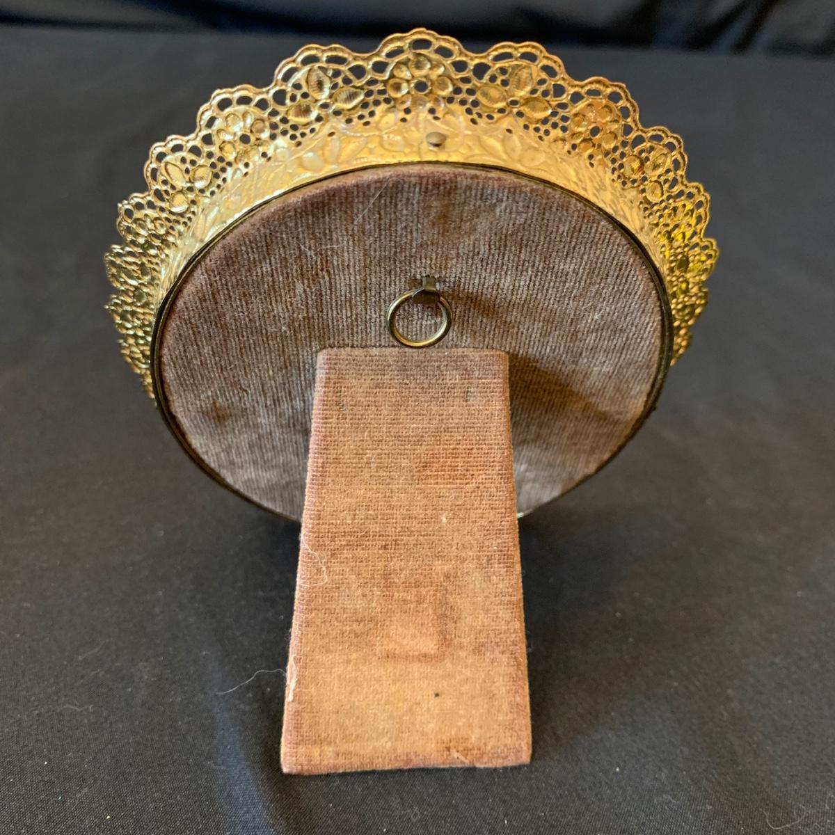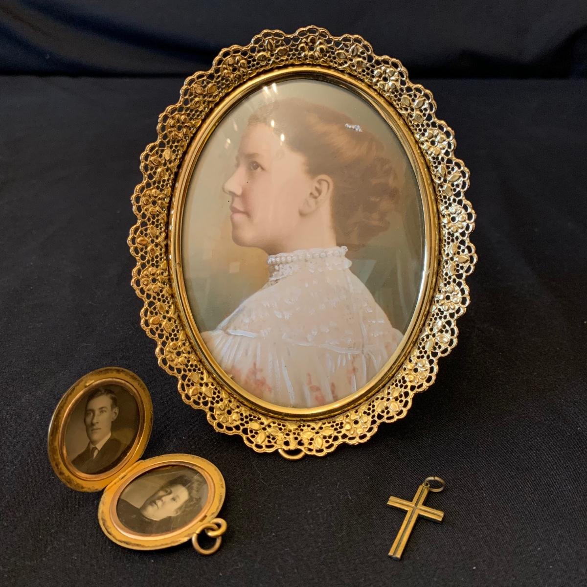 This collection of items includes a locket and a golden metal frame with antique-style photographs, as well as a cross pendant. Frame measures approximately 4” x 5” and the locket is a little bigger than a quarter. Frame is in very good condition. Locket shows some wear.