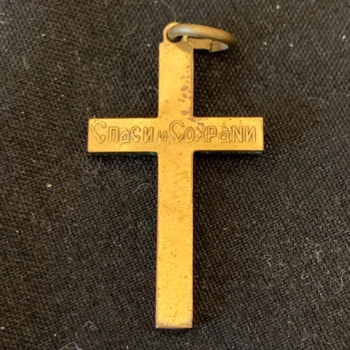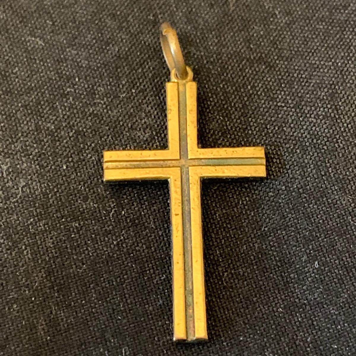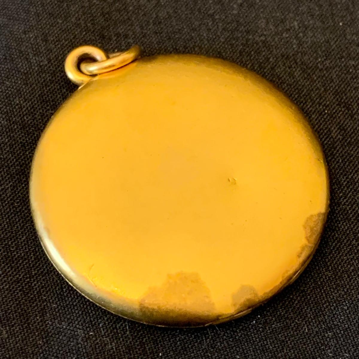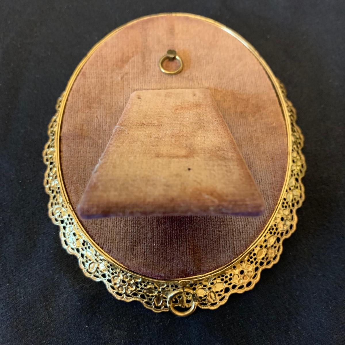 This collection of items includes a locket and a golden metal frame with antique-style photographs, as well as a cross pendant. Frame measures approximately 4” x 5” and the locket is a little bigger than a quarter. Frame is in very good condition. Locket shows some wear.