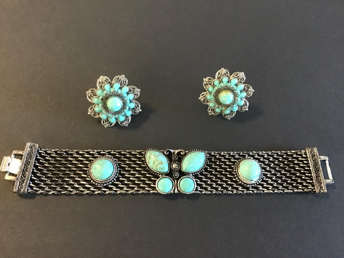 Locking Bracelet Butterfly. And Earrings set Silver Tone
