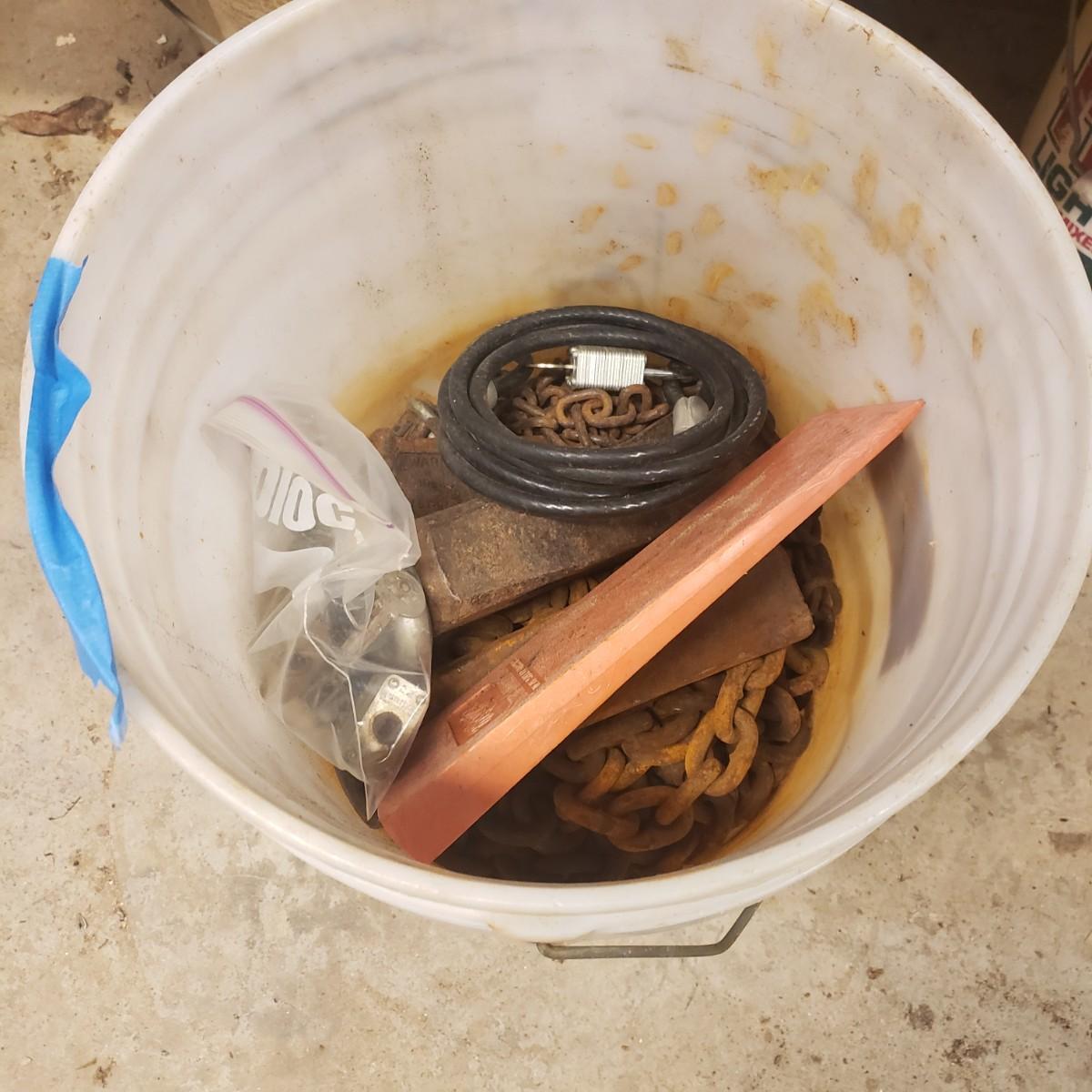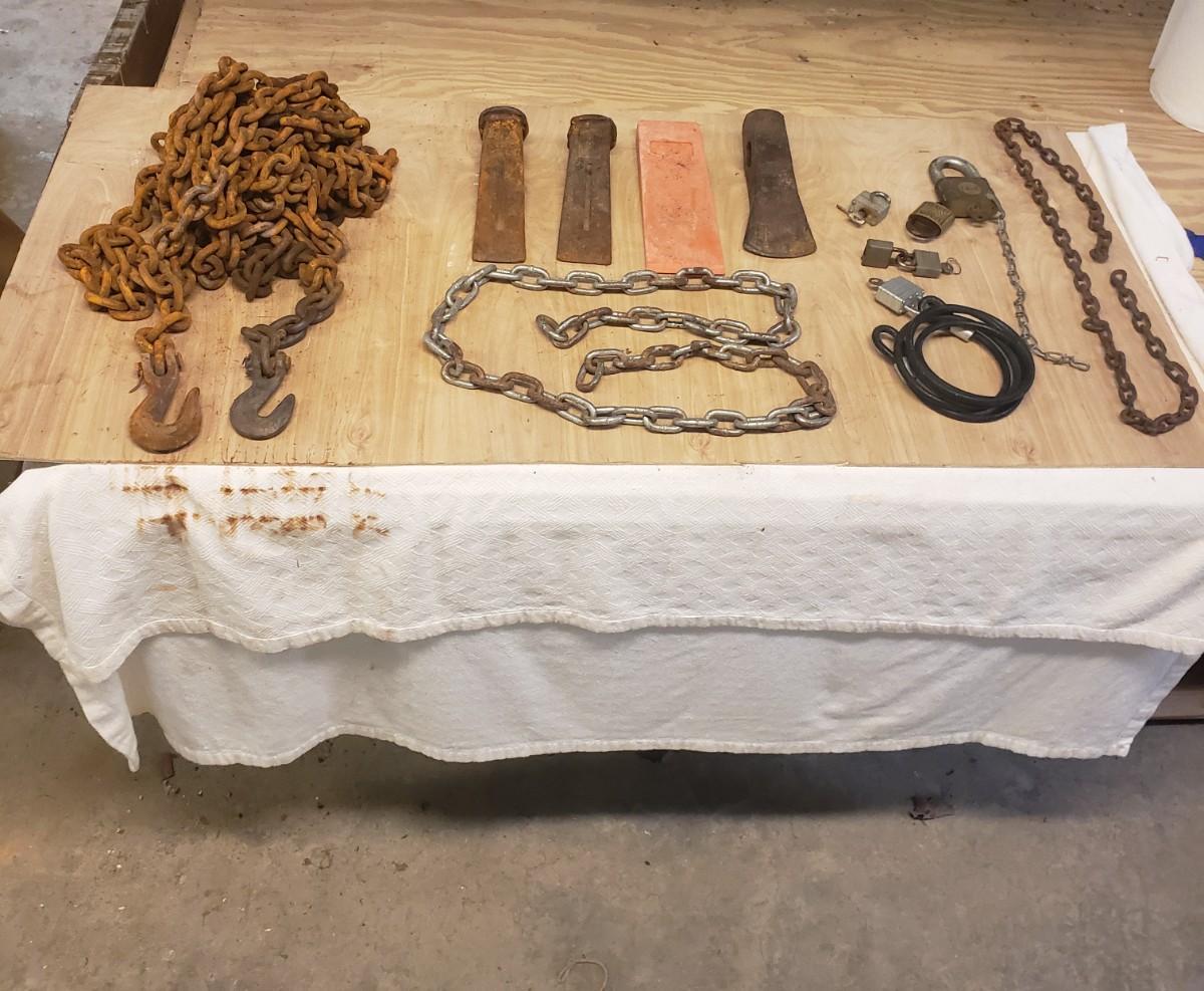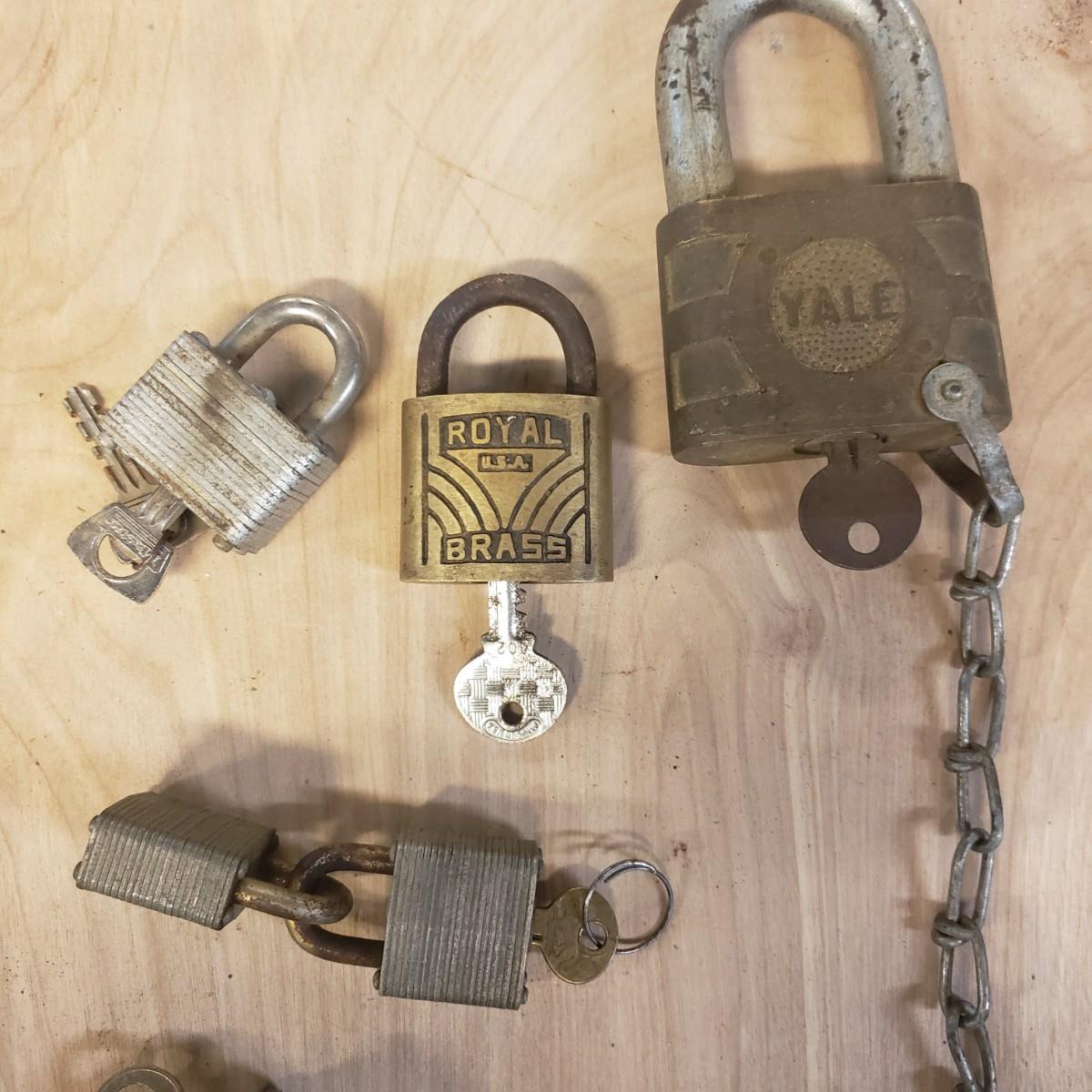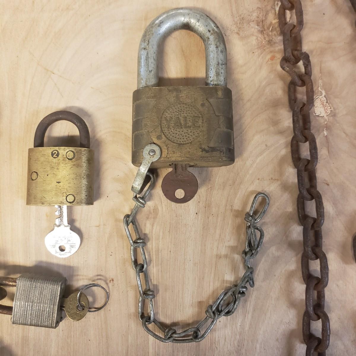This lot has key locks, that all work when the key is turned. There is a vintage Royal lock made of brass. There are four splitting wedges, three are metal and one is plastic by Woodys, see pictures. There is one long chain with a hook on each end. The small chain measures approximately 4'. The bucket with all items is very heavy.