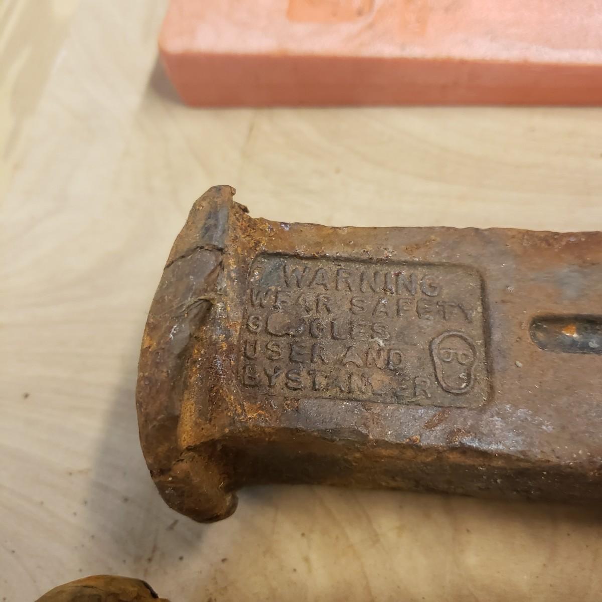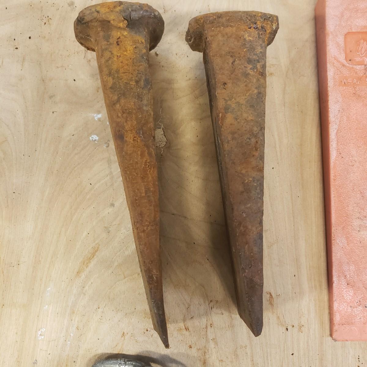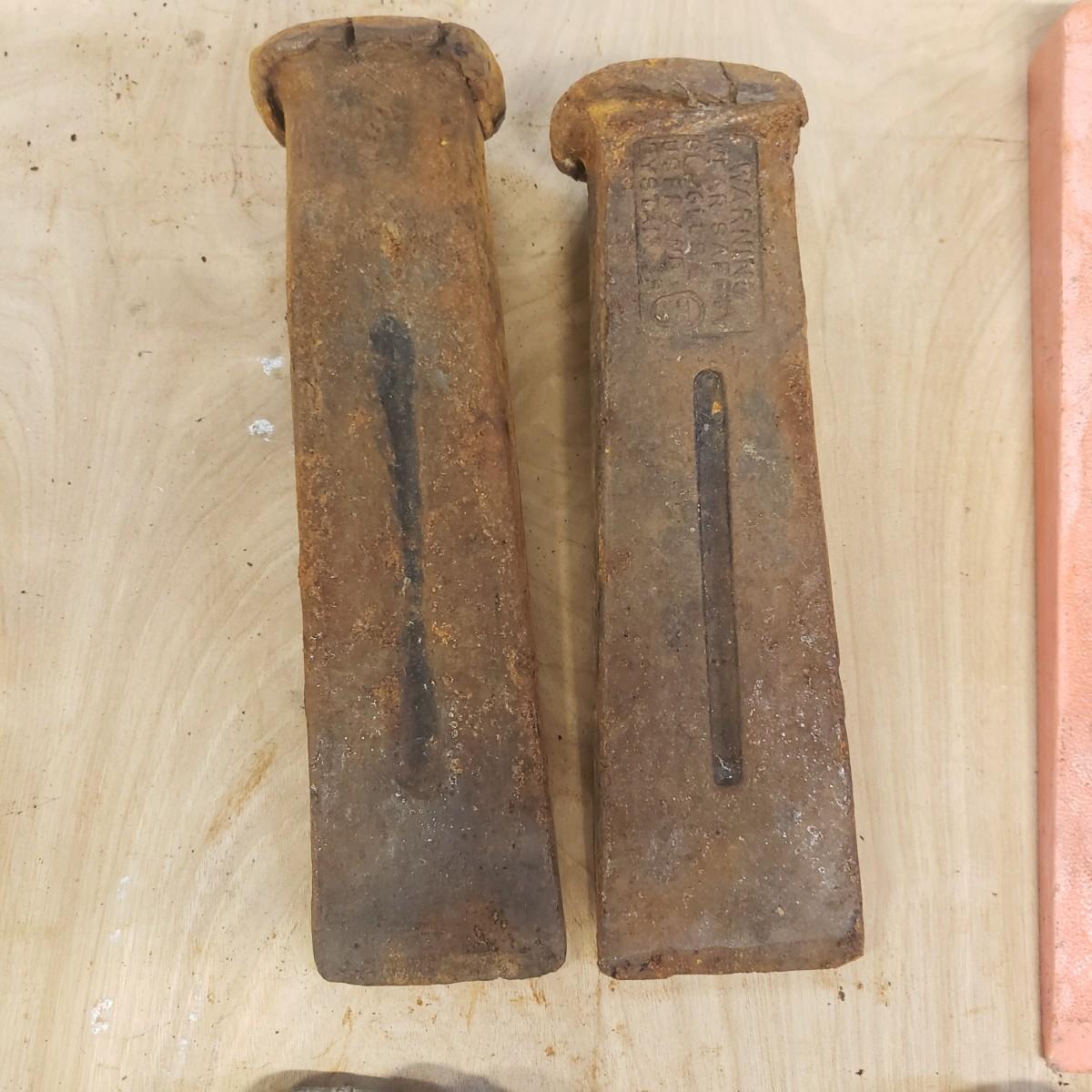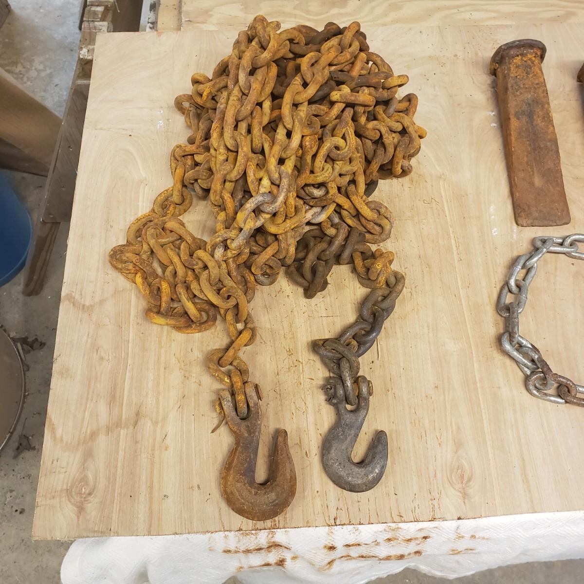 This lot has key locks, that all work when the key is turned. There is a vintage Royal lock made of brass. There are four splitting wedges, three are metal and one is plastic by Woodys, see pictures. There is one long chain with a hook on each end. The small chain measures approximately 4'. The bucket with all items is very heavy.