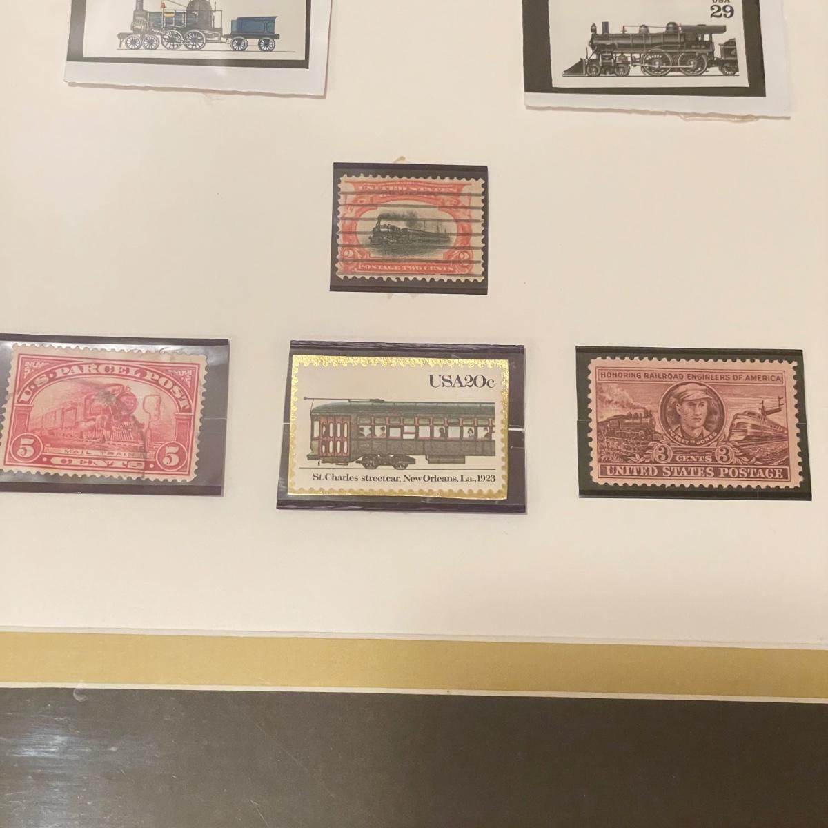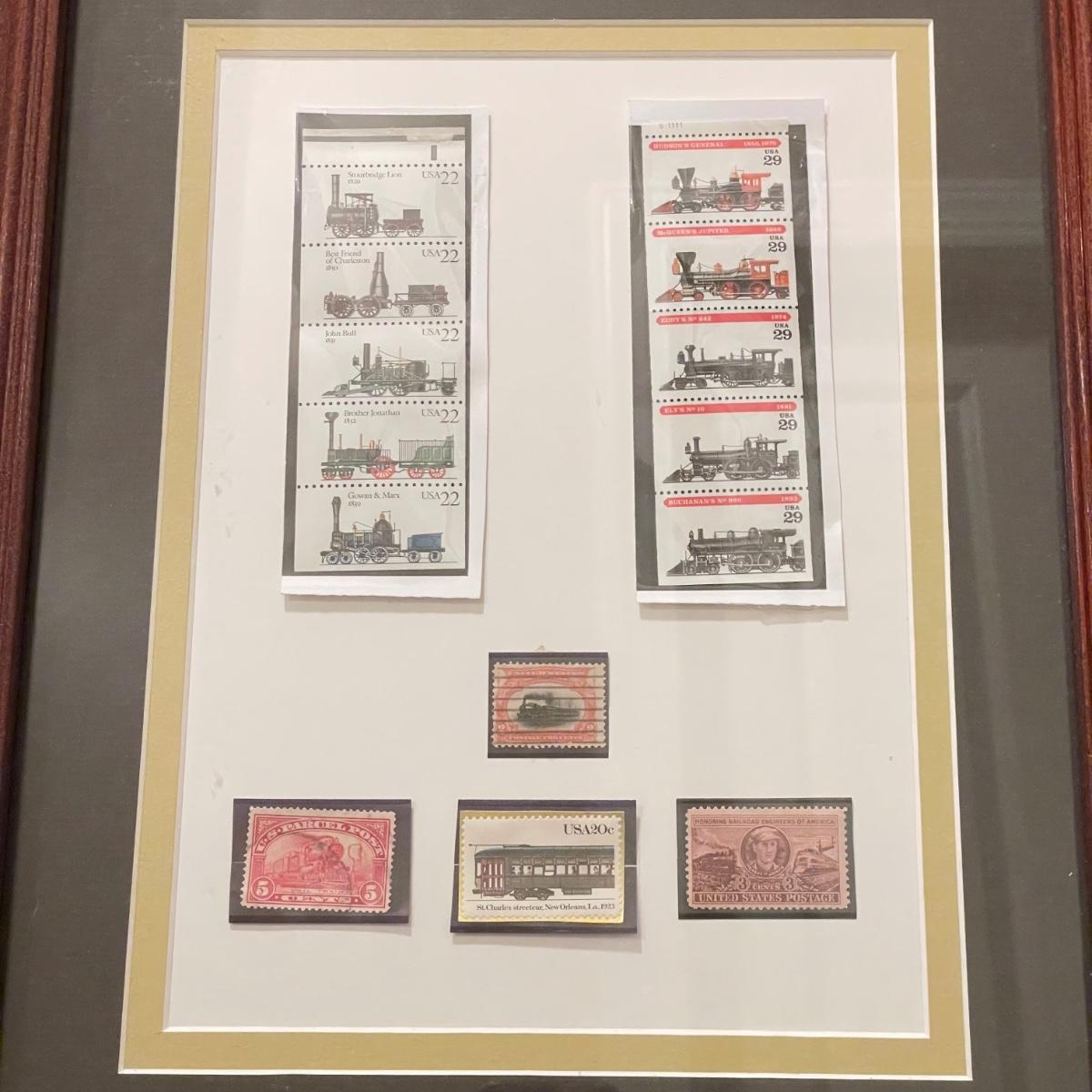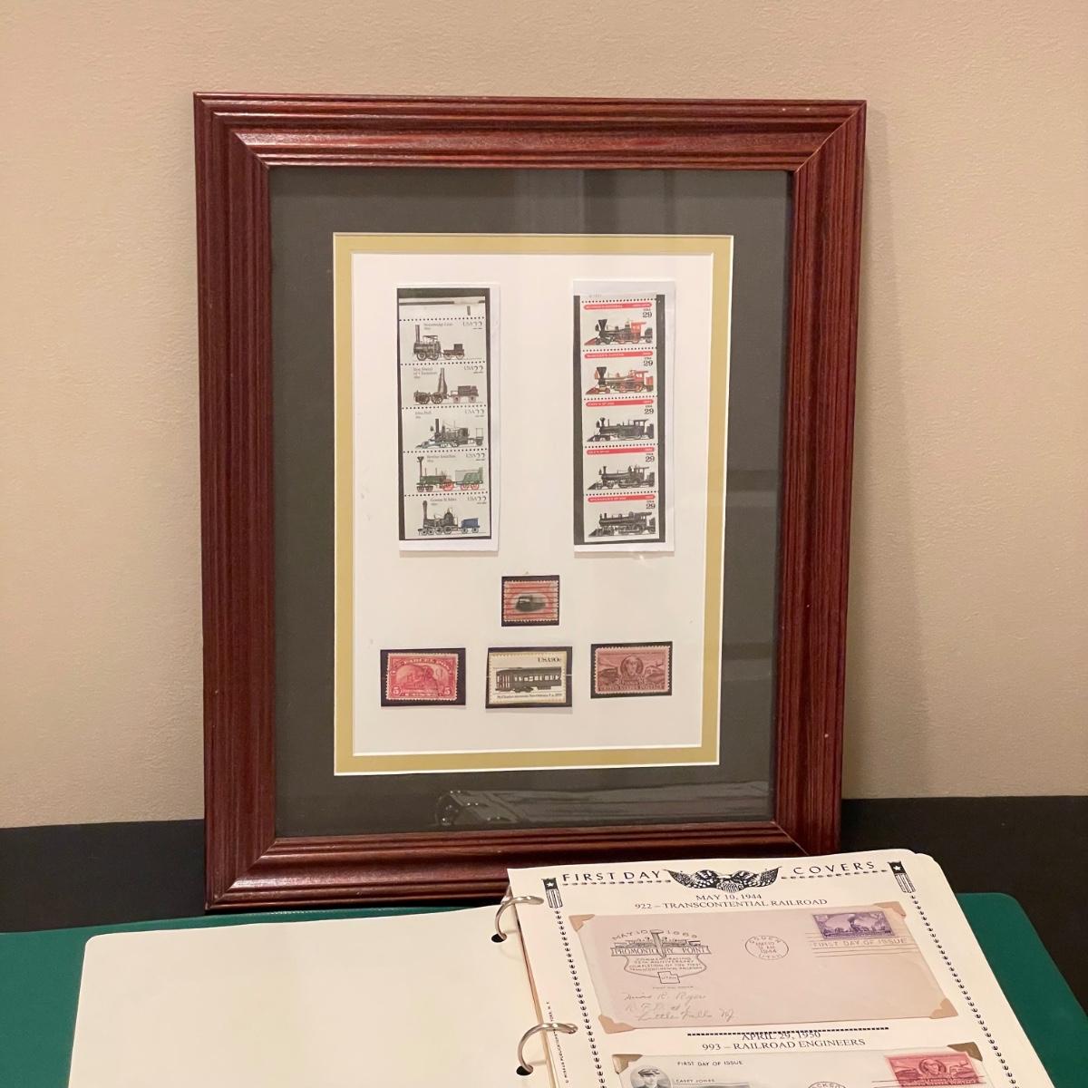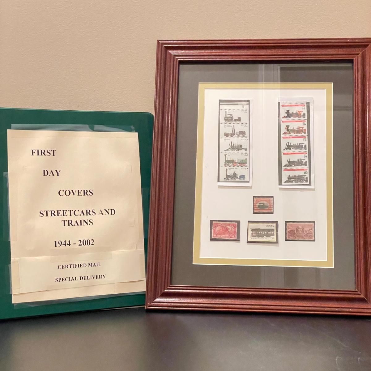 Professionally framed stamps placed behind glass in a wood frame measuring 13.25” x 16”H. Green 1.5” binder is mostly full of a variety of First Day Issues covering streetcars and railroad stamps. All sales are final. No returns or refunds. Please bid accordingly. Shipping available.