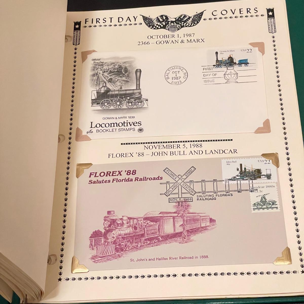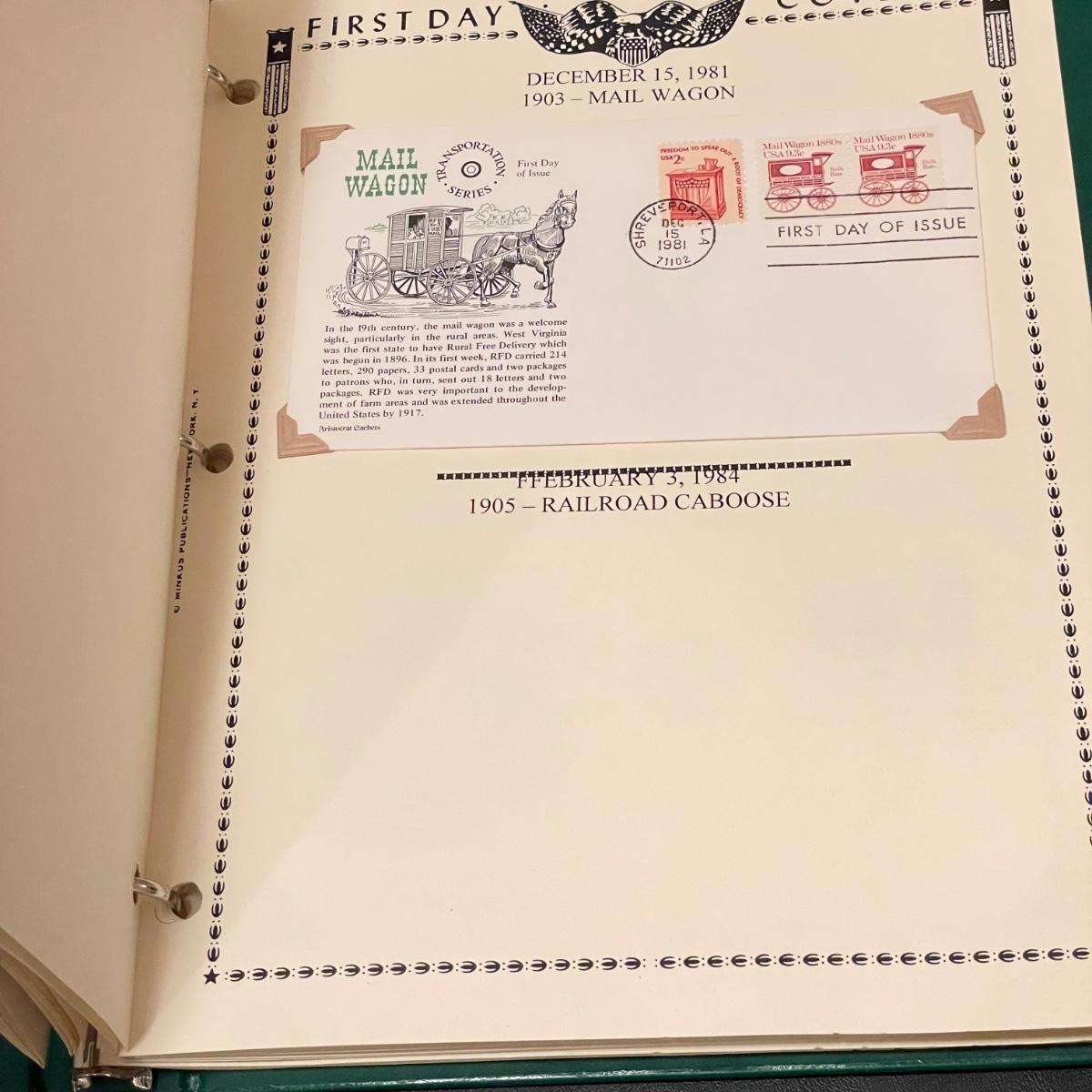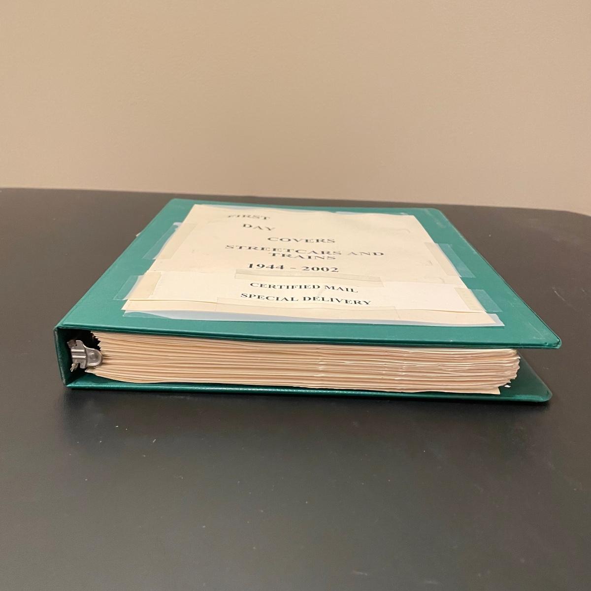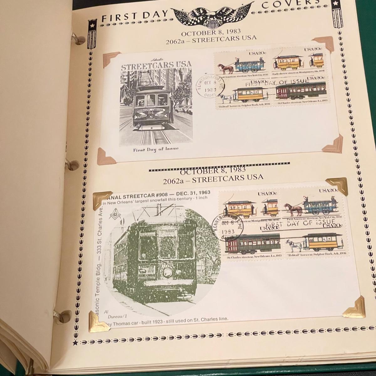 Professionally framed stamps placed behind glass in a wood frame measuring 13.25” x 16”H. Green 1.5” binder is mostly full of a variety of First Day Issues covering streetcars and railroad stamps. All sales are final. No returns or refunds. Please bid accordingly. Shipping available.