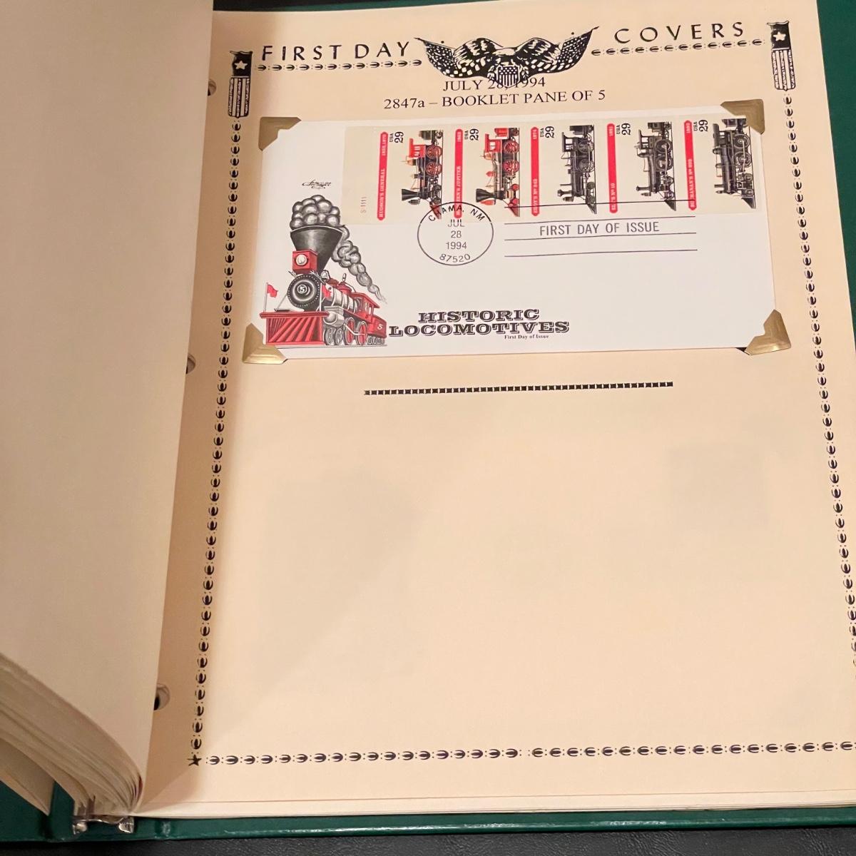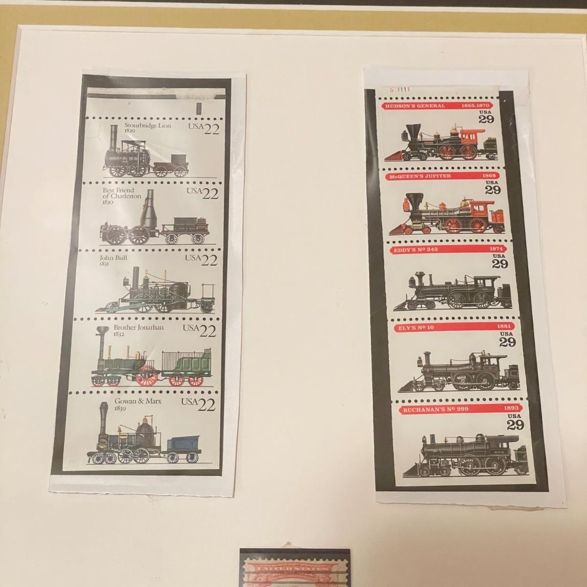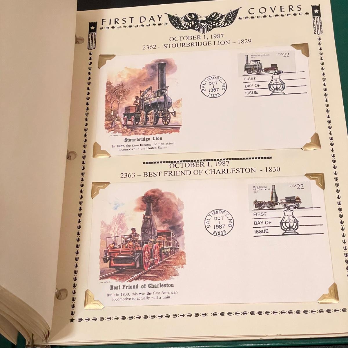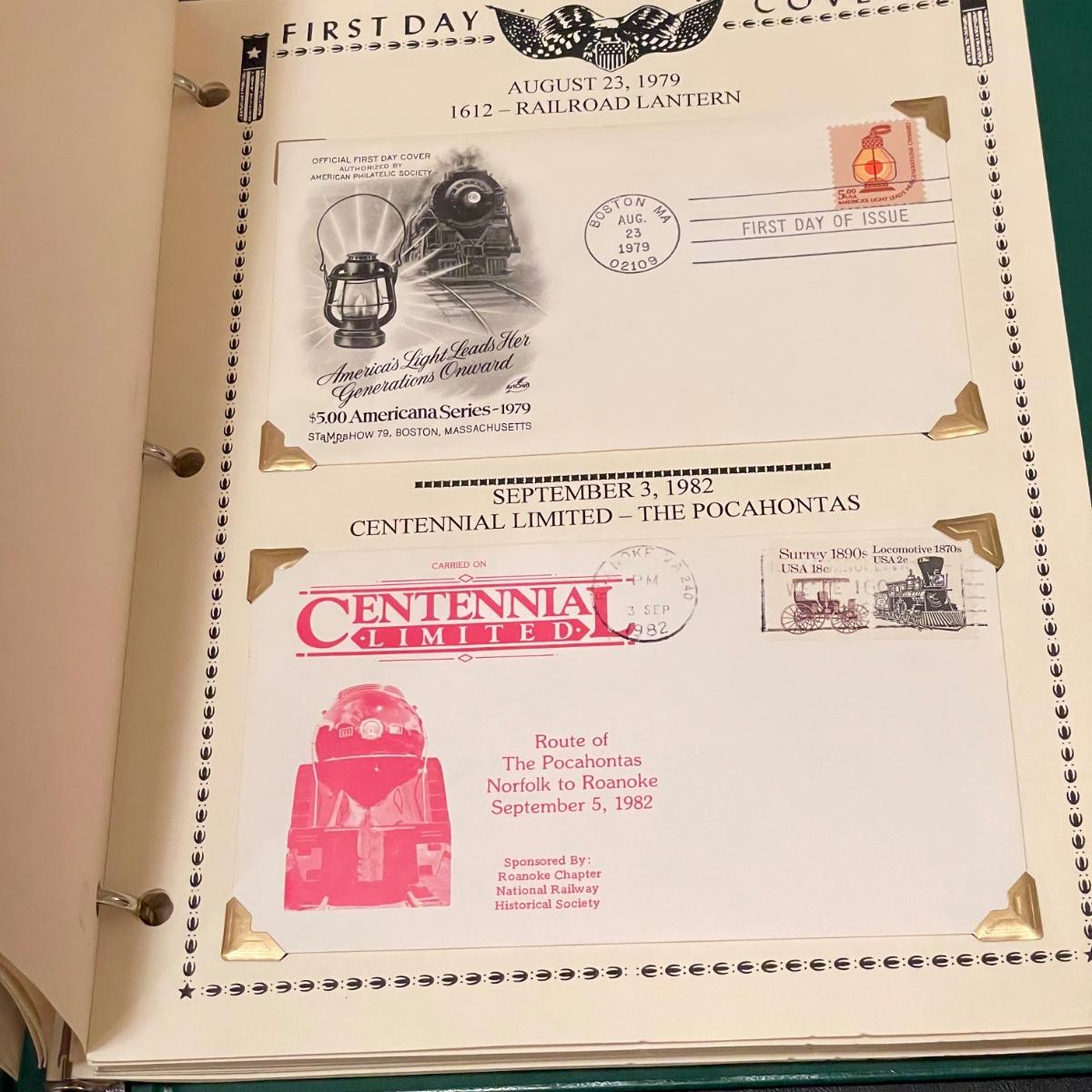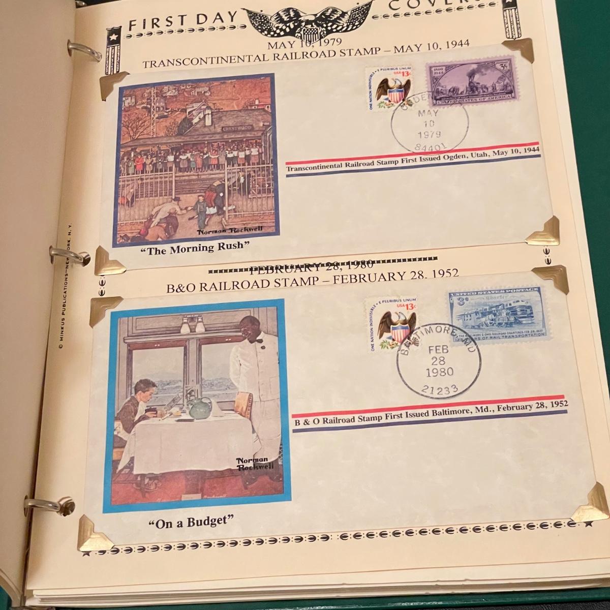 Professionally framed stamps placed behind glass in a wood frame measuring 13.25” x 16”H. Green 1.5” binder is mostly full of a variety of First Day Issues covering streetcars and railroad stamps. All sales are final. No returns or refunds. Please bid accordingly. Shipping available.