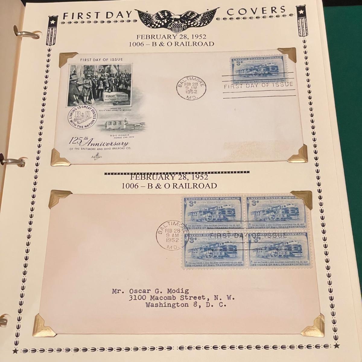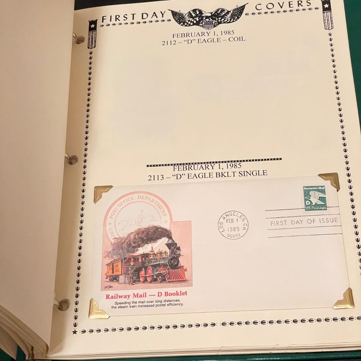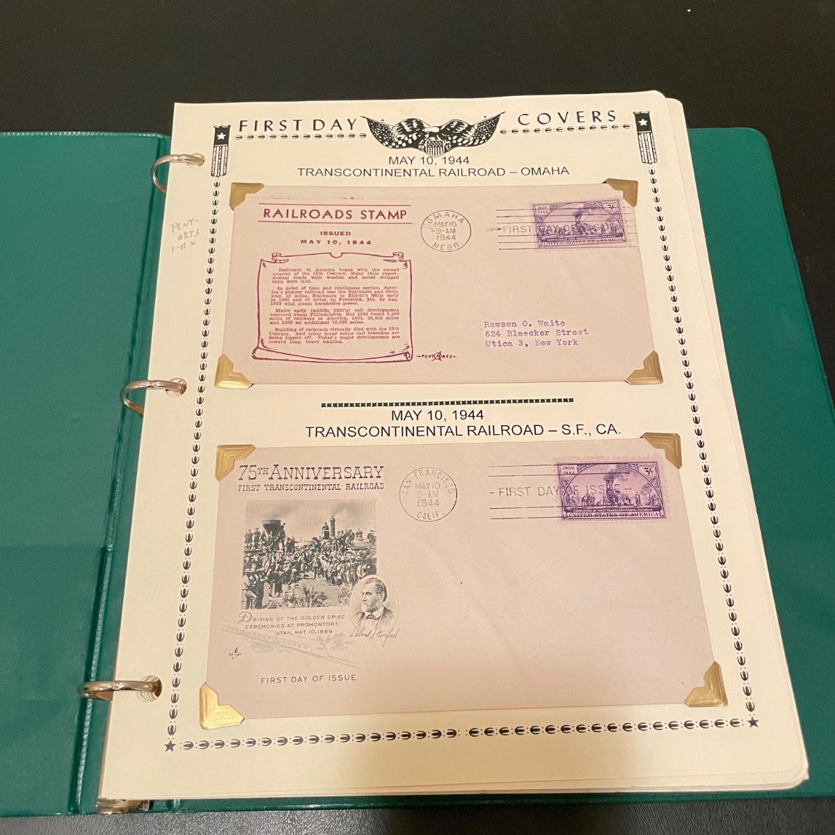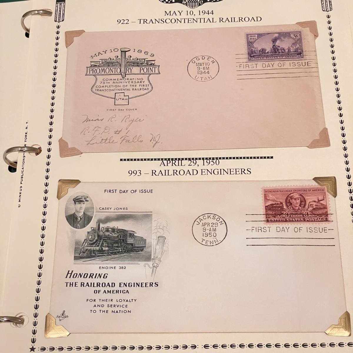 Professionally framed stamps placed behind glass in a wood frame measuring 13.25” x 16”H. Green 1.5” binder is mostly full of a variety of First Day Issues covering streetcars and railroad stamps. All sales are final. No returns or refunds. Please bid accordingly. Shipping available.