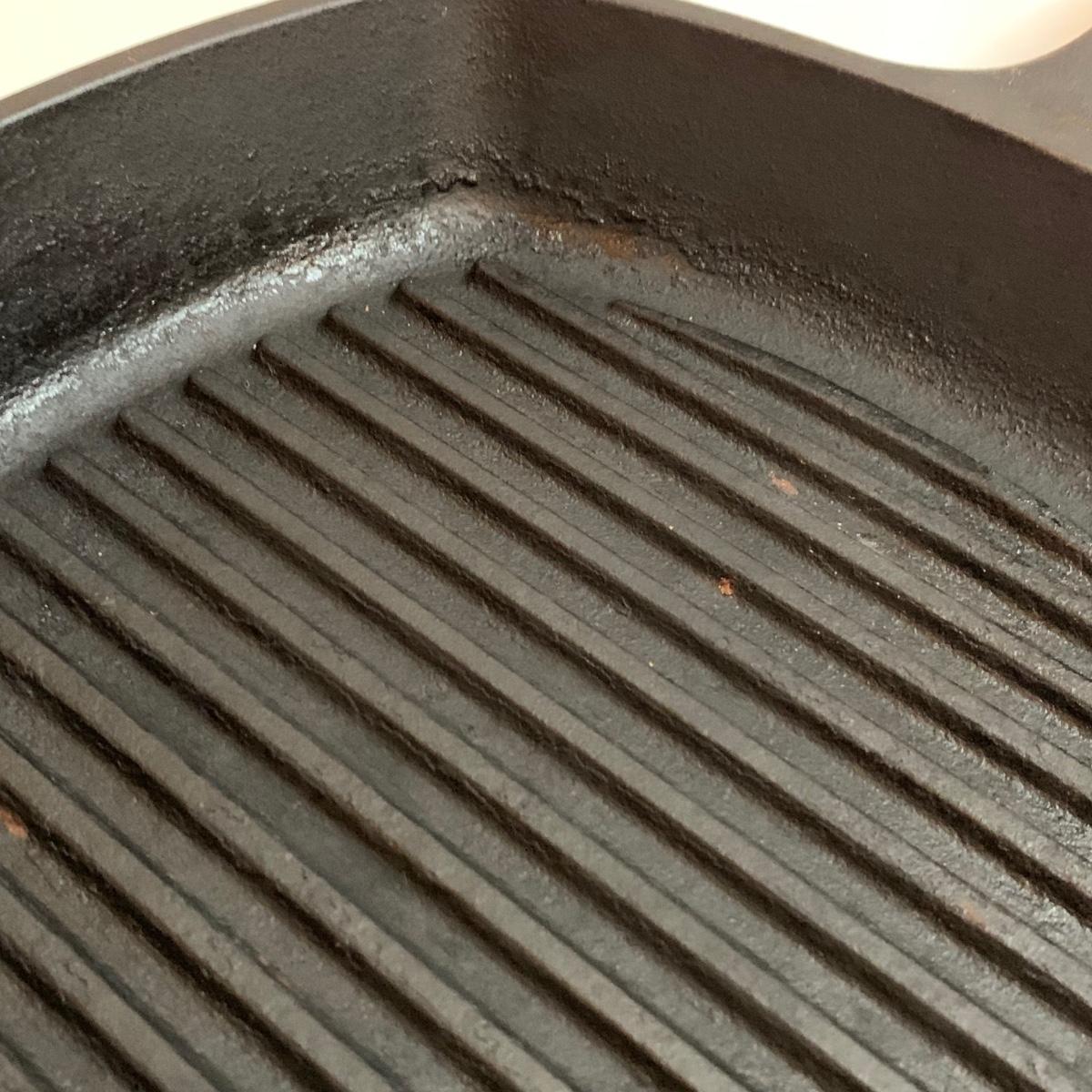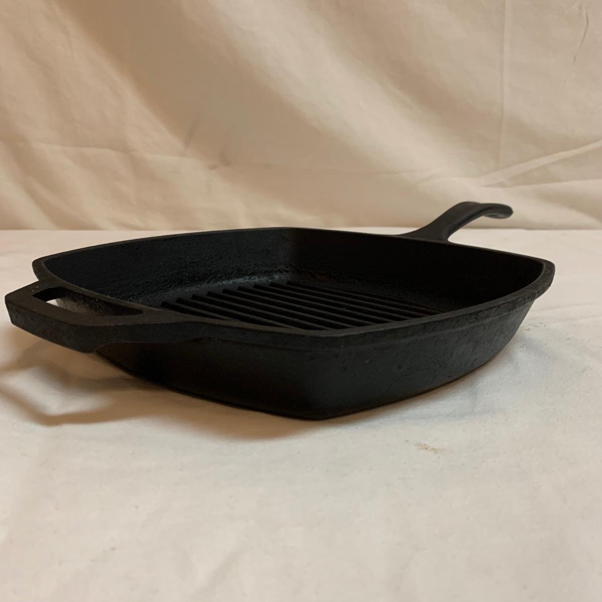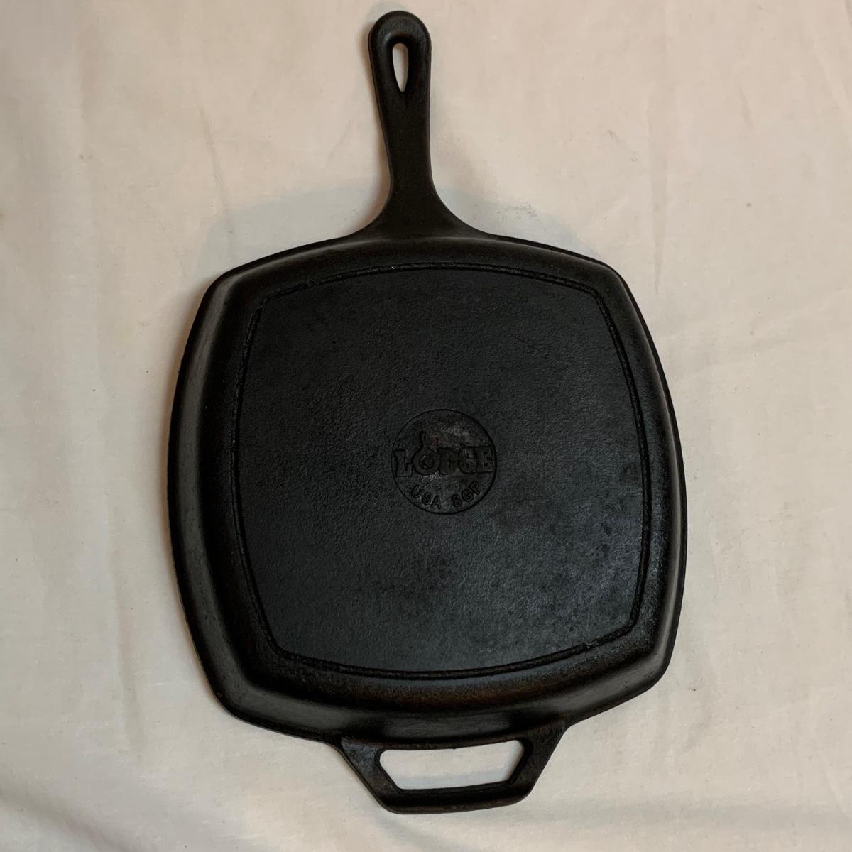Lodge brand 10.5” square cast iron grill pan. Item has signs of use, but no rust.