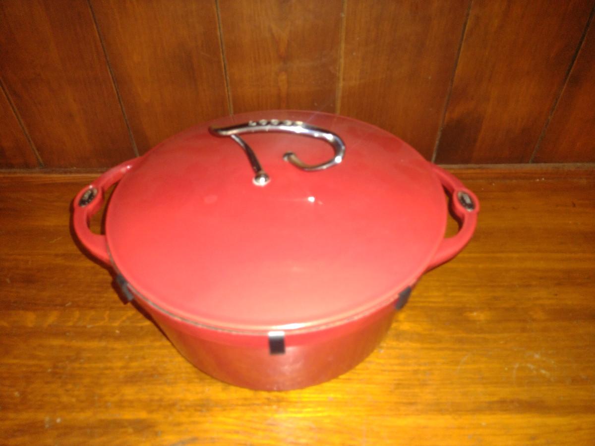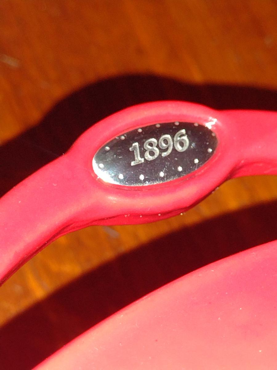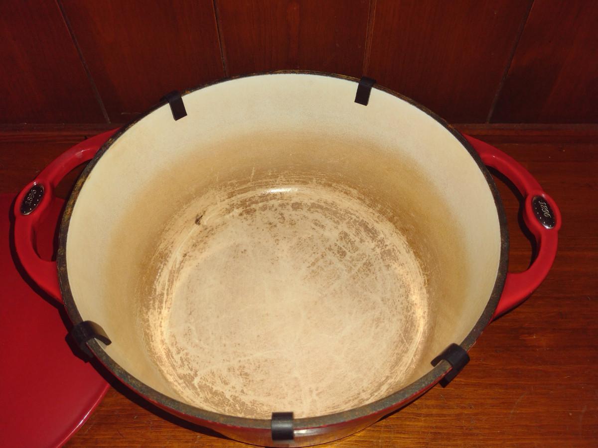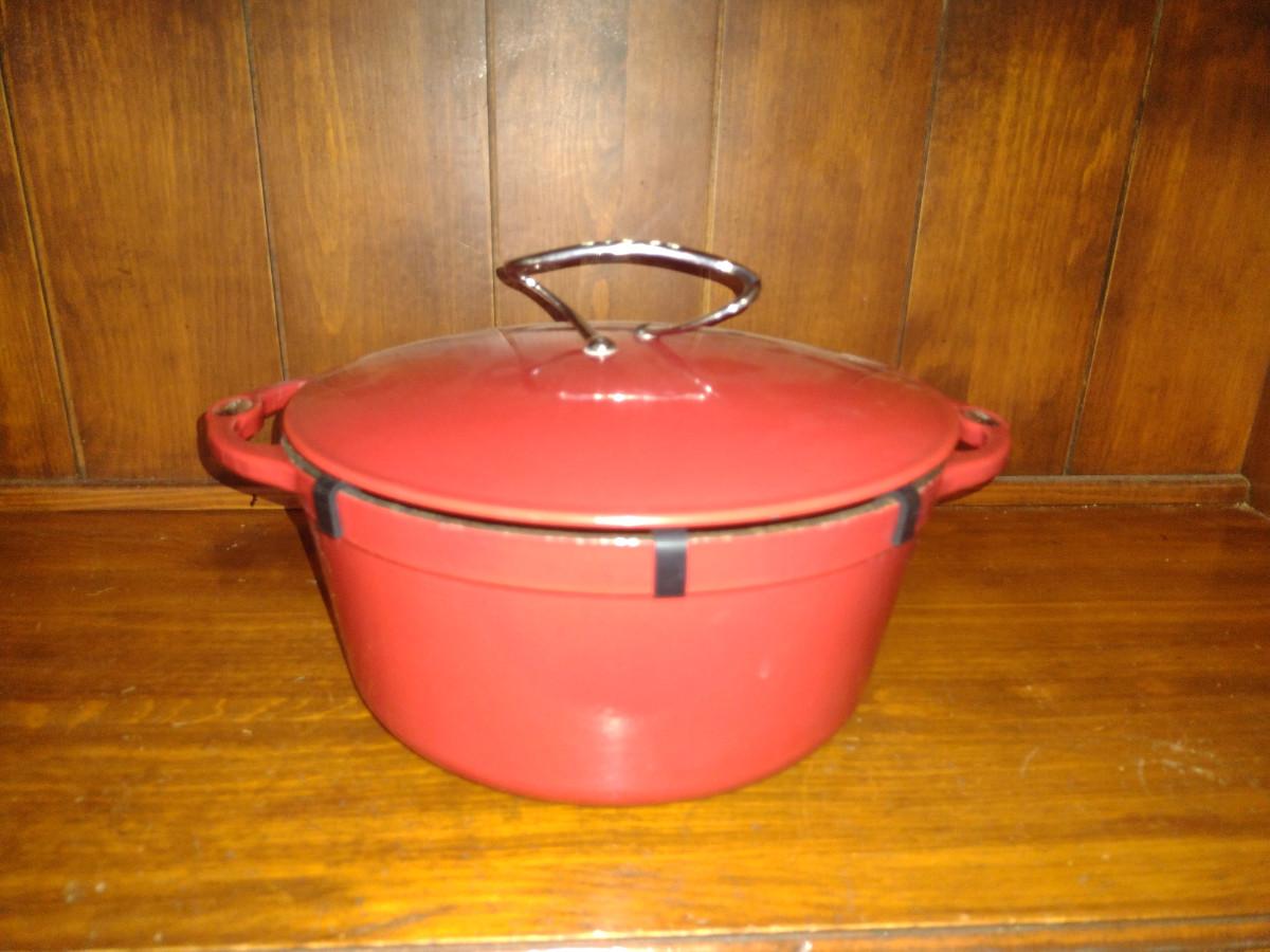 Lodge 1896 Enamel on Cast Iron Covered Dutch Oven- 6 Quart Capacity. Item is in used condition and has some discoloration and some chipping. Please see all pictures for condition.