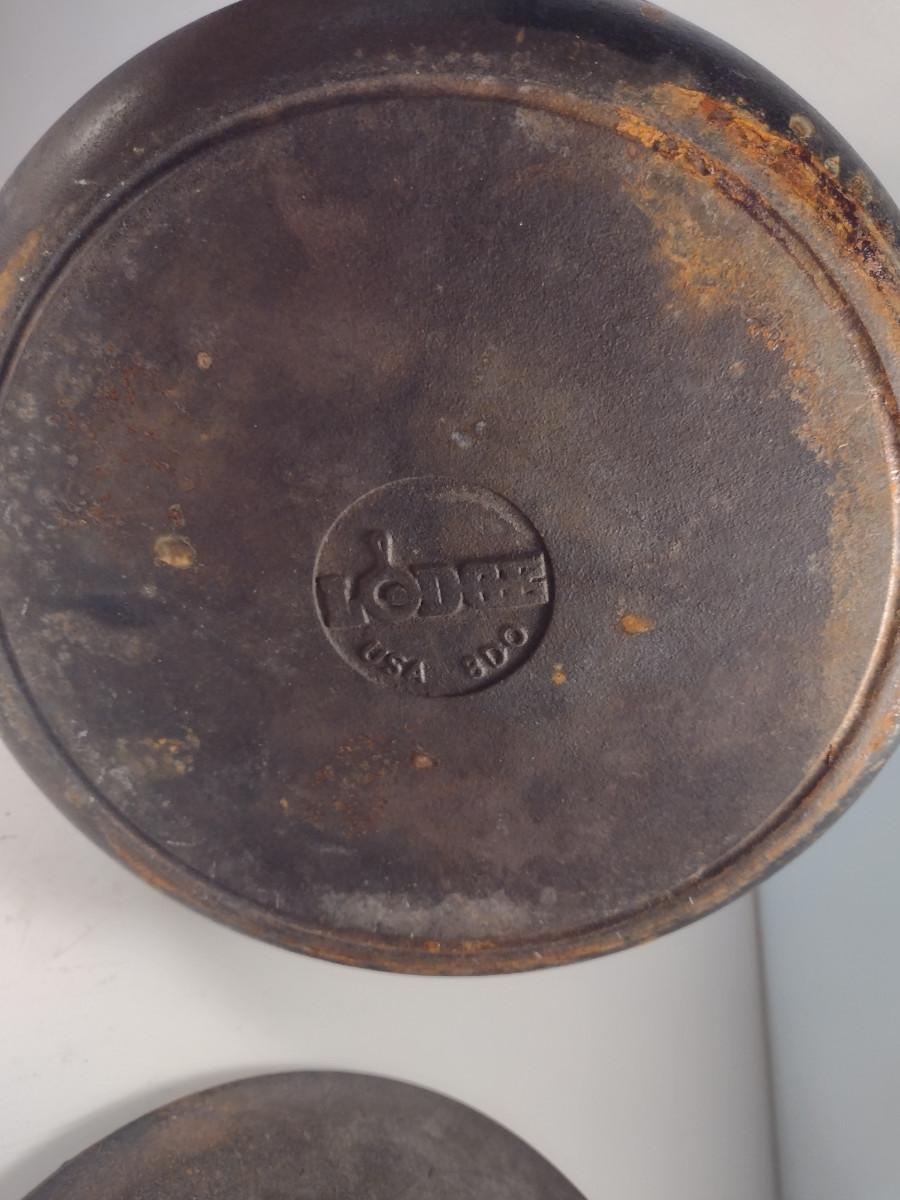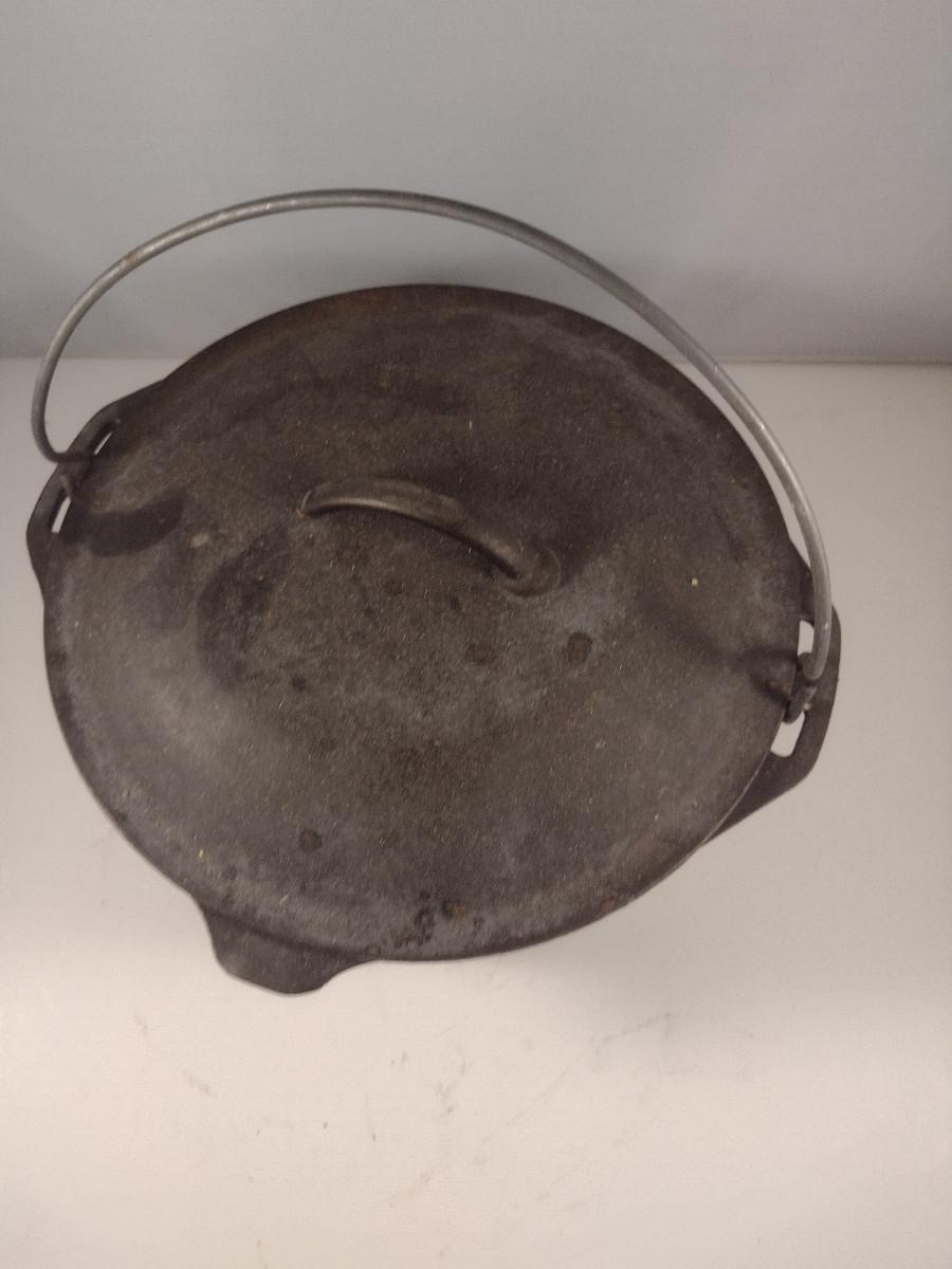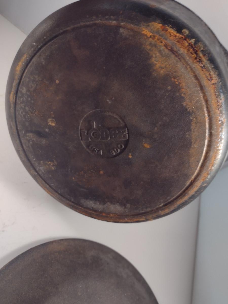 Lodge Cast Iron Covered Dutch Oven- Approx 10 1/2" in Diameter, 4" Deep. Please see all pictures regarding condition of finish.