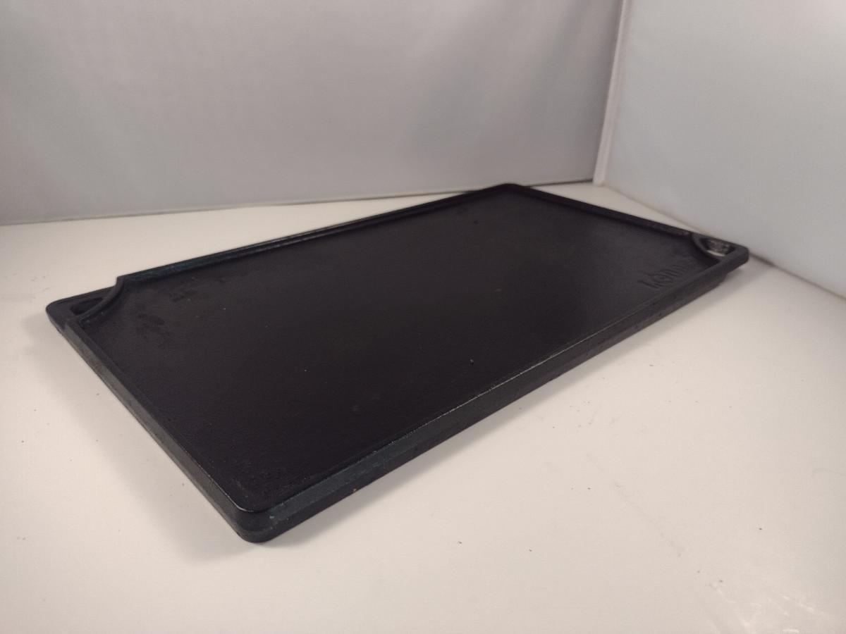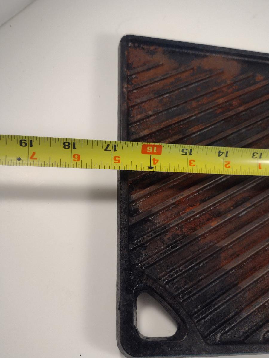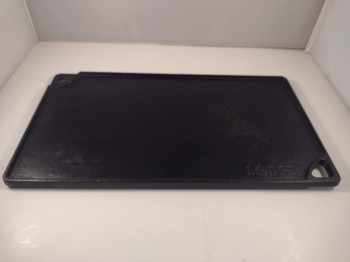 Lodge Cast Iron Square Griddle Pan. One side is flat, one is raised with grill lines. Measures approx 17" x 9 1/2". Please see all pictures- some rust and may need to be seasoned.