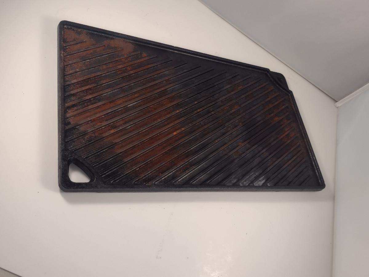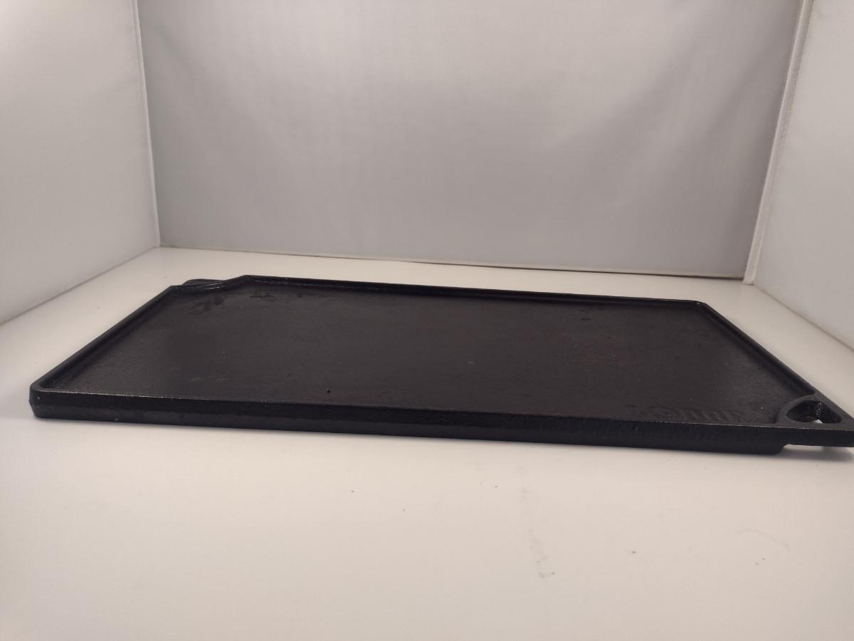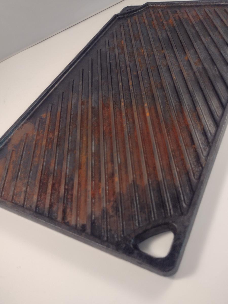 Lodge Cast Iron Square Griddle Pan. One side is flat, one is raised with grill lines. Measures approx 17" x 9 1/2". Please see all pictures- some rust and may need to be seasoned.