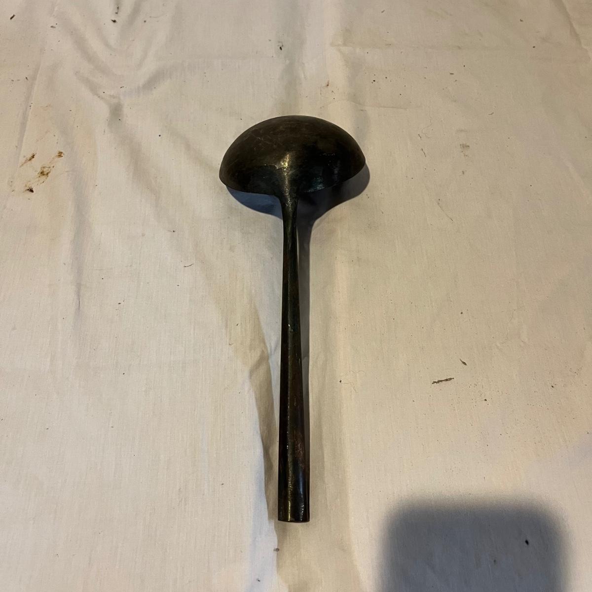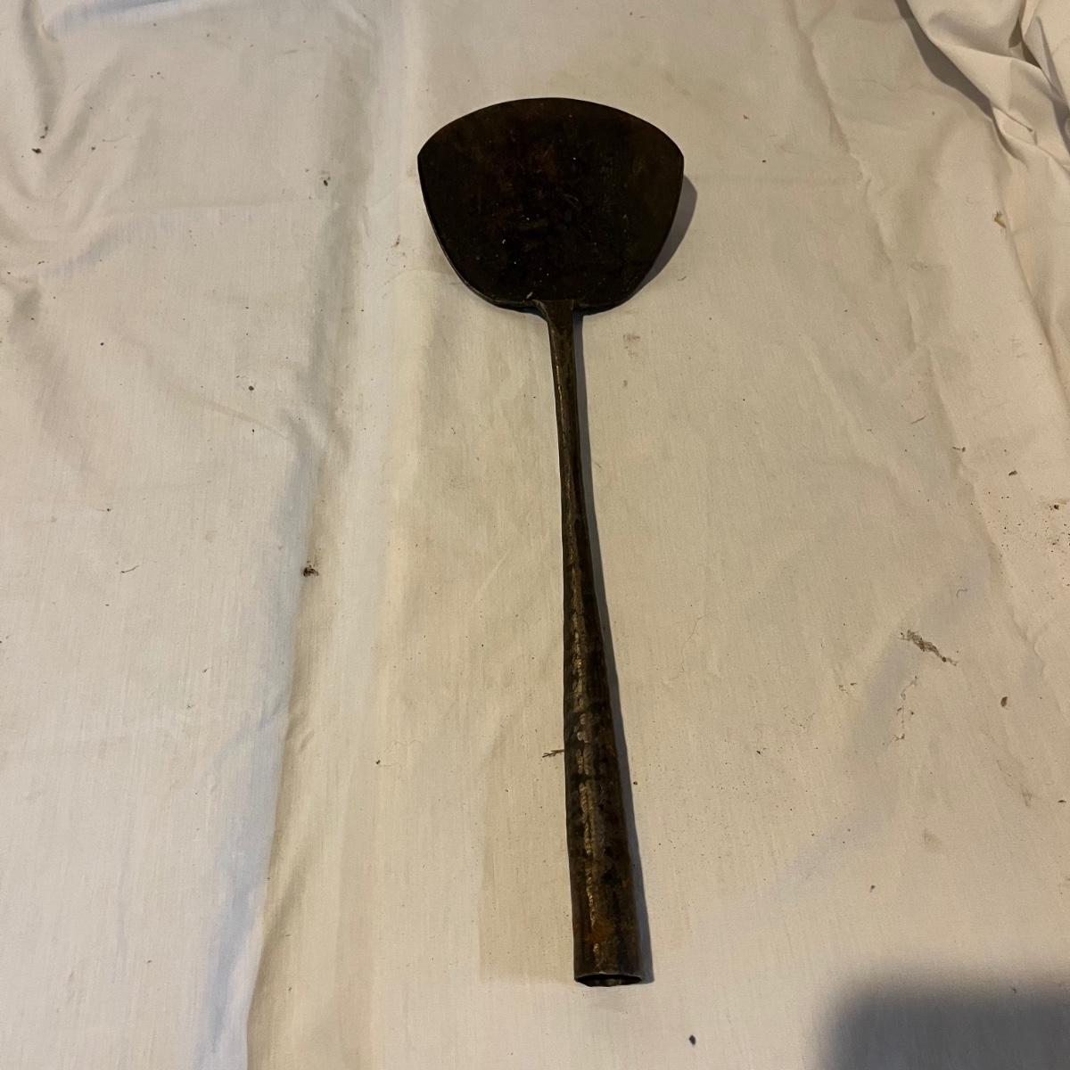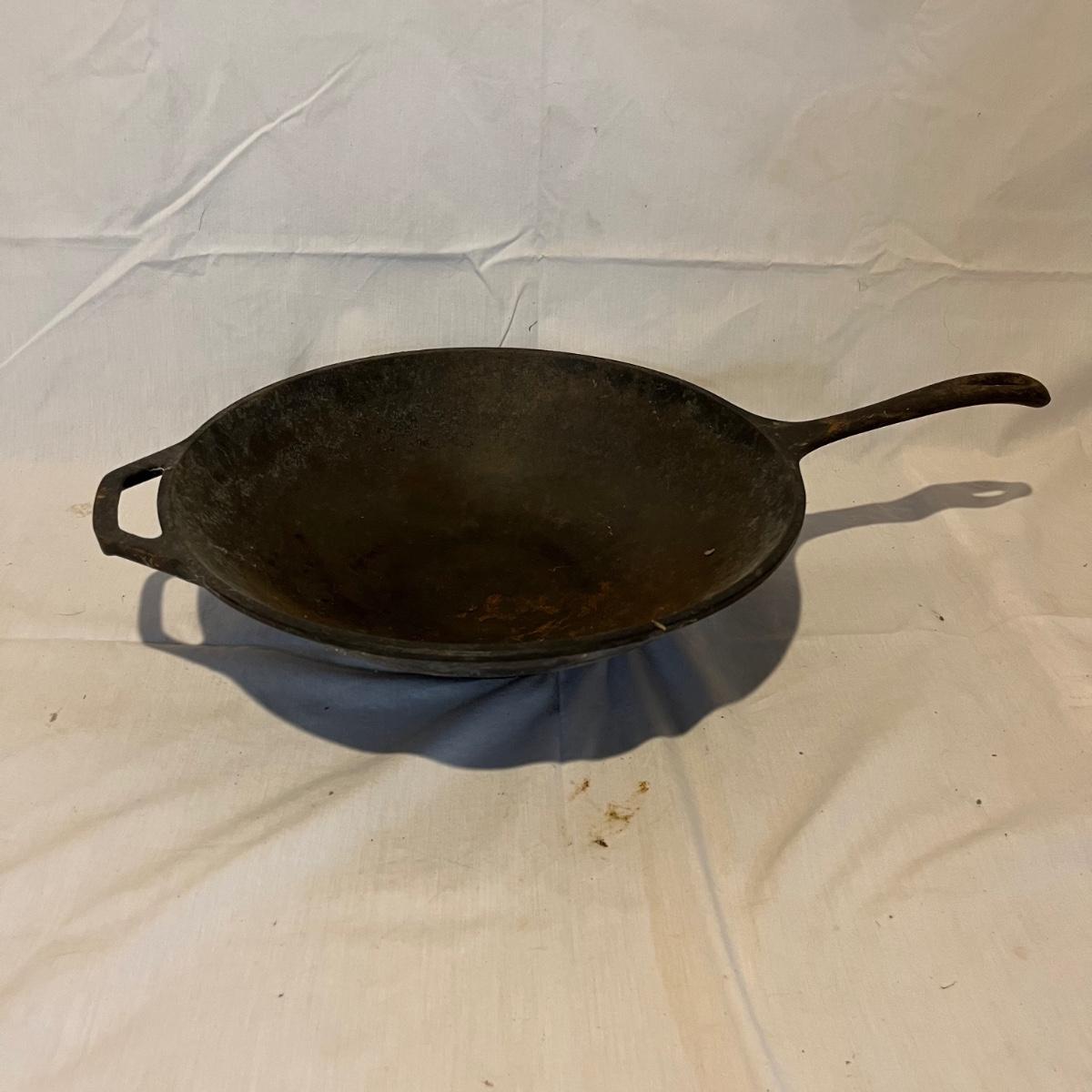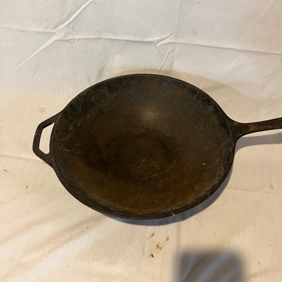 Lot includes a Lodge Cast iron wok, metal ladle and spatula and a metal pot with BB and a wooden handle. Wok measures 13”D x 3.5” tall not counting handles. All need to be reasoned.