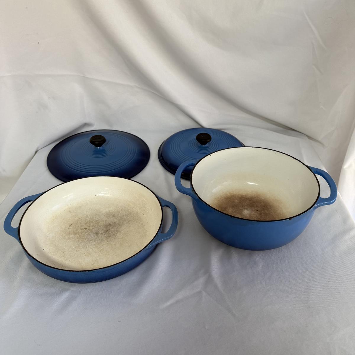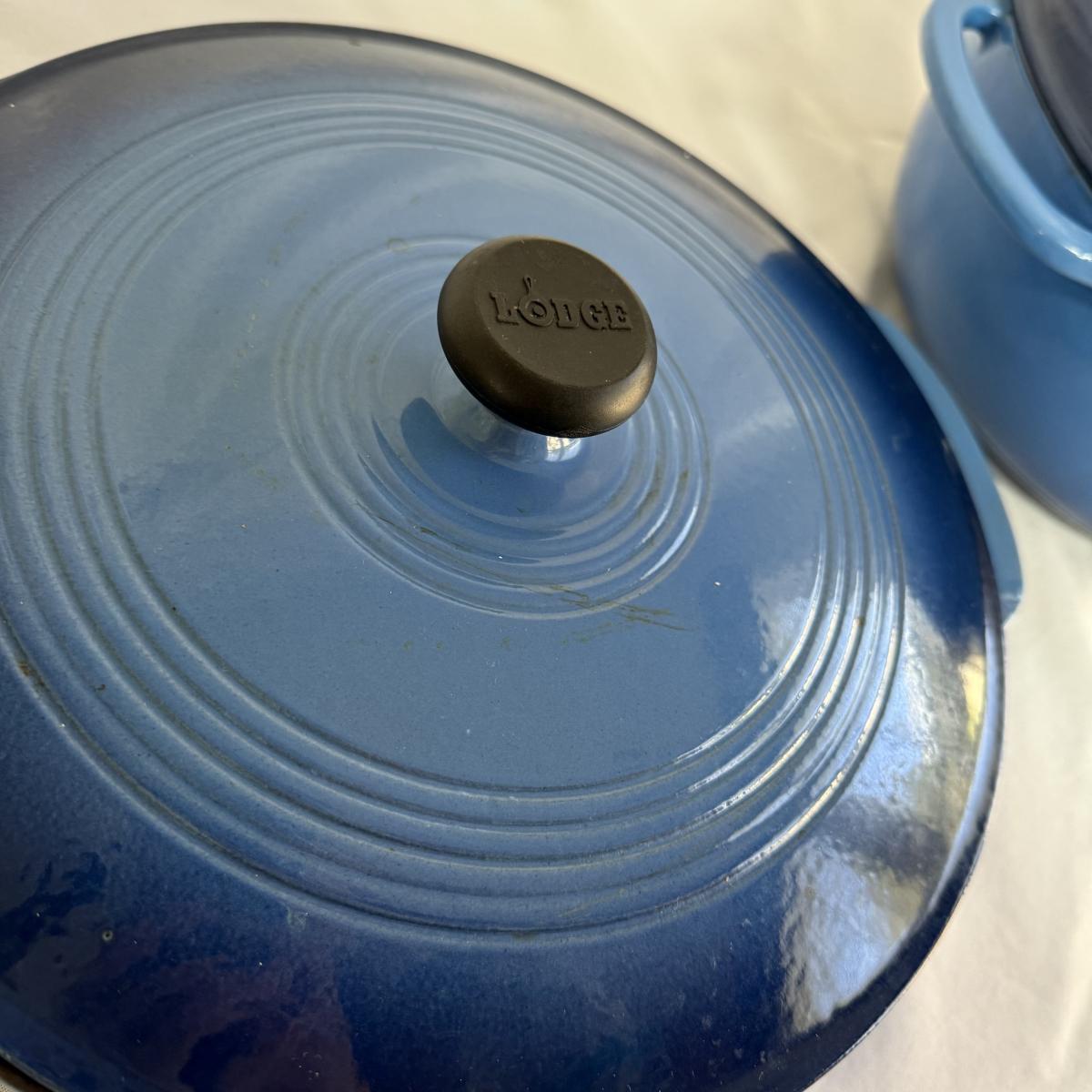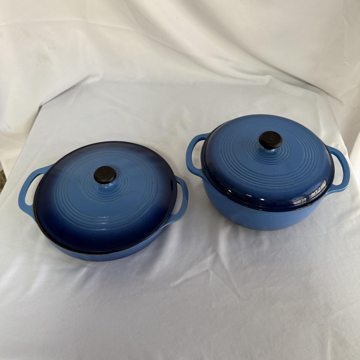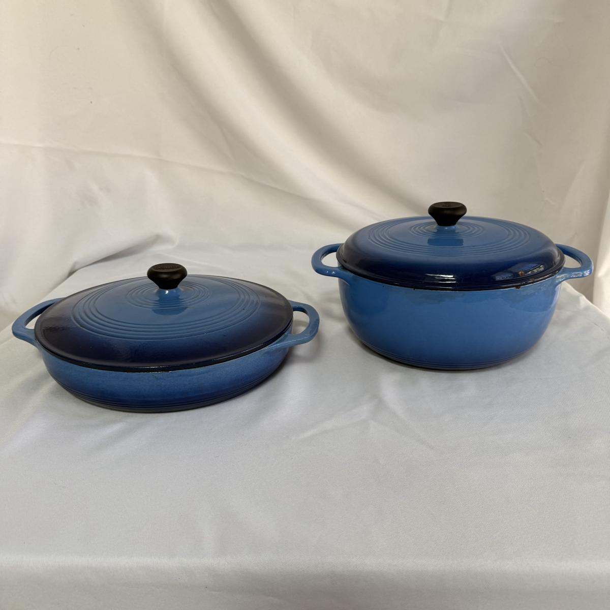 This lot contains a Lodge enameled casserole and a matching Dutch oven. Both the casserole and the Dutch oven come with their own lids and are a matching blue. The casserole dish has a handle on each side and measures 11”D and 2.5”H and holds two and a half quarts. The Dutch oven also has a handle on both sides and measures 10.5”D and 4.75”H and holds six quarts. Both show a bit of wear inside.