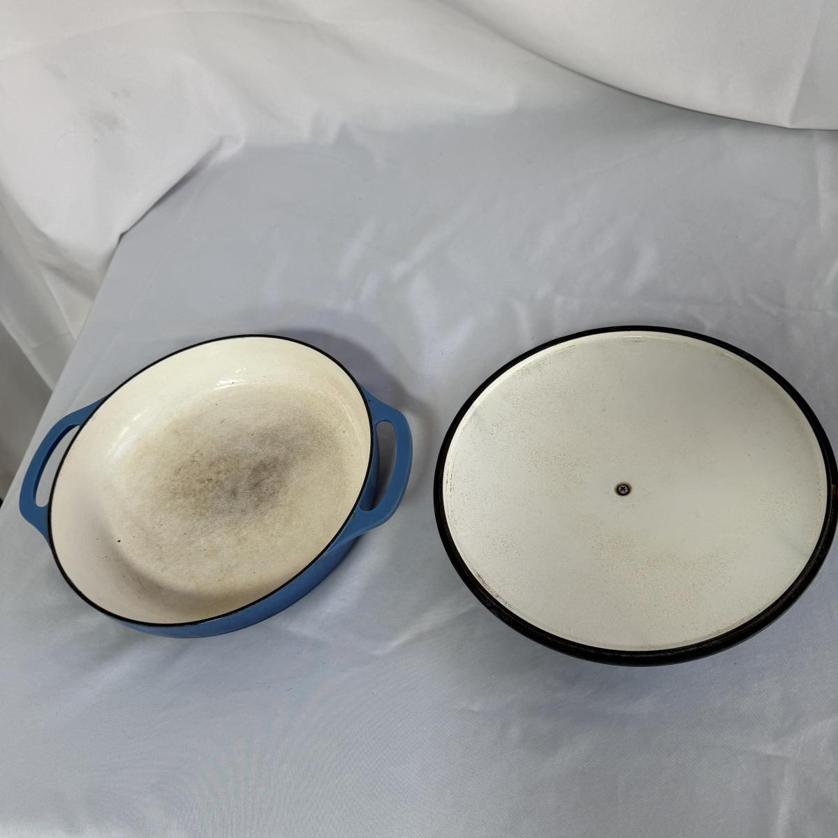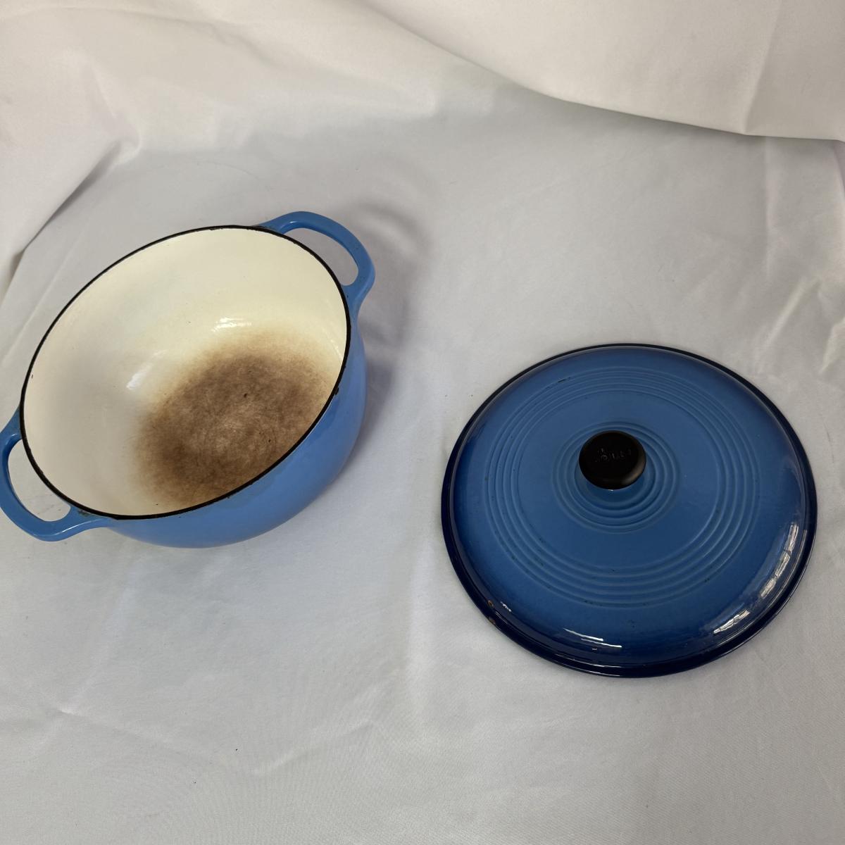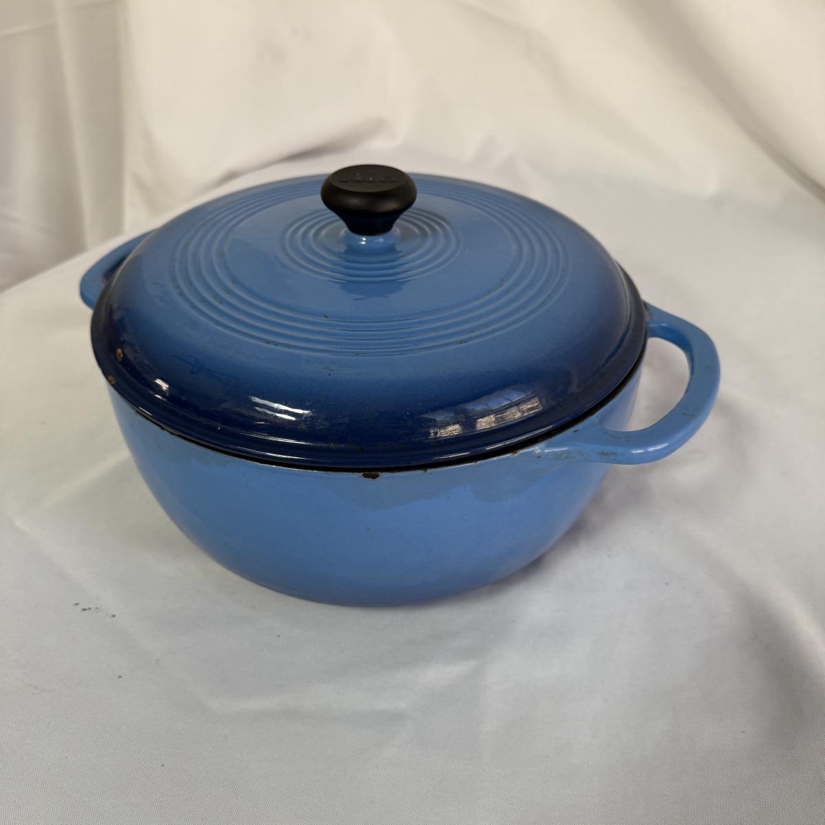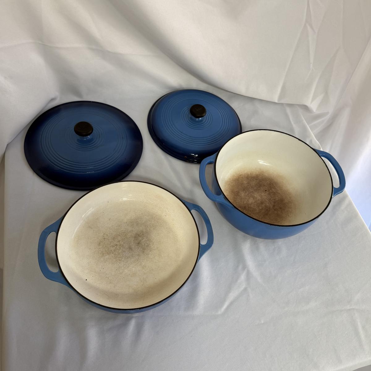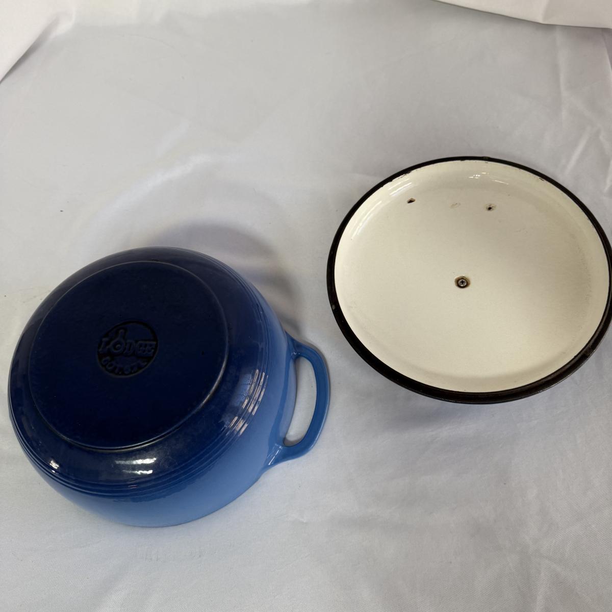This lot contains a Lodge enameled casserole and a matching Dutch oven. Both the casserole and the Dutch oven come with their own lids and are a matching blue. The casserole dish has a handle on each side and measures 11”D and 2.5”H and holds two and a half quarts. The Dutch oven also has a handle on both sides and measures 10.5”D and 4.75”H and holds six quarts. Both show a bit of wear inside.