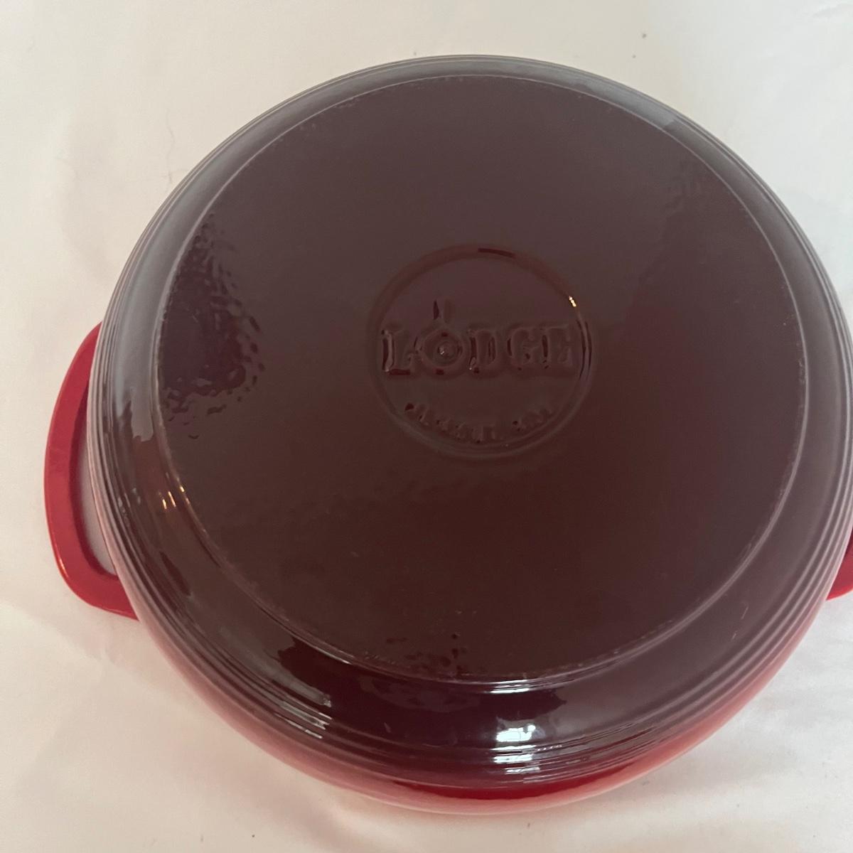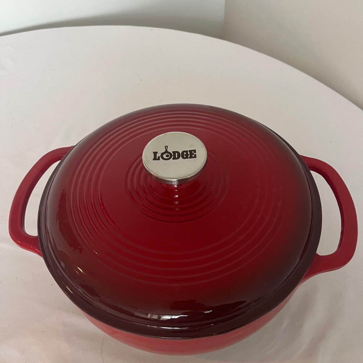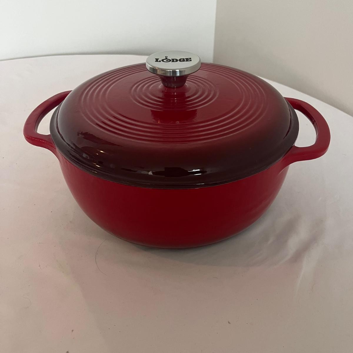 Lot includes a deep red colored Lodge enameled cast iron Dutch oven with lid. Piece is in good condition with some wear, see pictures. Oven measures 10”D x 4.5” tall not including lid.