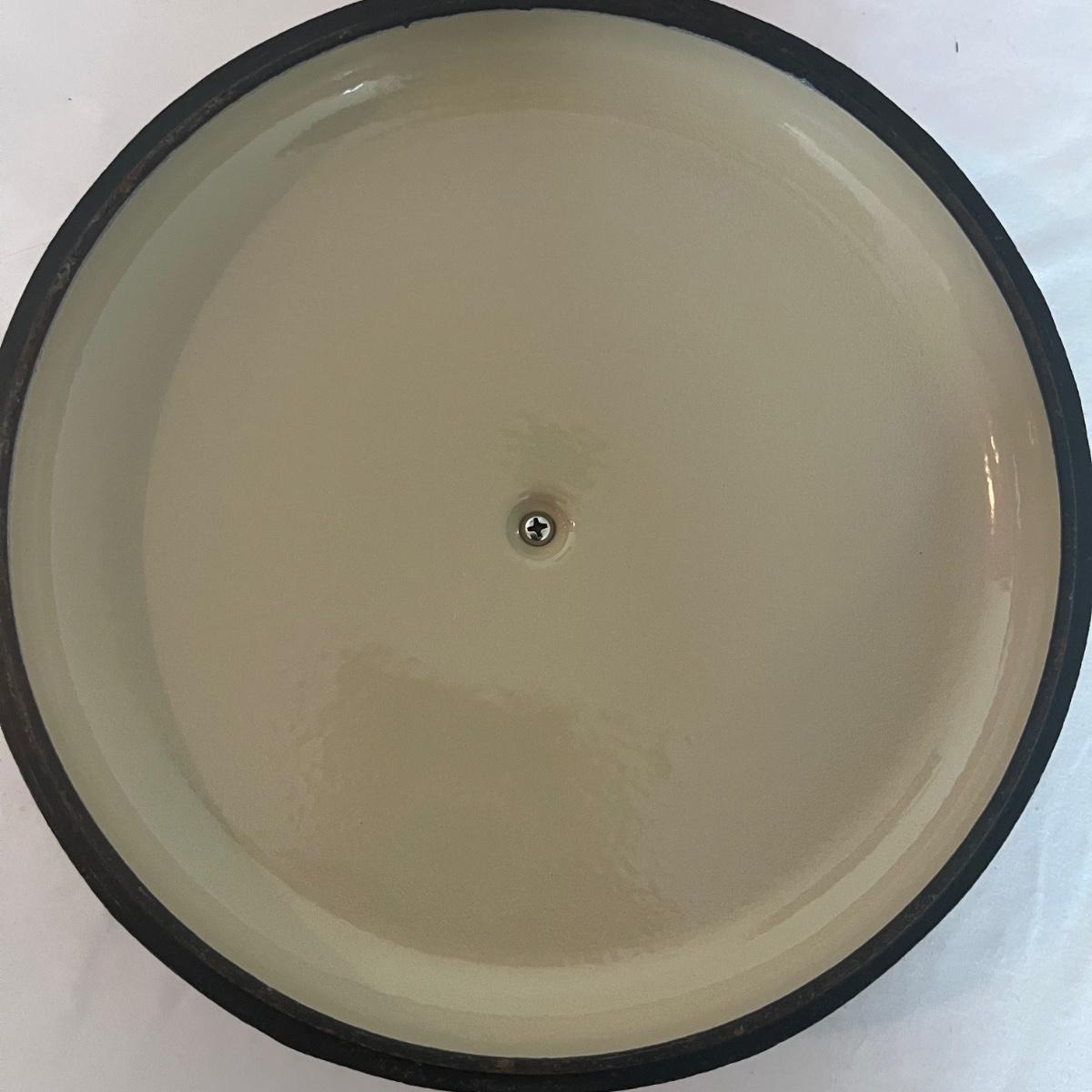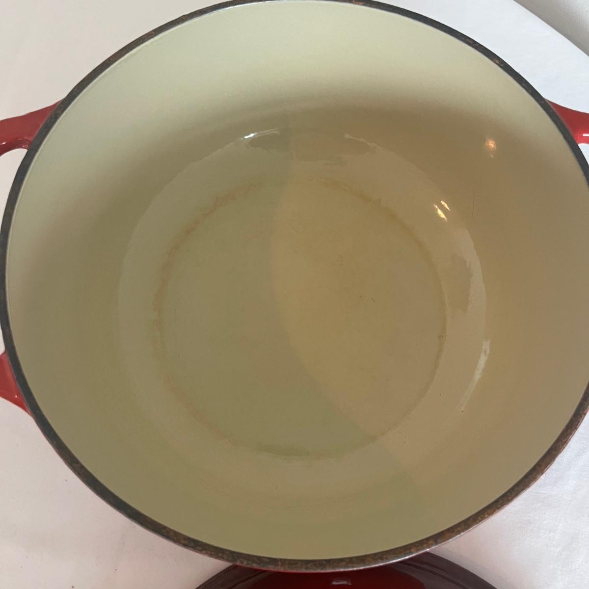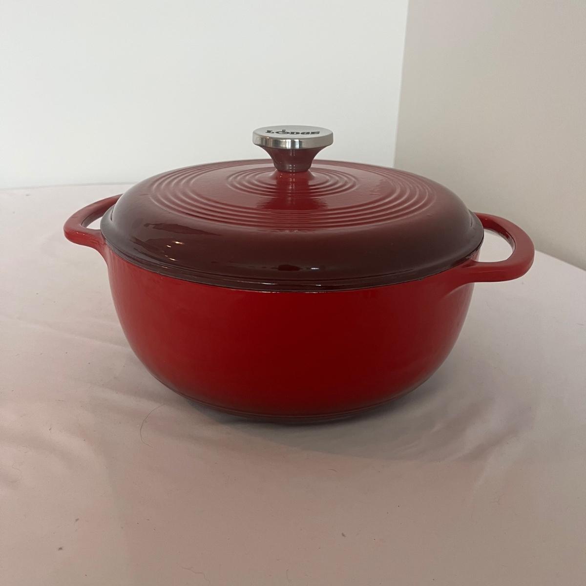 Lot includes a deep red colored Lodge enameled cast iron Dutch oven with lid. Piece is in good condition with some wear, see pictures. Oven measures 10”D x 4.5” tall not including lid.