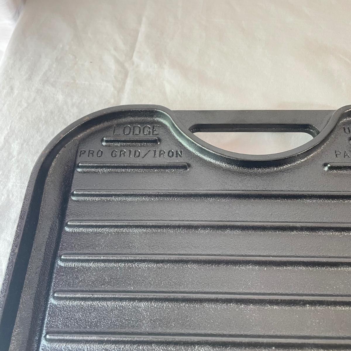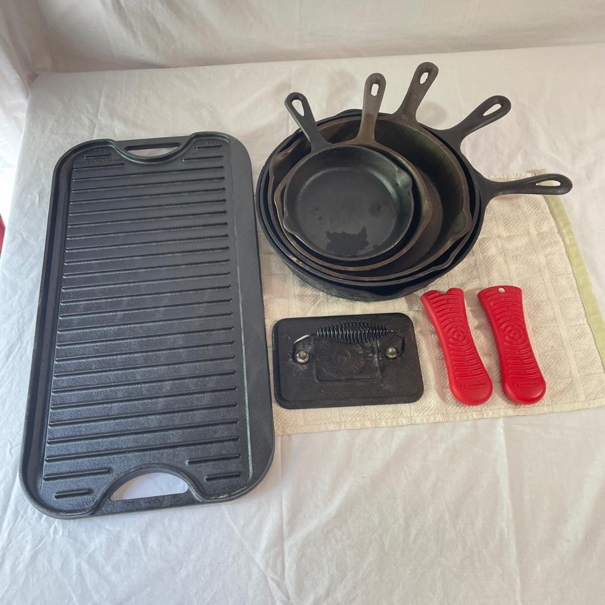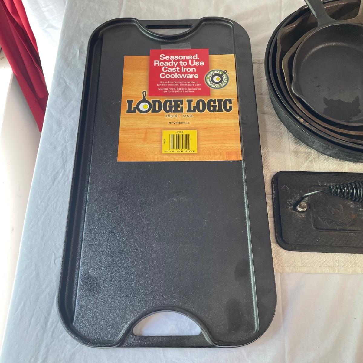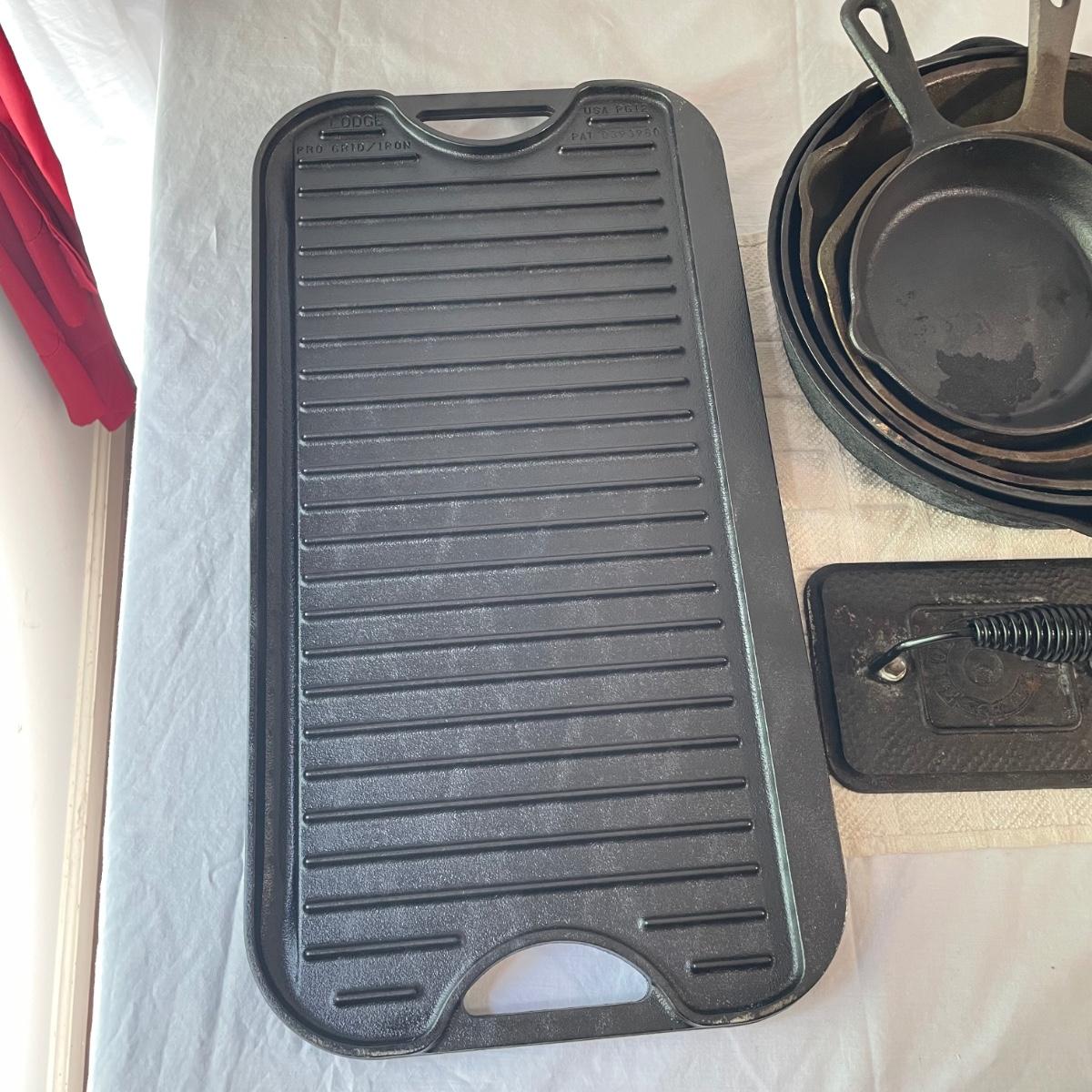 Cast iron cookware. Two burner Lodge Pro Grid Iron Griddle is reversible and measures 20” x 10.5”. Lot also contains five cast iron skillets ranging from 7”D to 12”D, two Le Creuset pan holders and a Lodge grill press. Largest pan has a decent amount of burnt residue. See images. Local pick up only.
