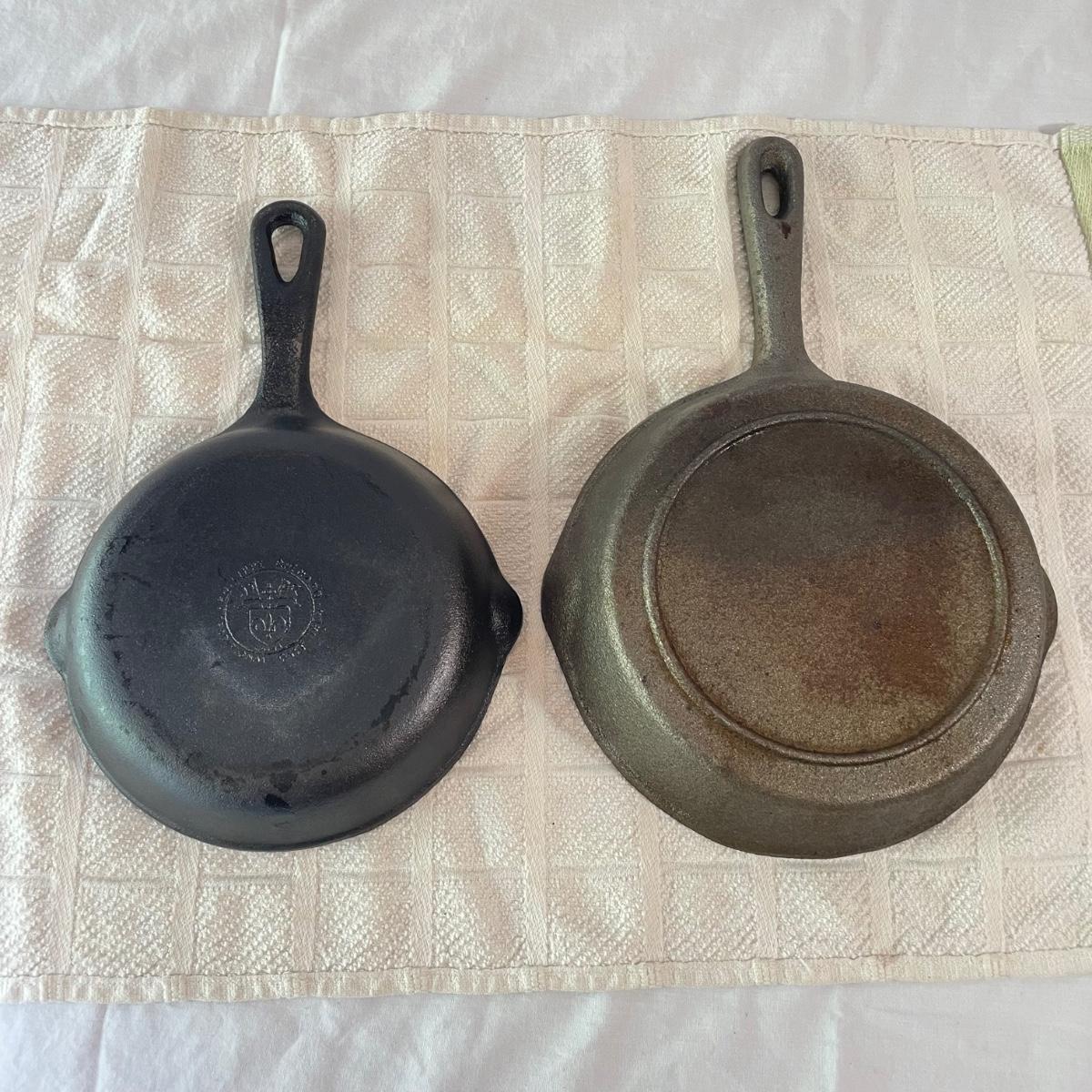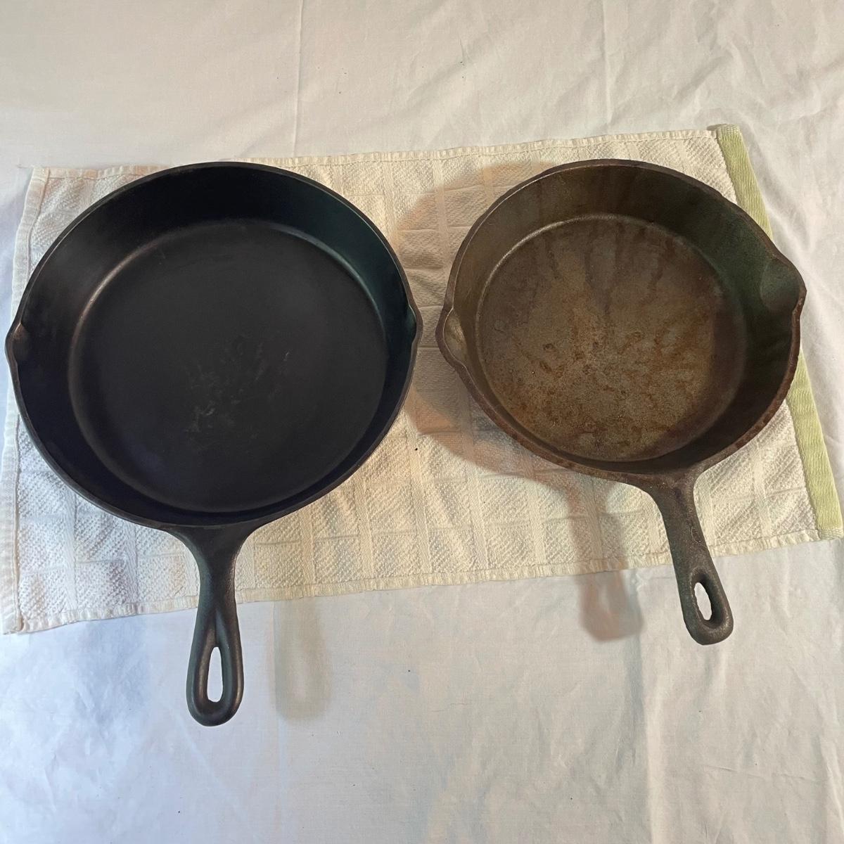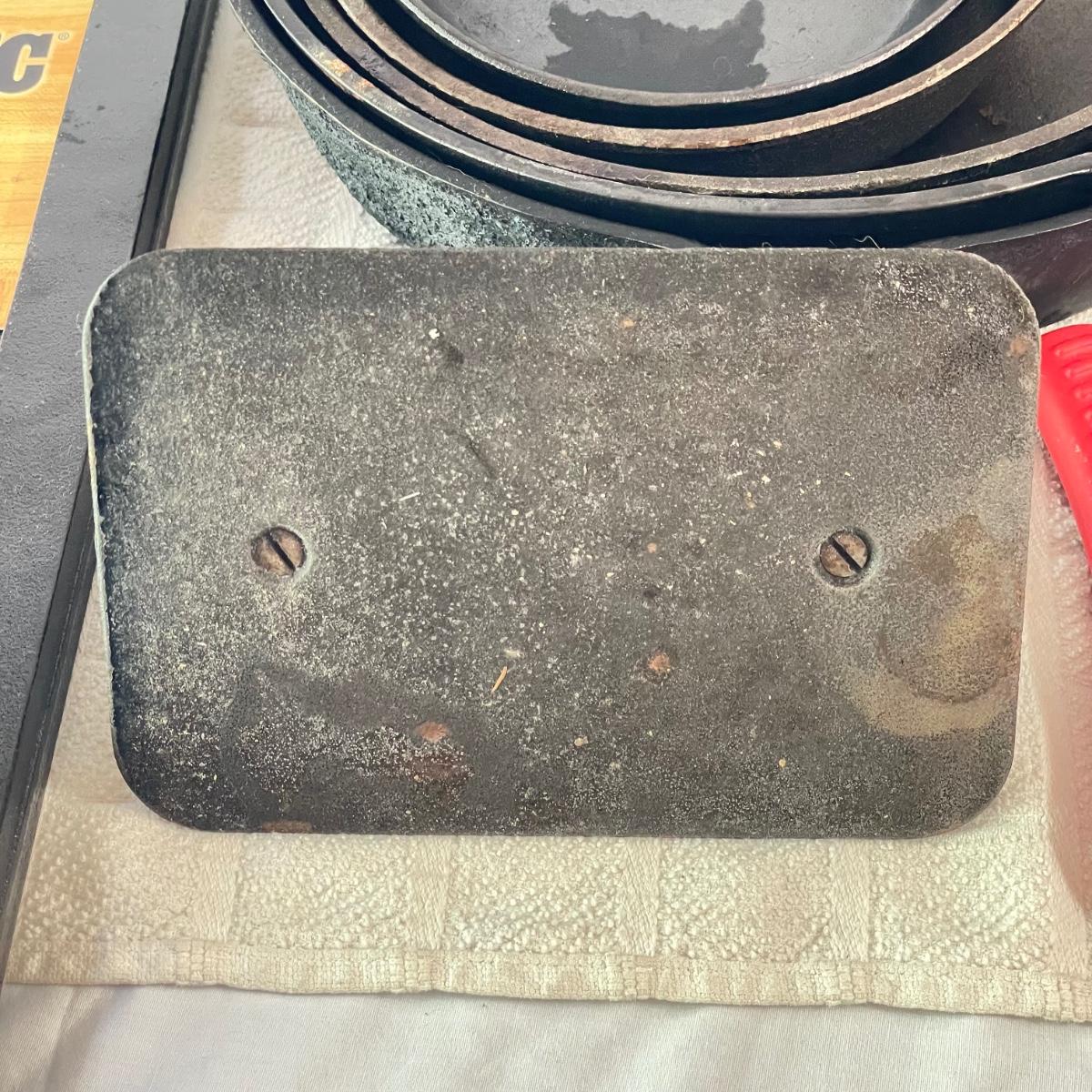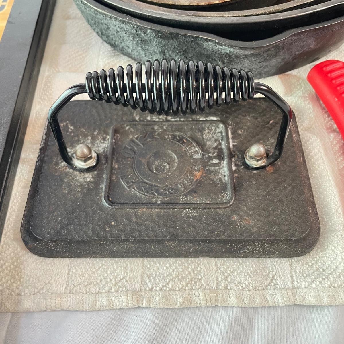 Cast iron cookware. Two burner Lodge Pro Grid Iron Griddle is reversible and measures 20” x 10.5”. Lot also contains five cast iron skillets ranging from 7”D to 12”D, two Le Creuset pan holders and a Lodge grill press. Largest pan has a decent amount of burnt residue. See images. Local pick up only.