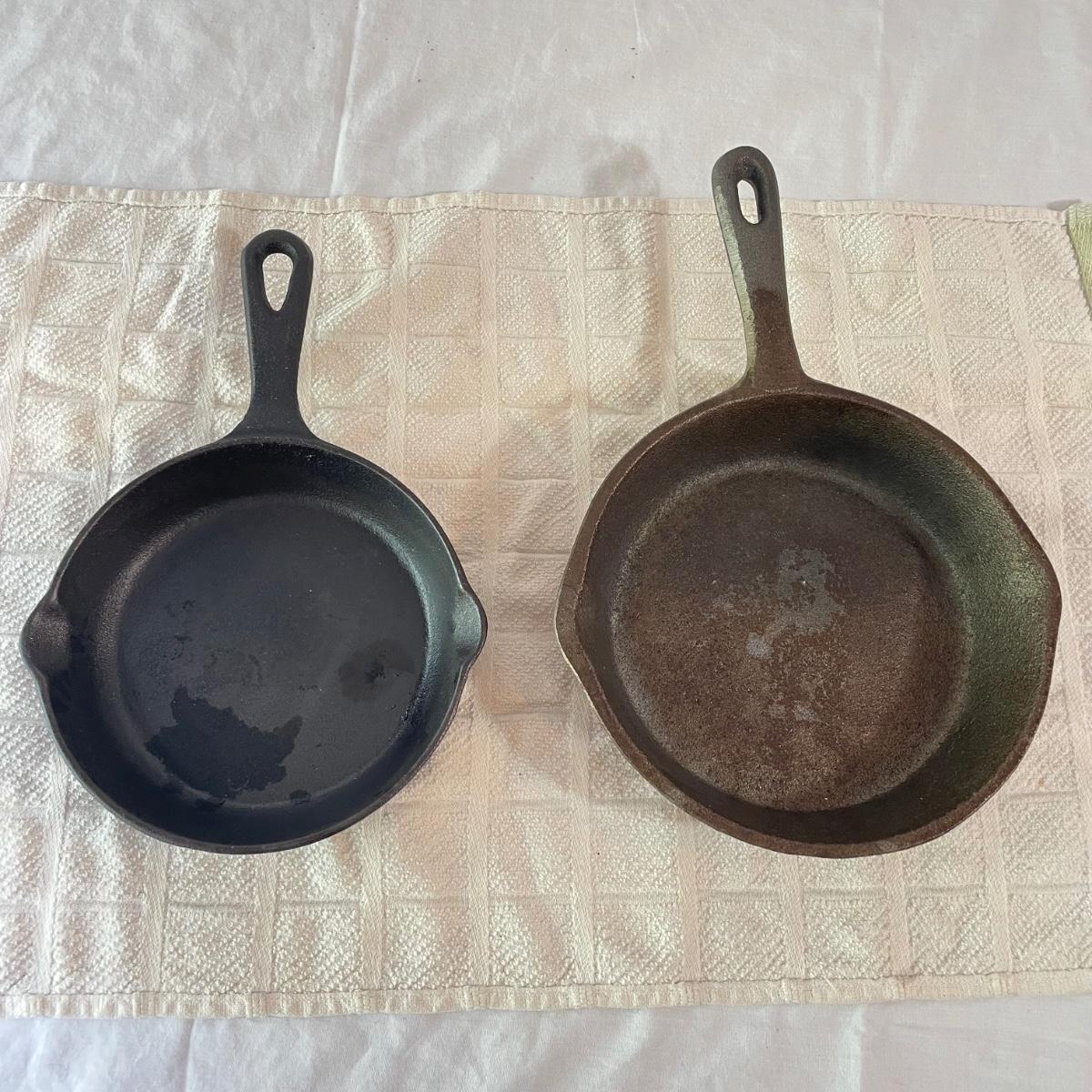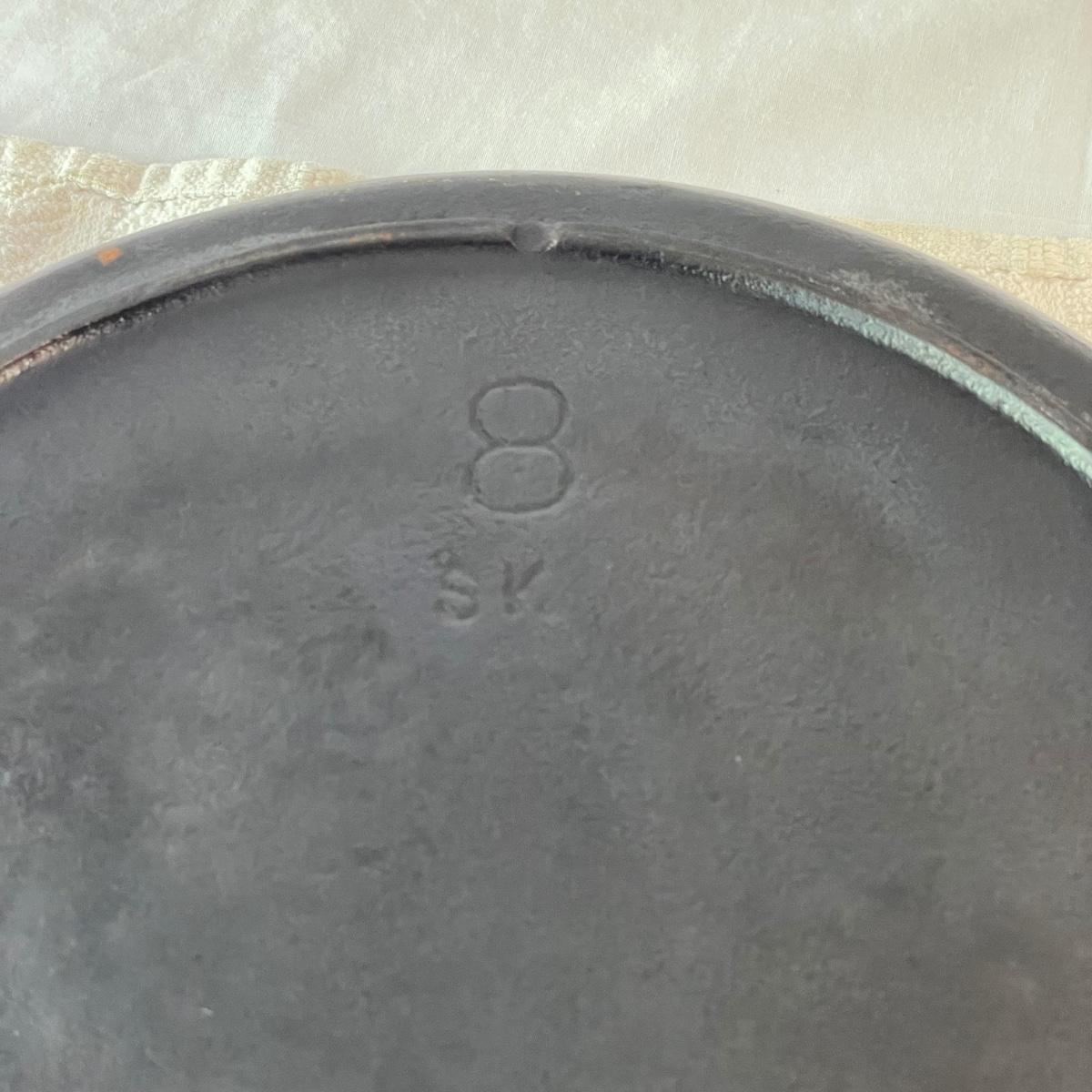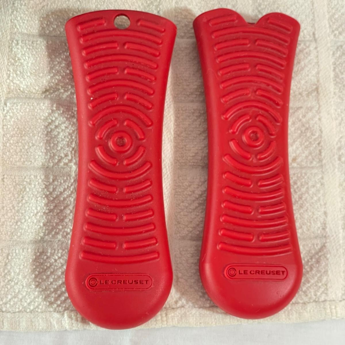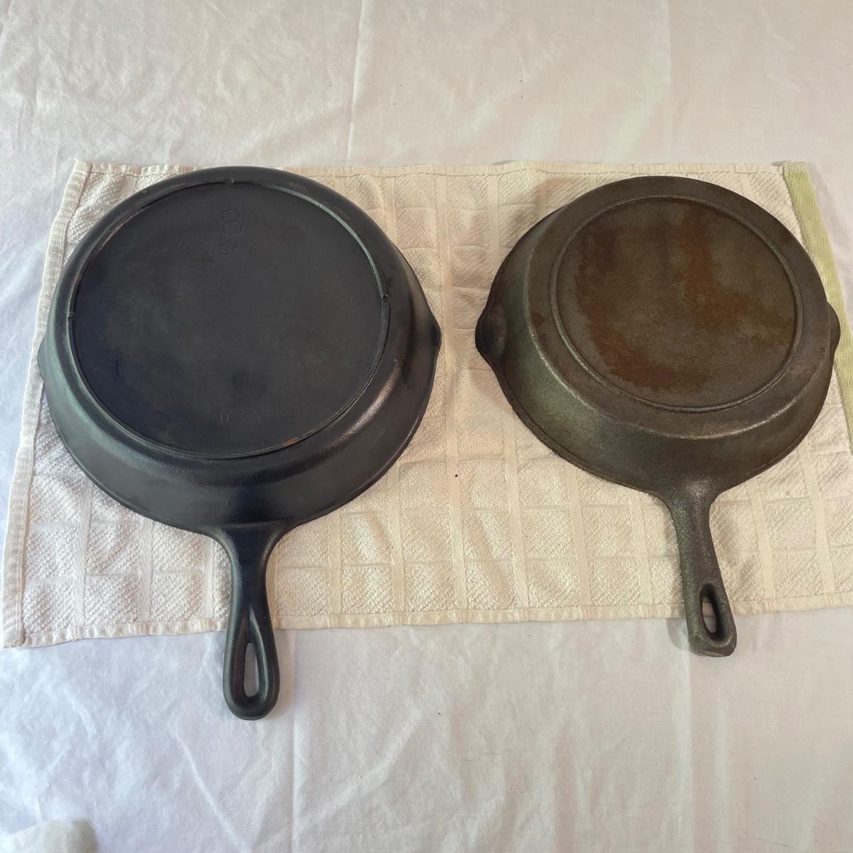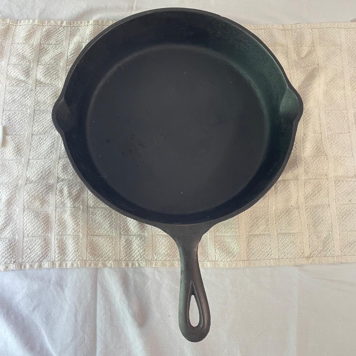 Cast iron cookware. Two burner Lodge Pro Grid Iron Griddle is reversible and measures 20” x 10.5”. Lot also contains five cast iron skillets ranging from 7”D to 12”D, two Le Creuset pan holders and a Lodge grill press. Largest pan has a decent amount of burnt residue. See images. Local pick up only.