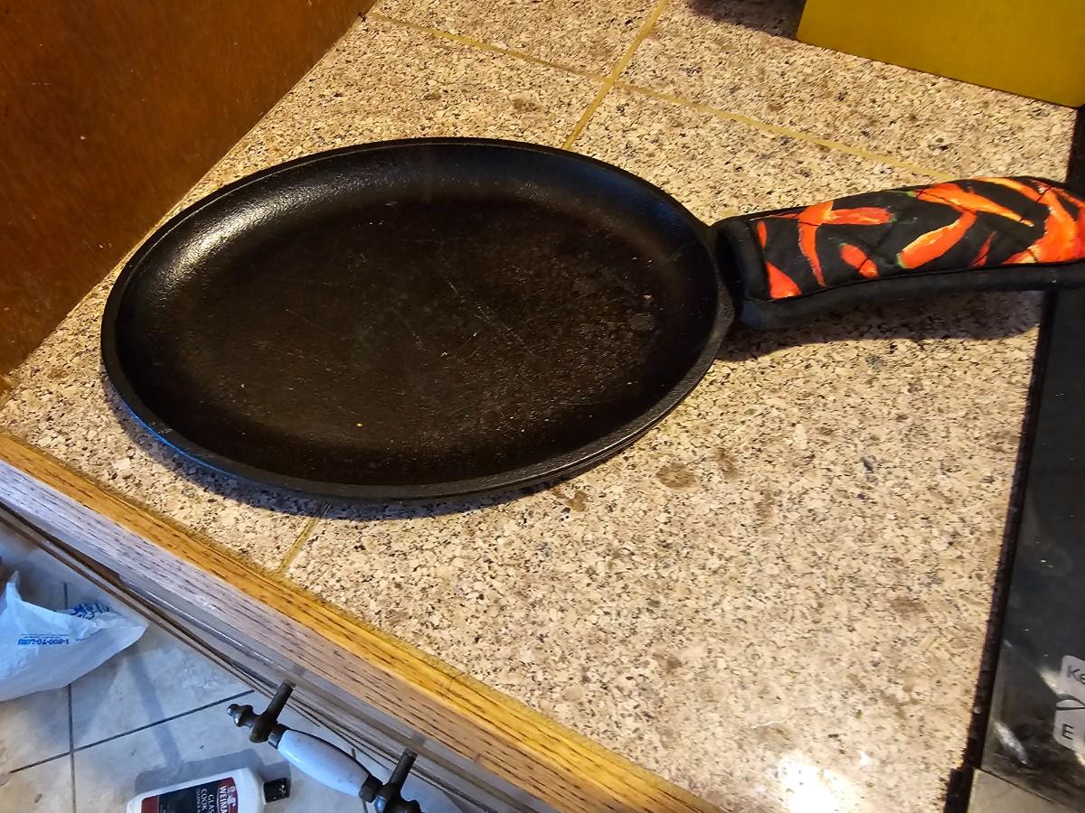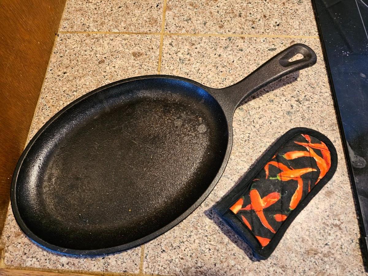 Lodge Oval cast Iron skillet with handle heat pad