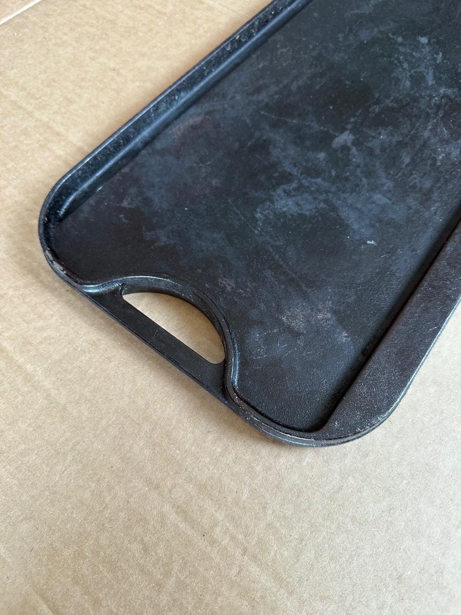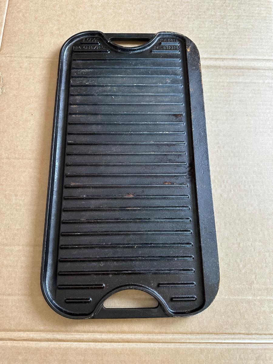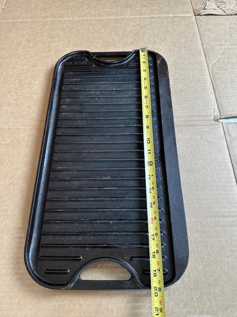 Vintage Lodge Pro Grid cast iron reversible griddle, made in the USA. One side is smooth for pancakes, eggs, and sandwiches; the reverse side features raised grill ridges for meats and vegetables.