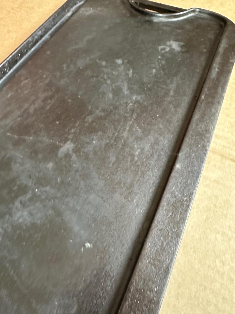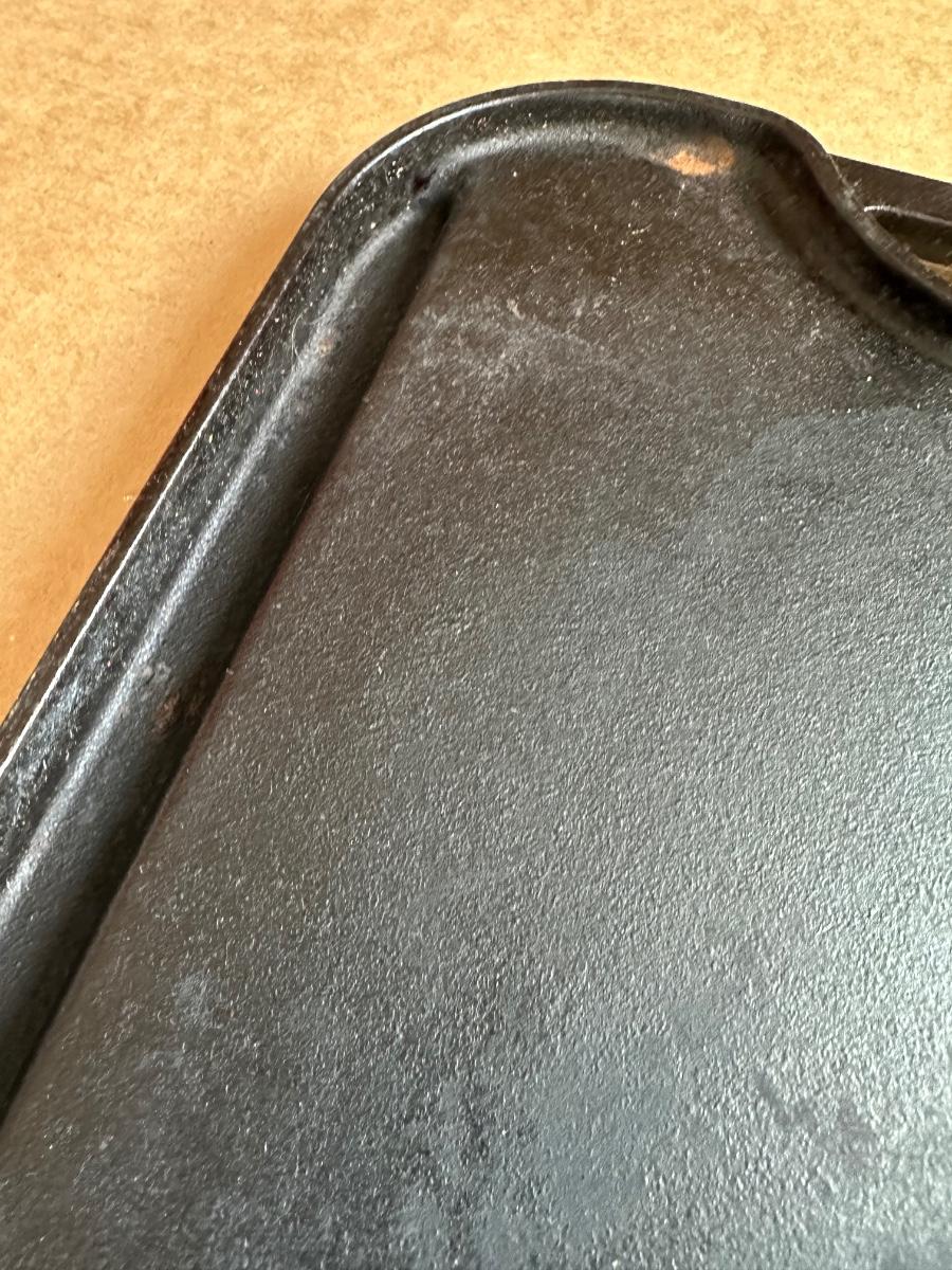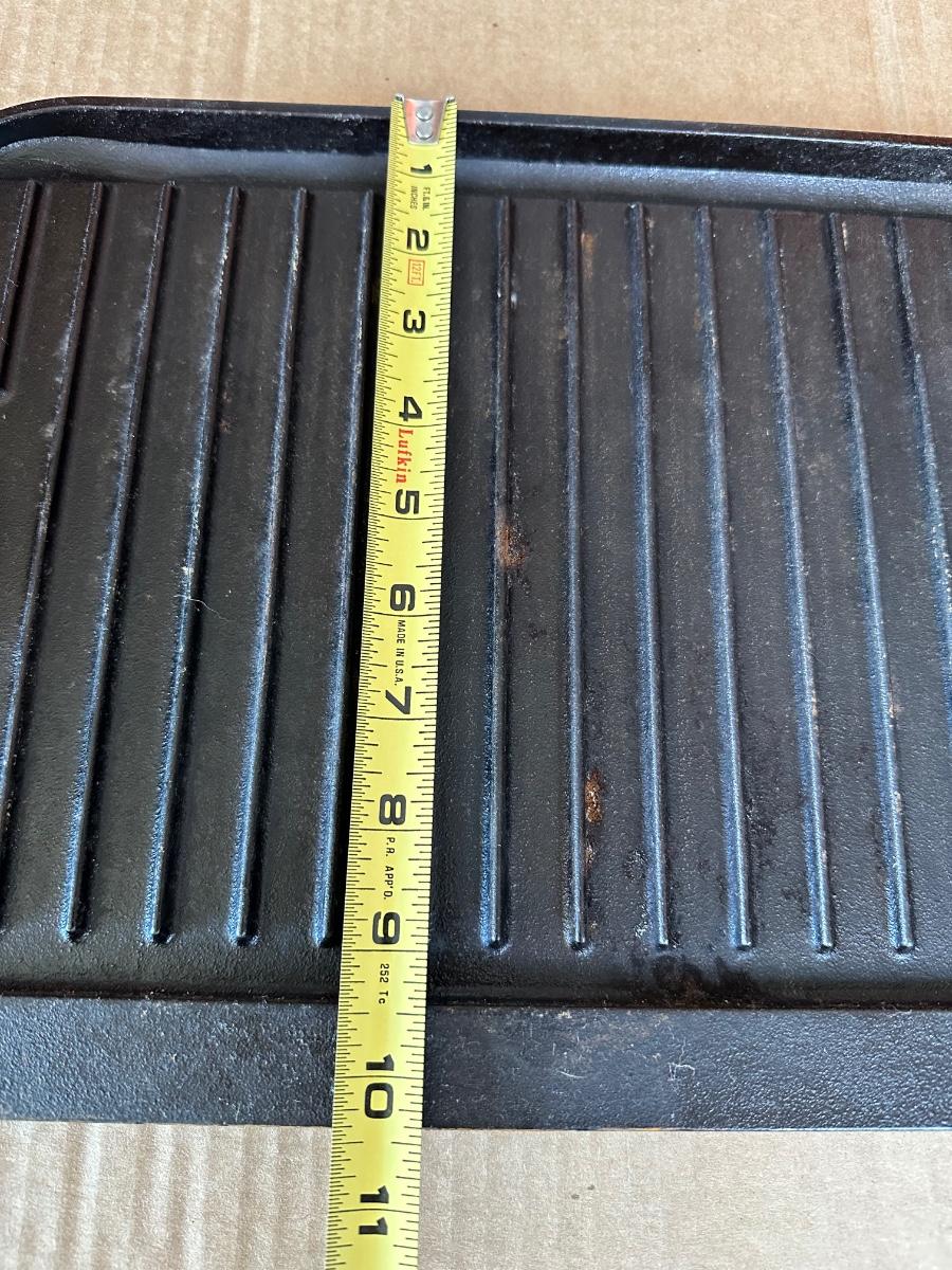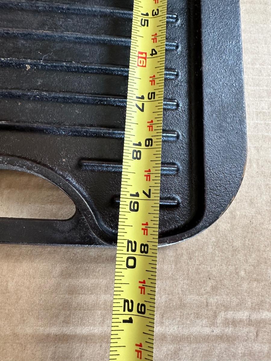 Vintage Lodge Pro Grid cast iron reversible griddle, made in the USA. One side is smooth for pancakes, eggs, and sandwiches; the reverse side features raised grill ridges for meats and vegetables.