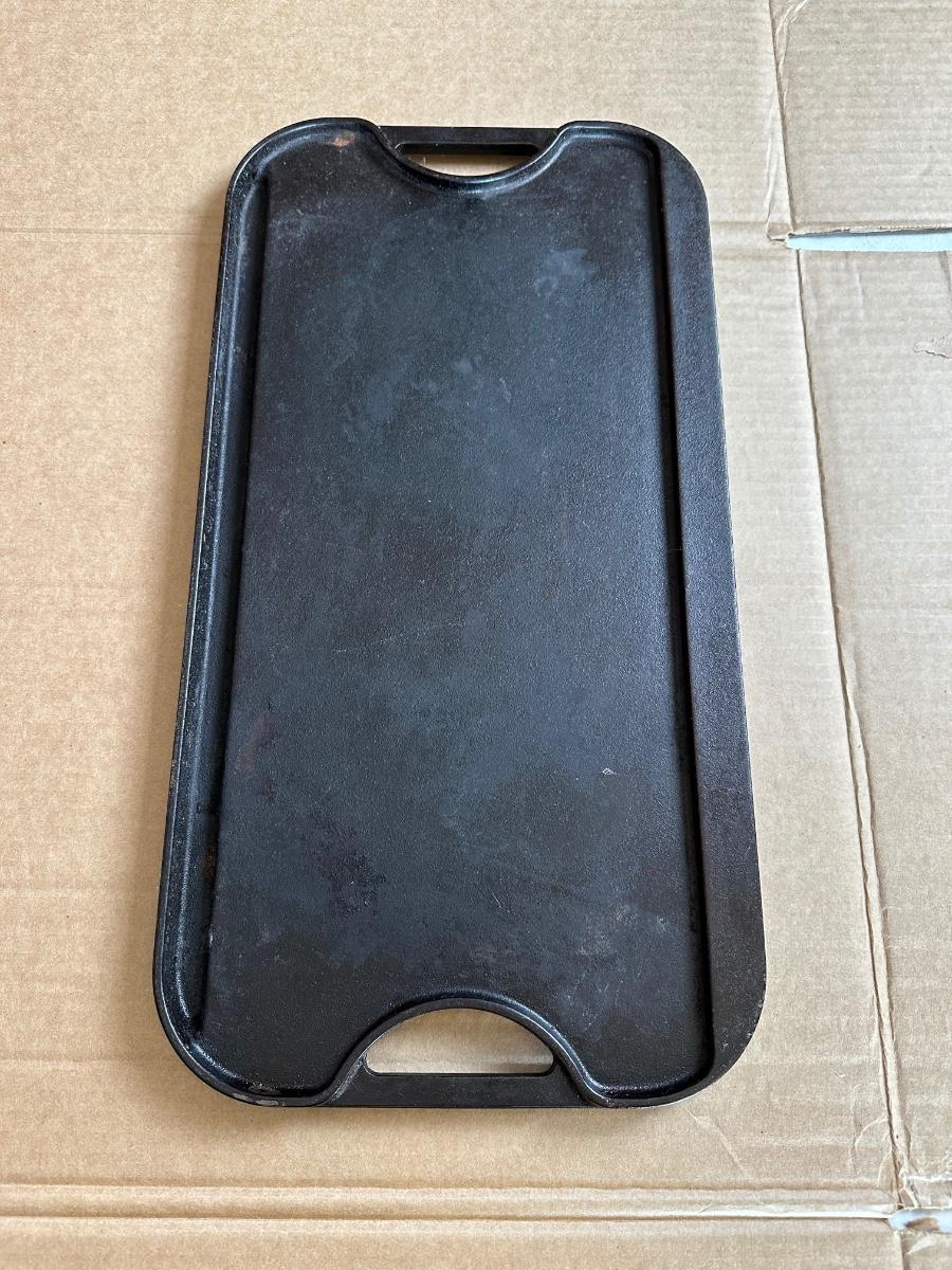 Heavy-duty cast iron construction with integrated carry handles on both ends. Suitable for stovetop, oven, grill, or campfire use.