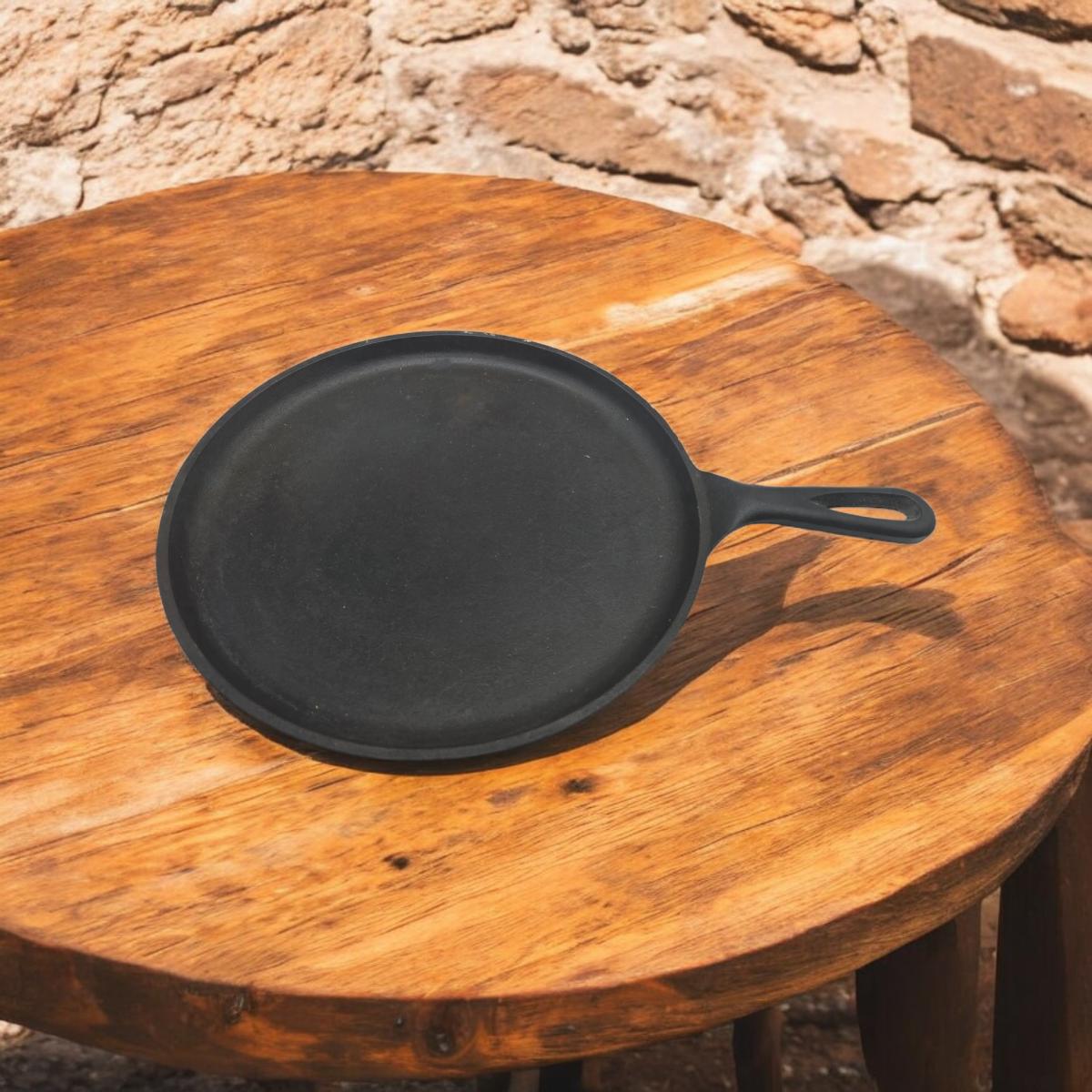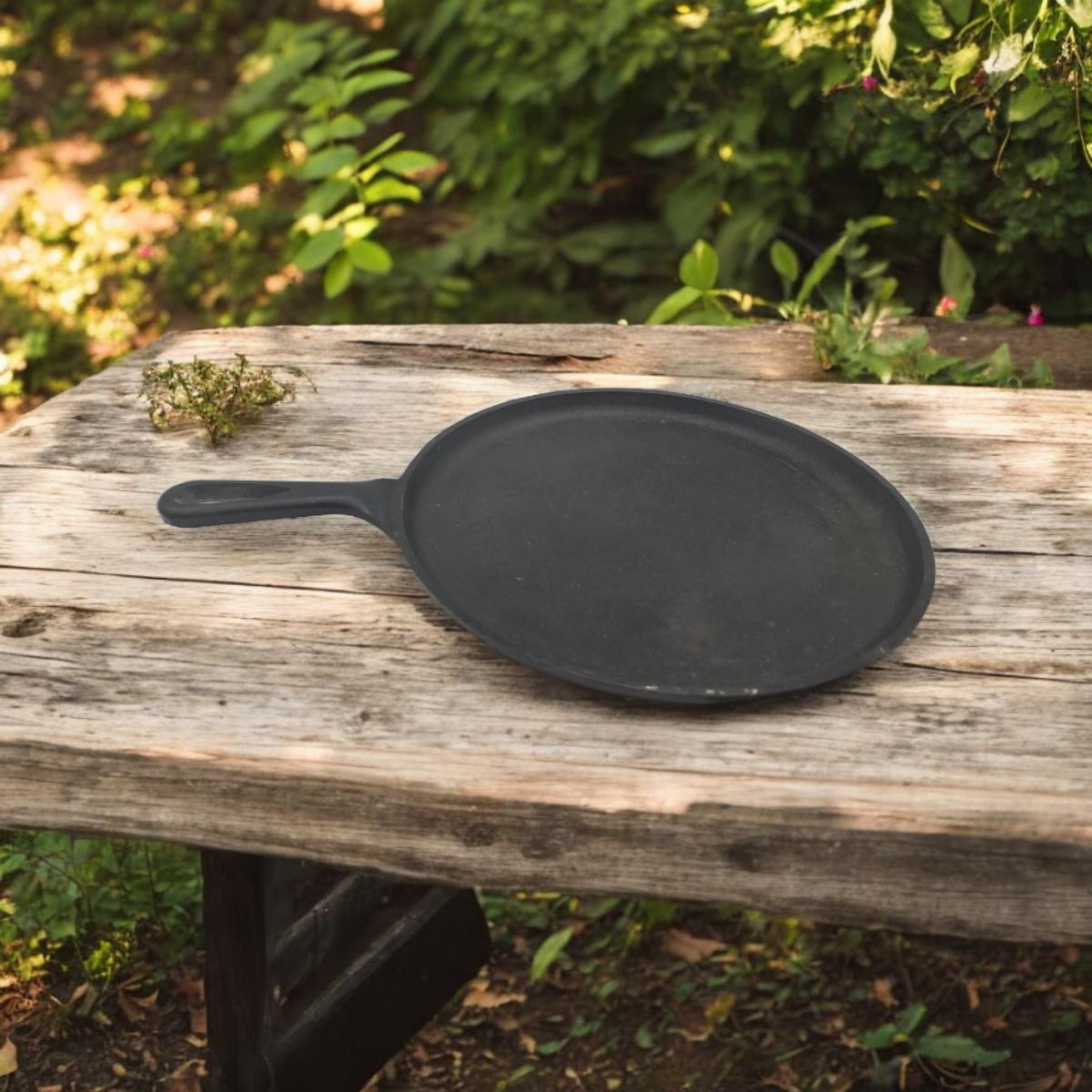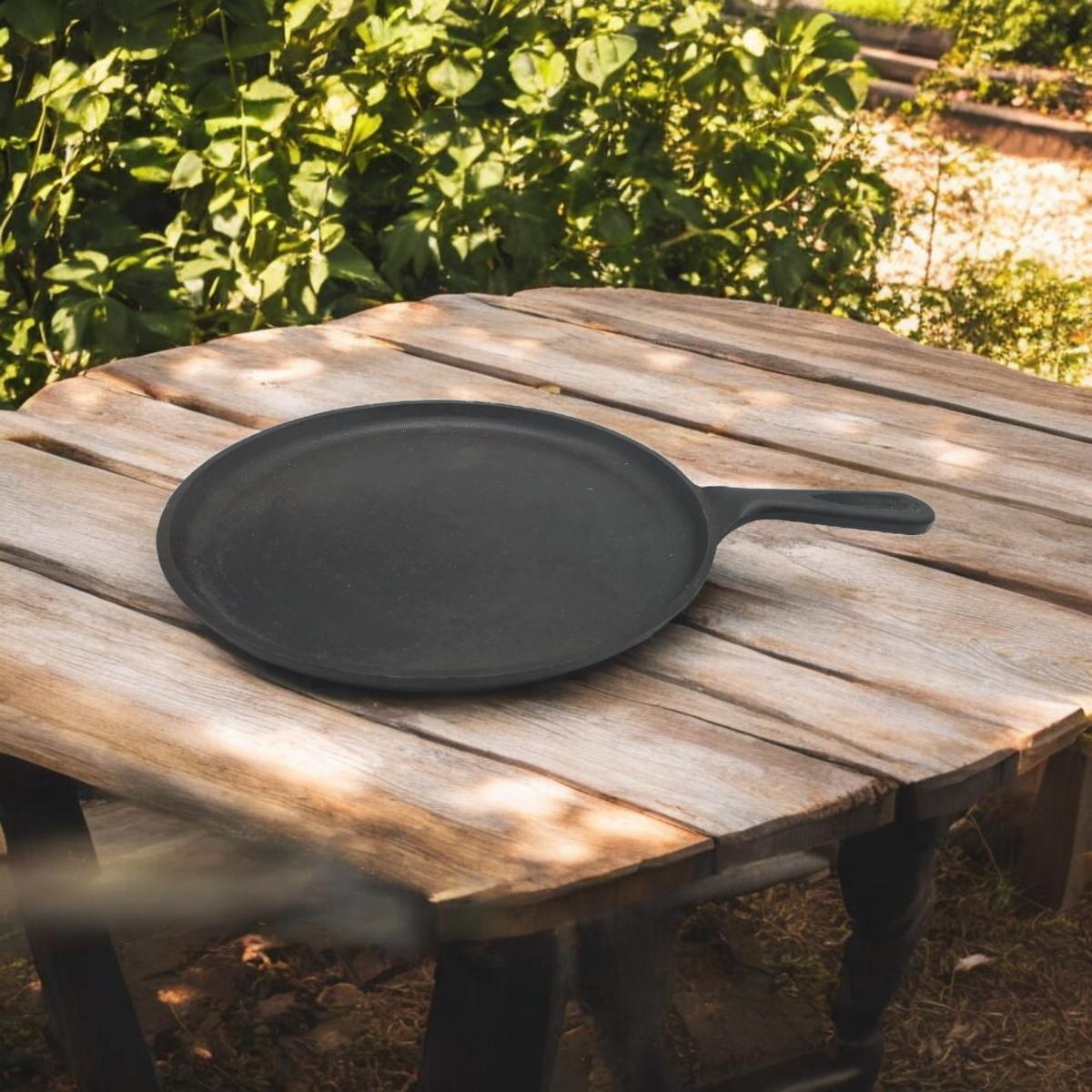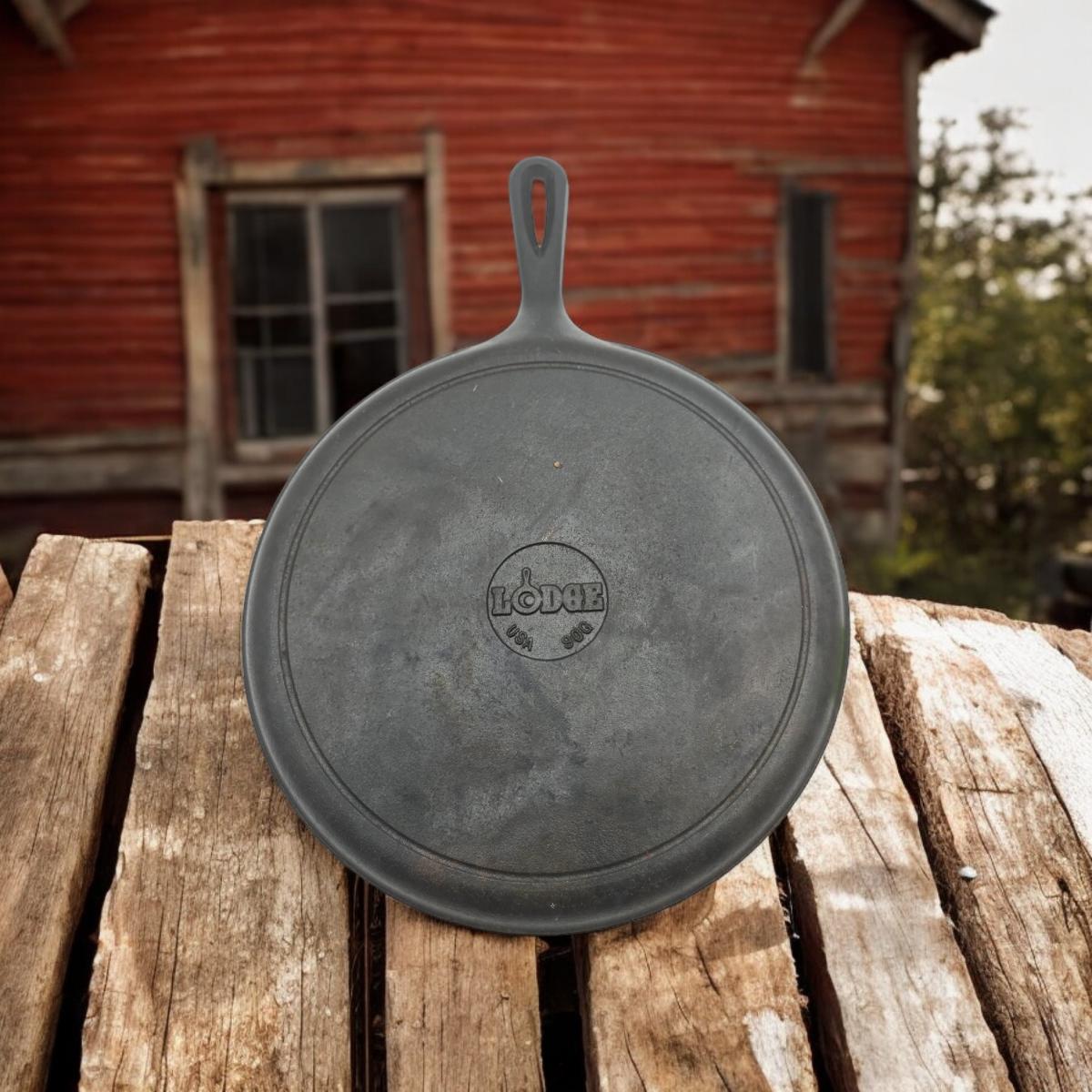 Sits flat, does not wobble or spin. Does have a heat ring on base. This item would pair well with your LODGE cast Iron cookware. Perfect for indoor and outdoor use. May this item yours!