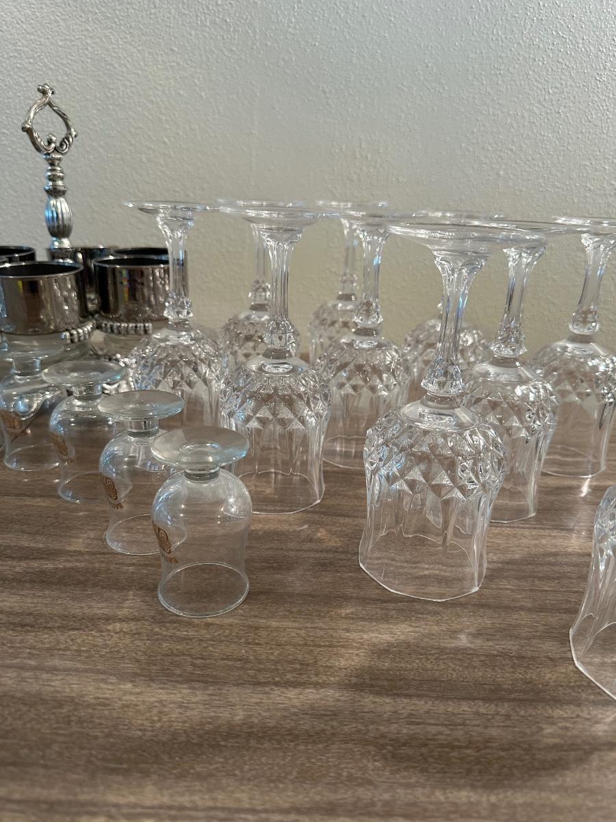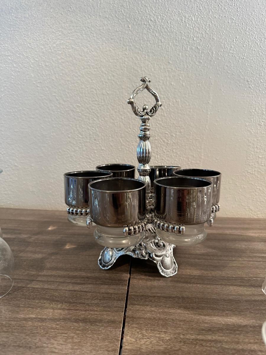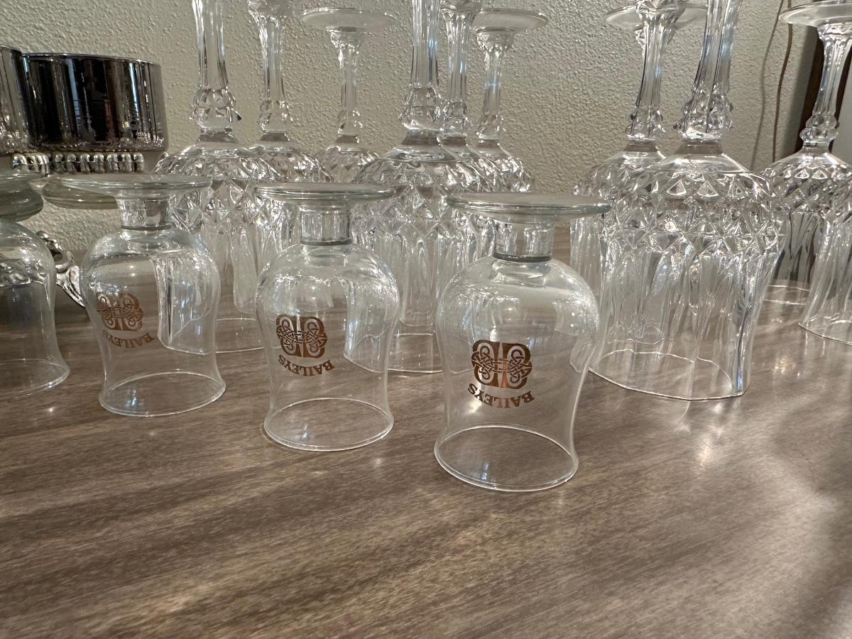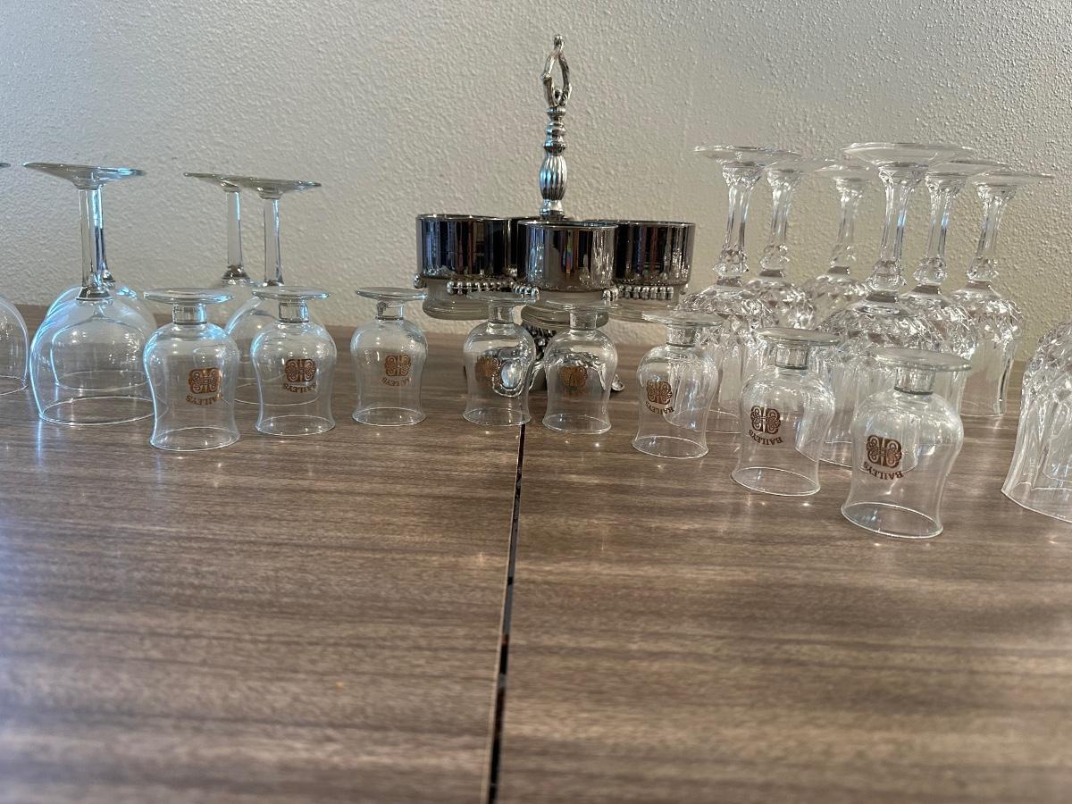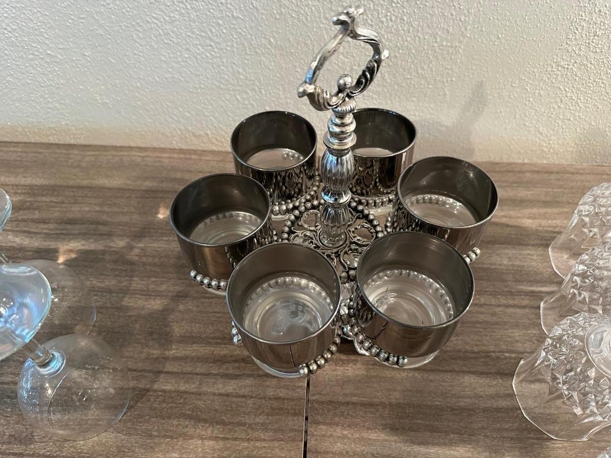 LOEVSKY & LOEVSKY BAR SET W/WIDE SILVER BAND AND STEMMED GLASSES