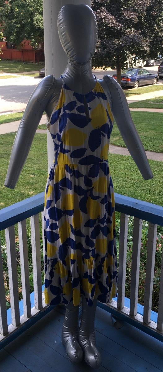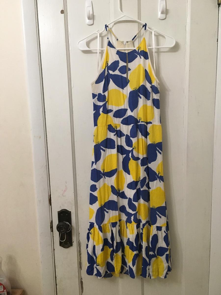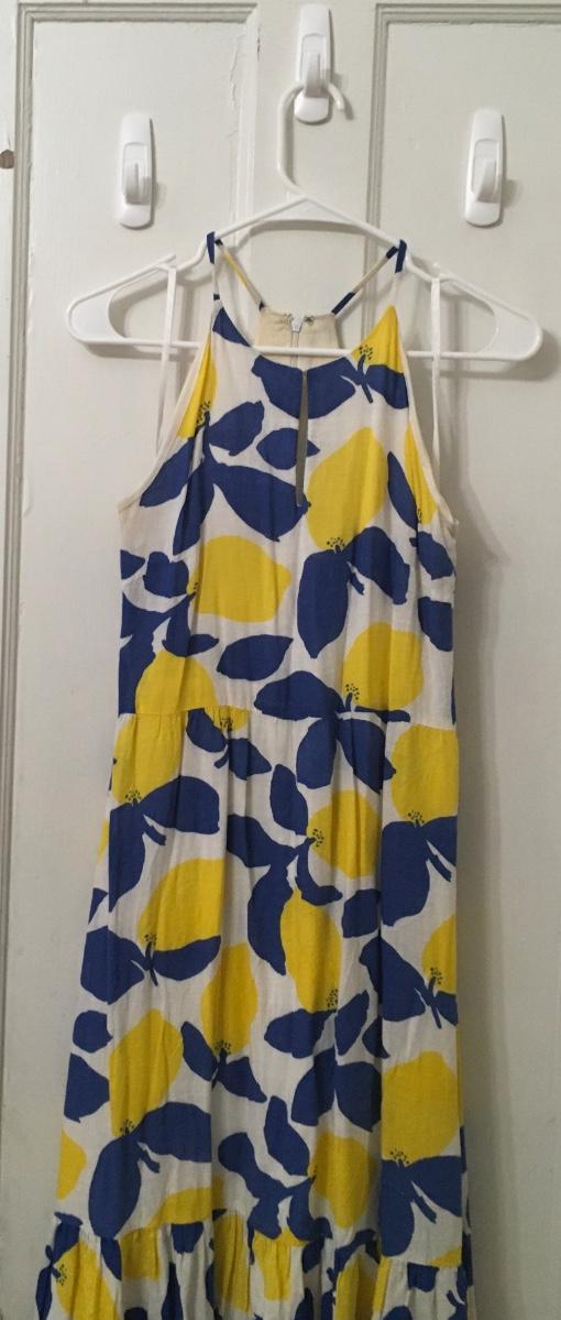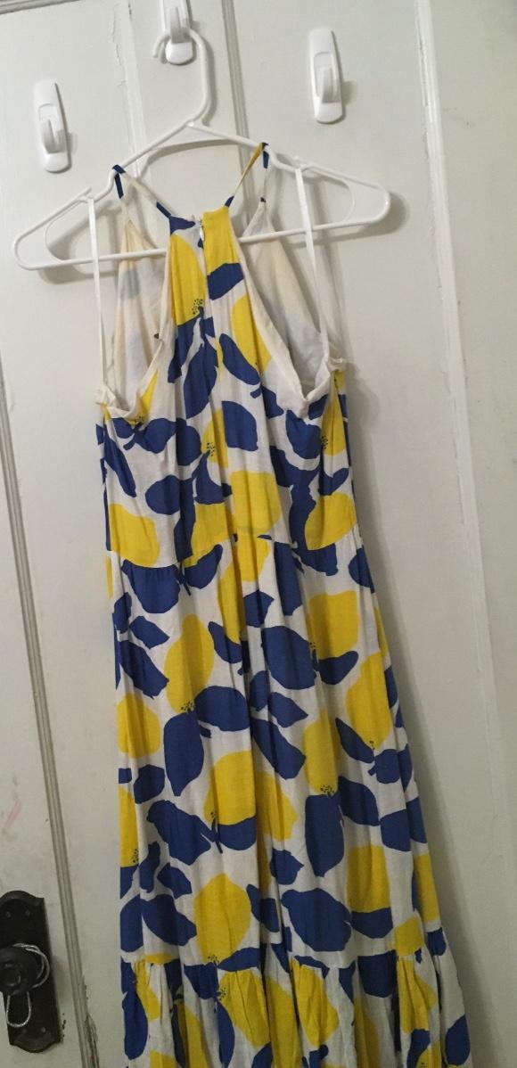 Vibrant midi dress with bold blue and yellow leaf pattern. Sleeveless design and perfect for casual events.