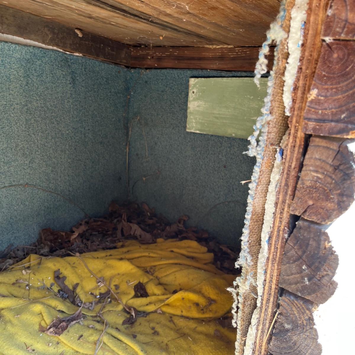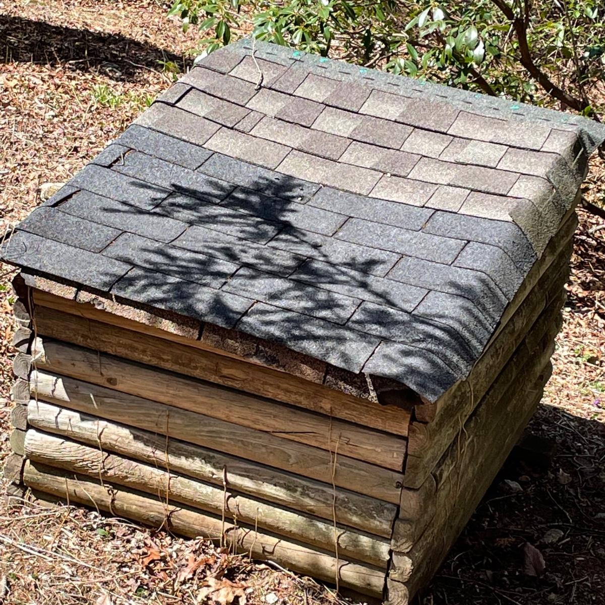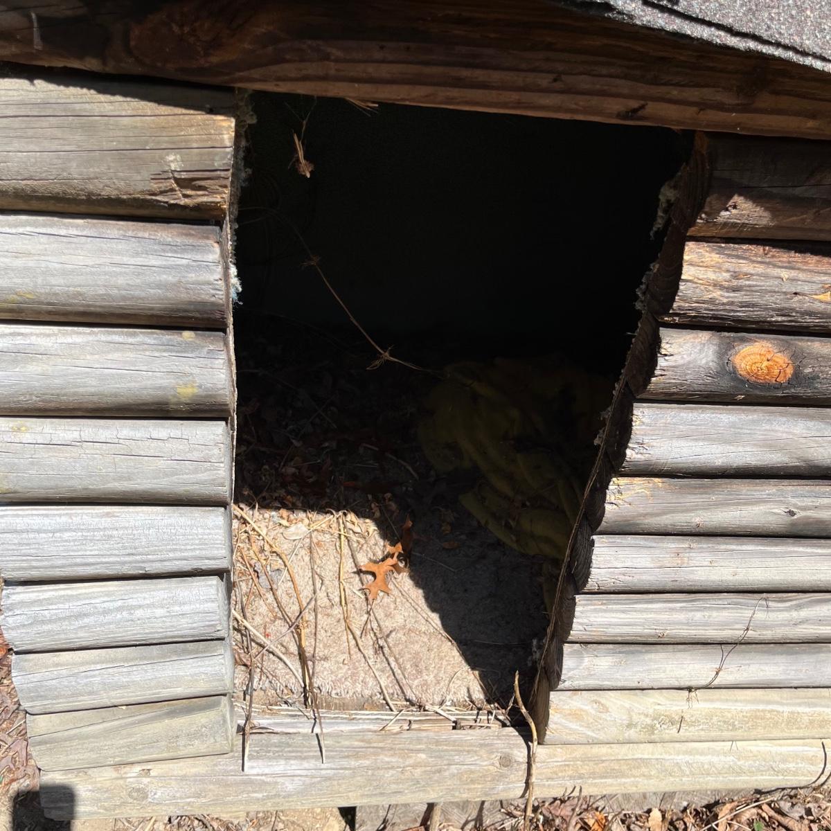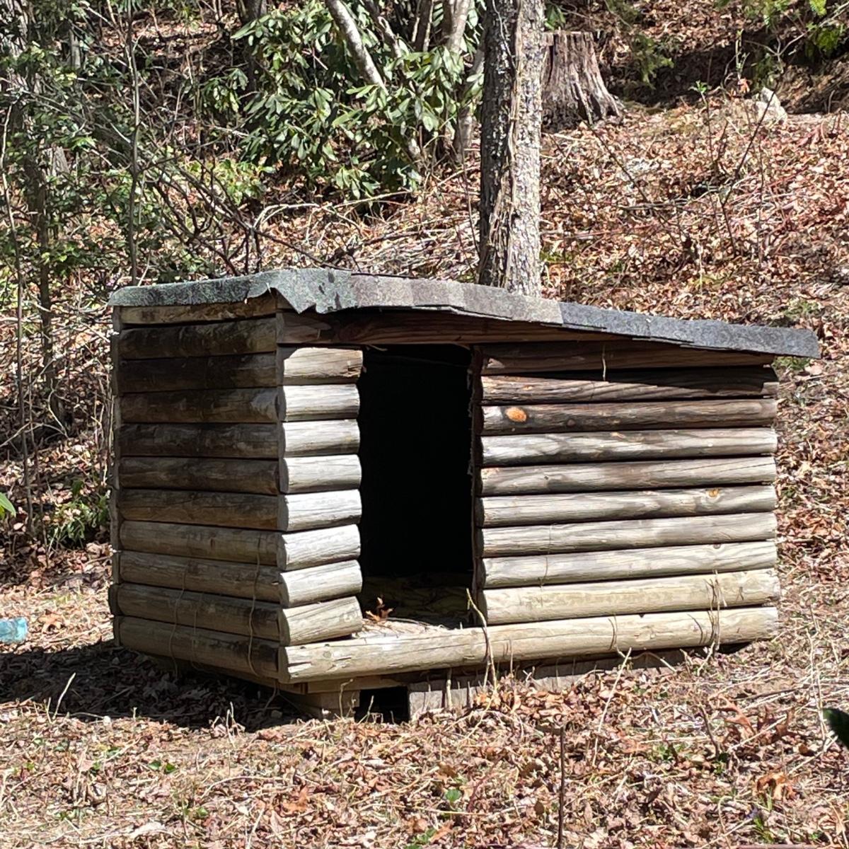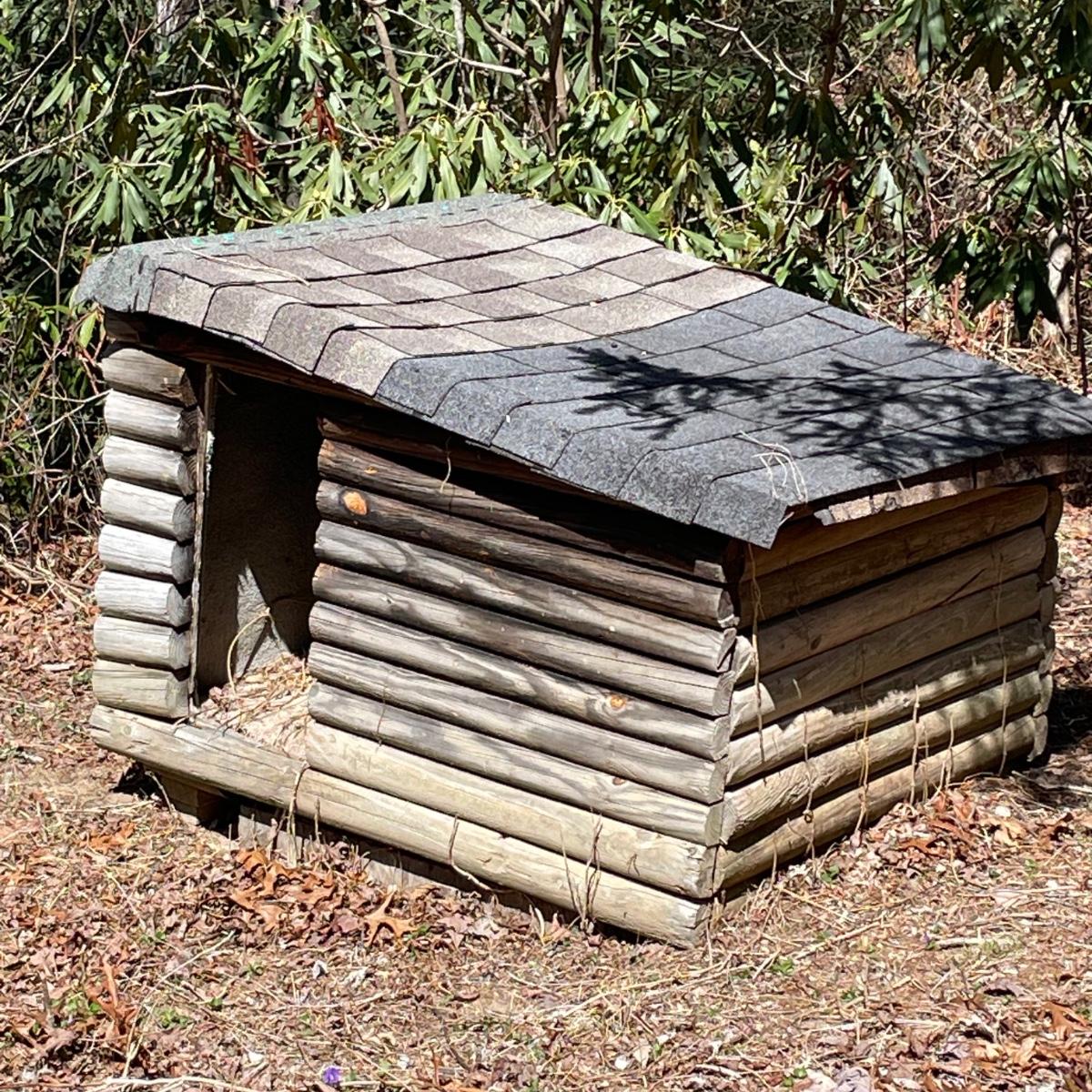 This large pet house is made of wood with a regular shingle roof and looks like a little log cabin. It's currently placed on cement blocks which come with it if desired. It’s in good condition and measures 43” x 57” x 38”