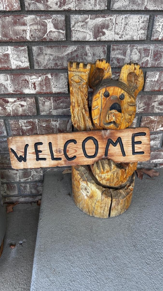 CARVED LOG WELCOME BEAR AND A NICE GLAZED CLAY PLANTER