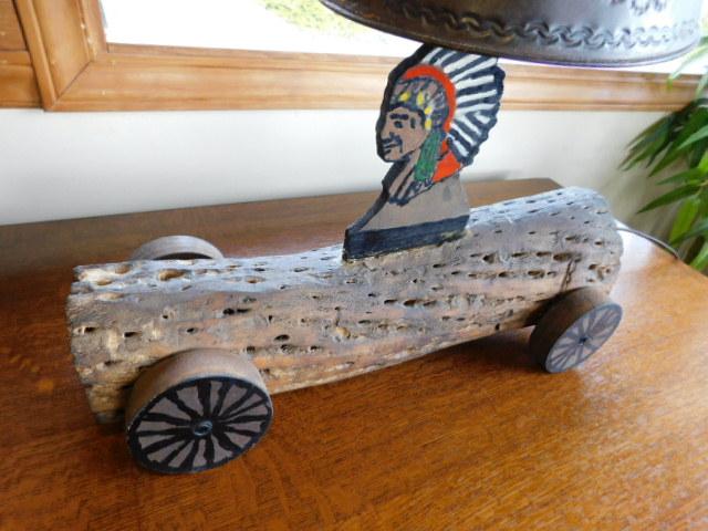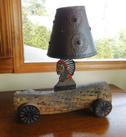 Log Ride Native American Bust Lamp with DEcorative Tin Punch Out Shade 16"x17" unique item. Bust is glued onto log. Original.