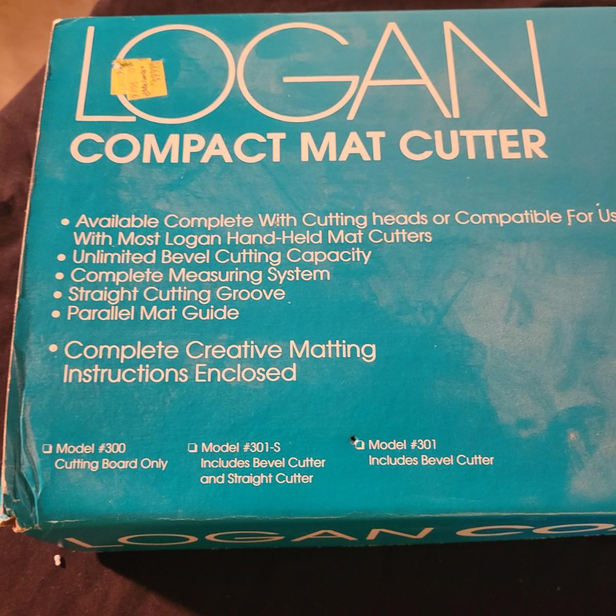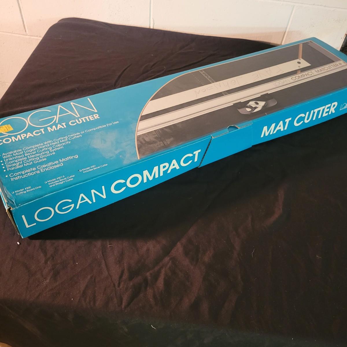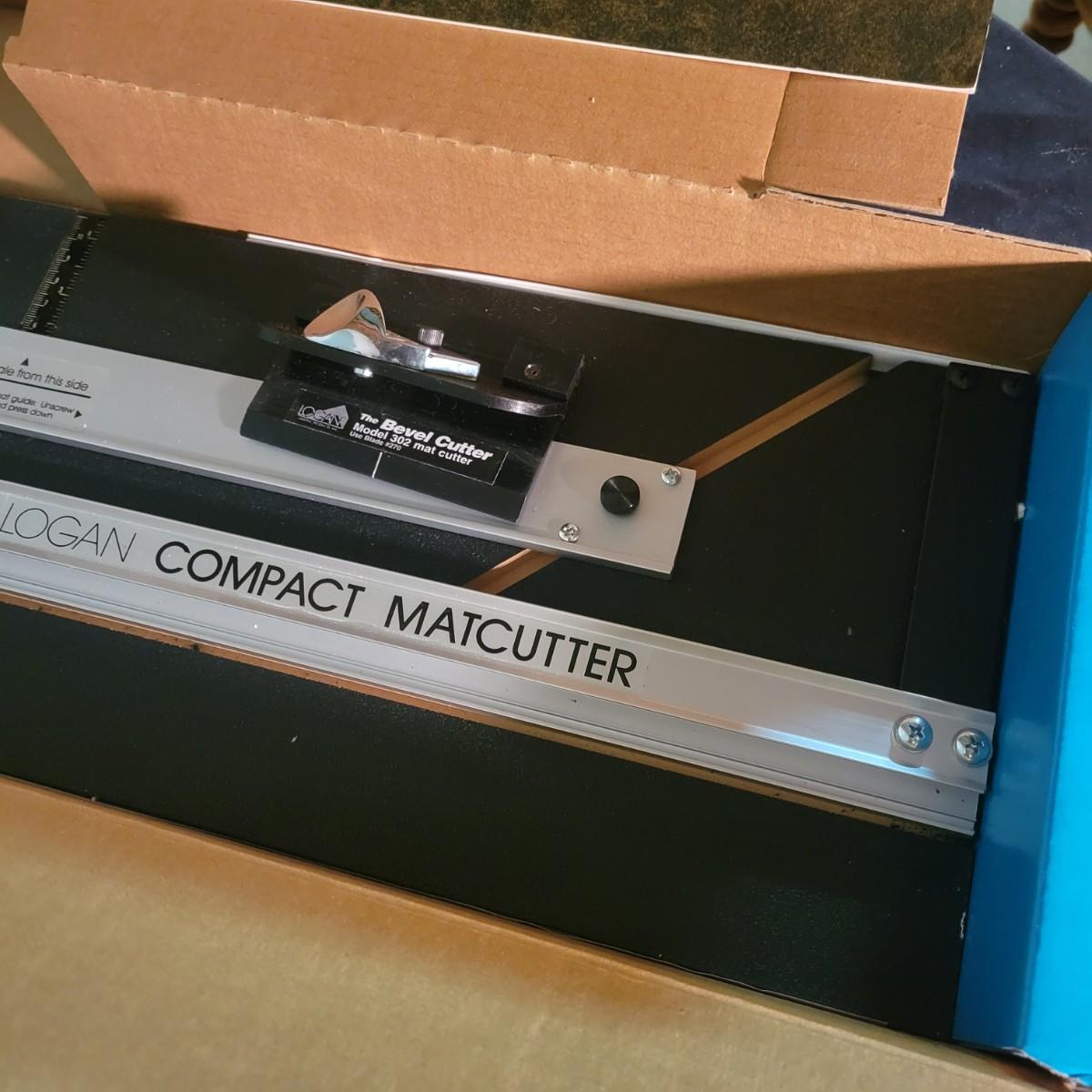 A model #301 Logan compact mat cutter in good condition. Mat cutter has seen light use and includes a cutting board, straight edge and a beveled cutter. Box measures approximately 34" x 8.5" x 3".