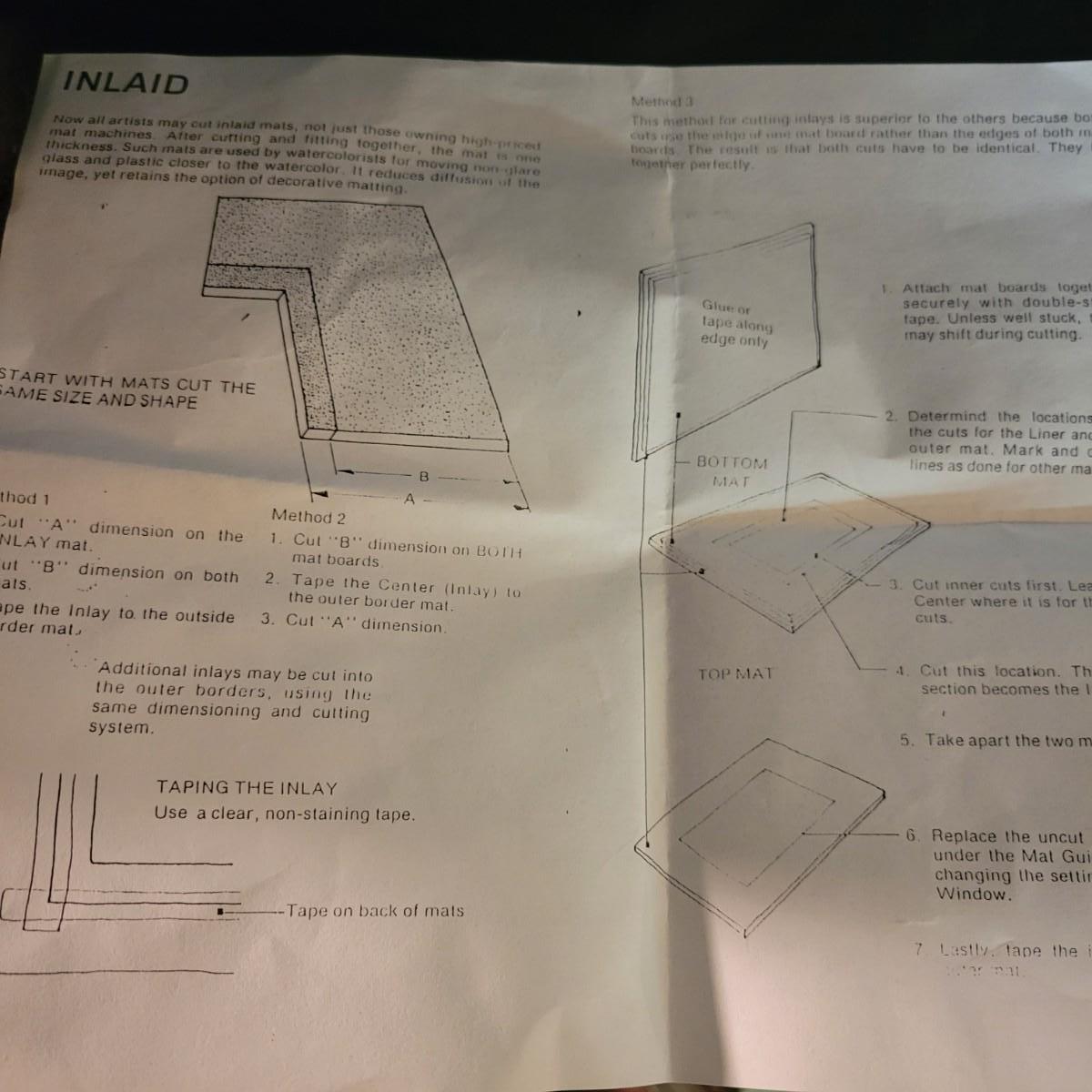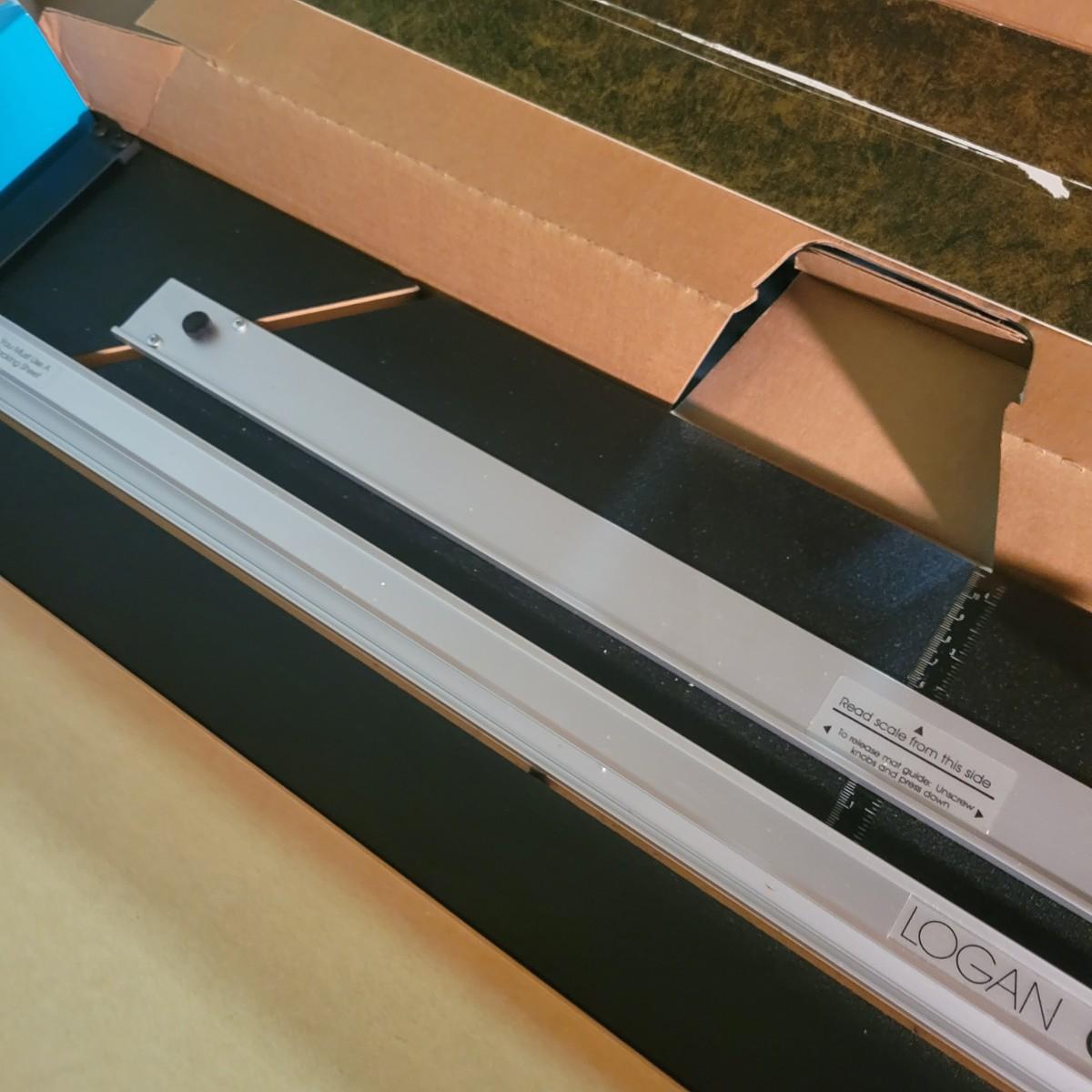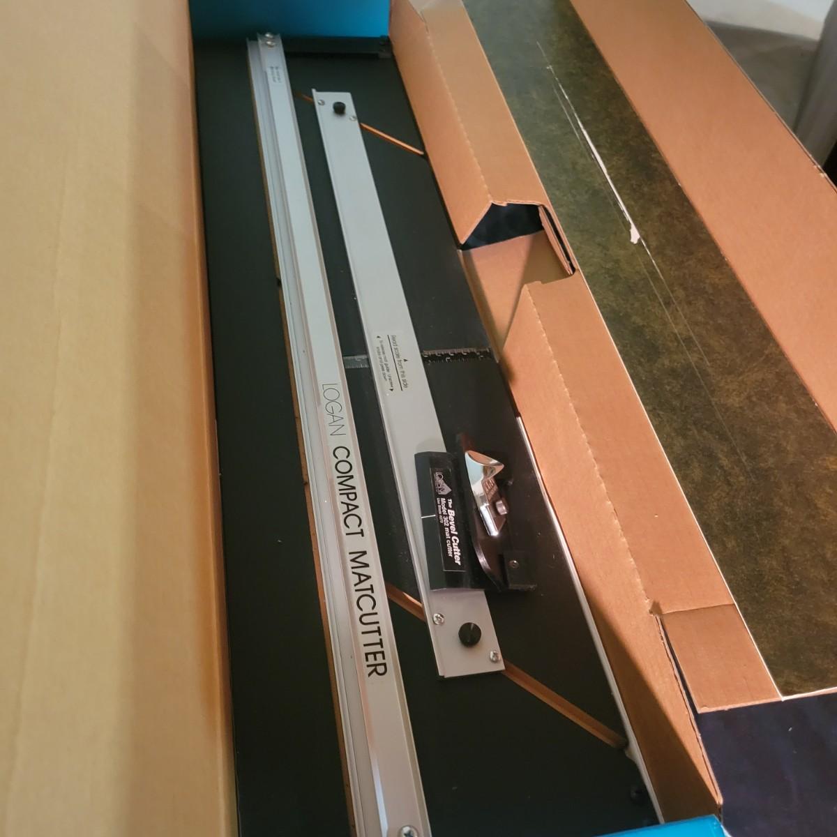 A model #301 Logan compact mat cutter in good condition. Mat cutter has seen light use and includes a cutting board, straight edge and a beveled cutter. Box measures approximately 34" x 8.5" x 3".