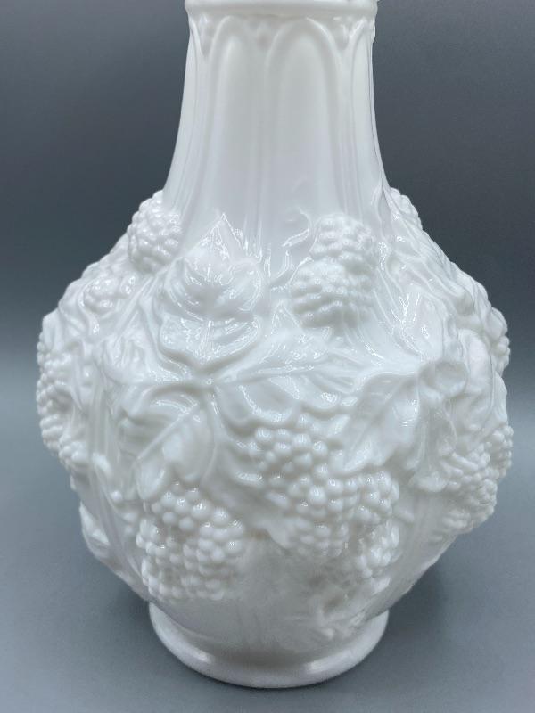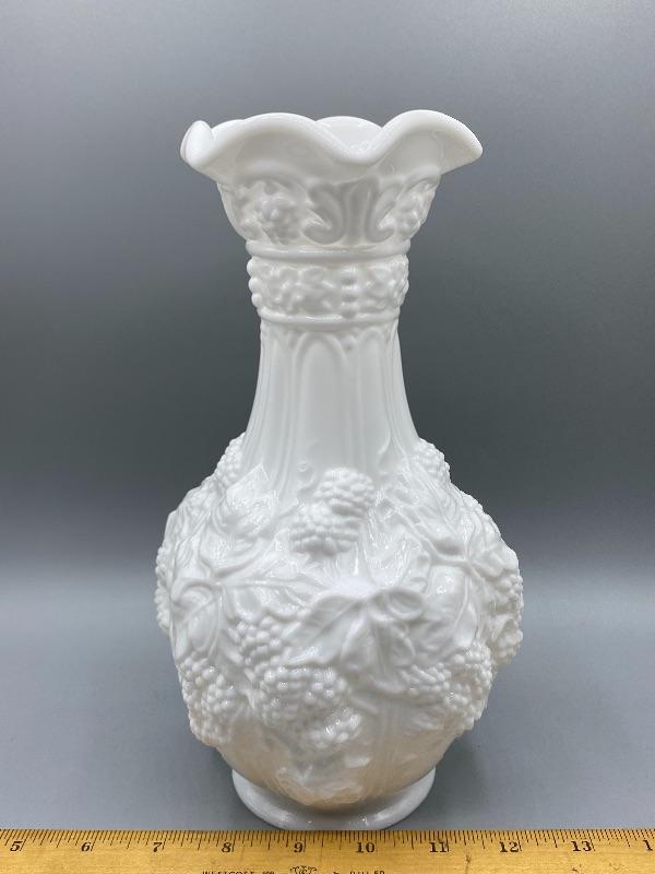 Loganberry Raspberry Blackberry Vine Embossed Imperial Milk Glass Ruffled Vase