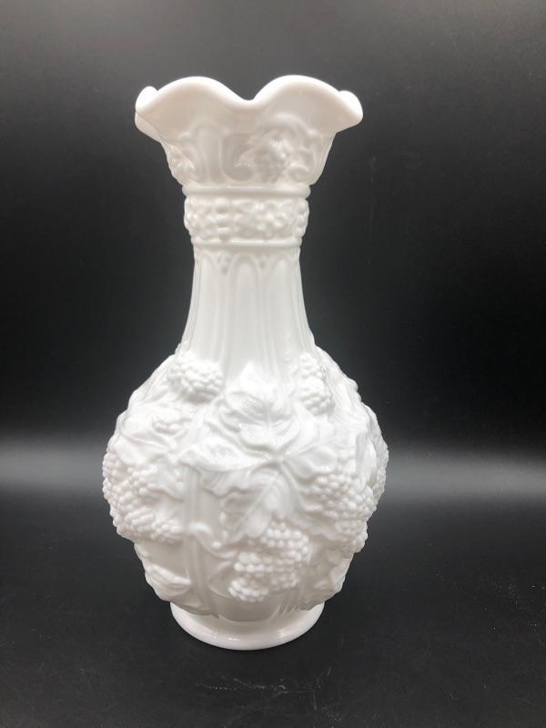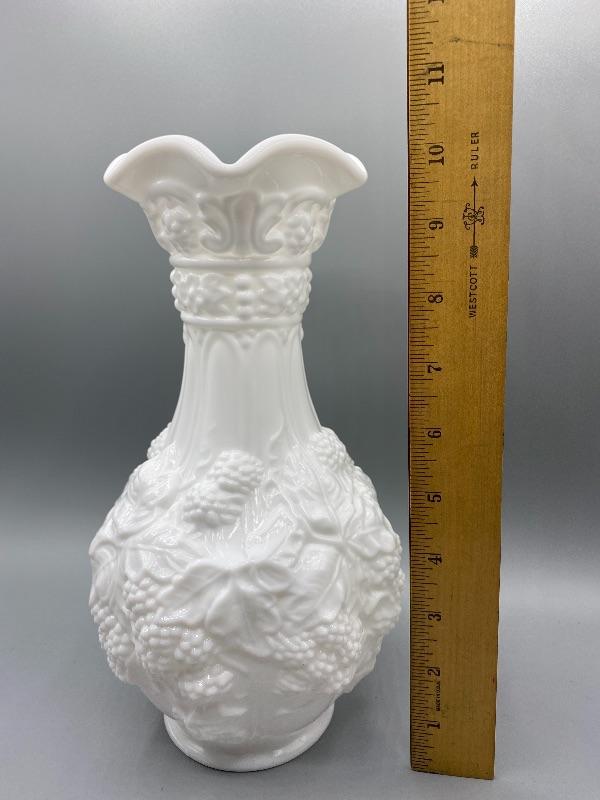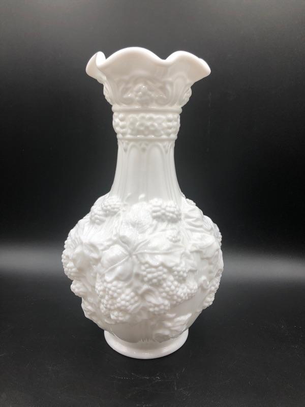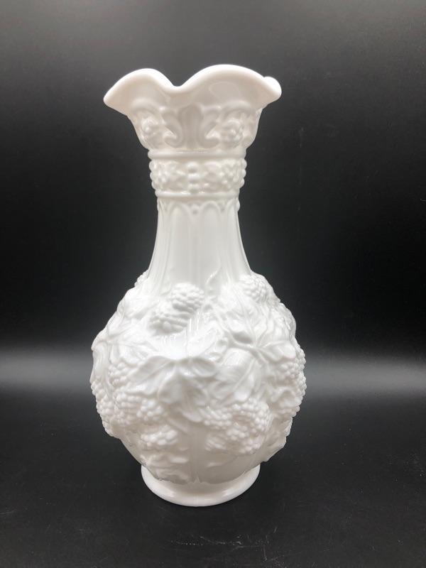 Beautiful embossed milk glass vase from Imperial glass. Loganberry vine pattern. Great details all over. Ruffled edge. Excellent condition. Stands just over 10" tall. Brilliant white color.