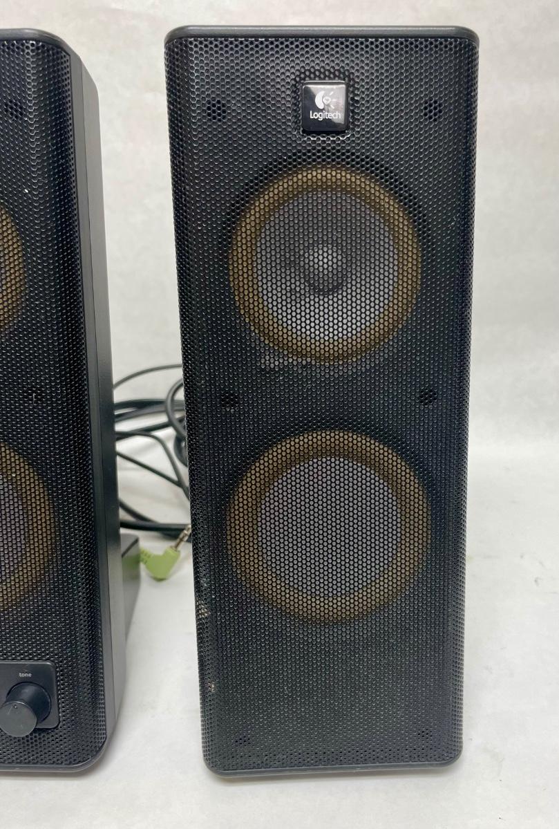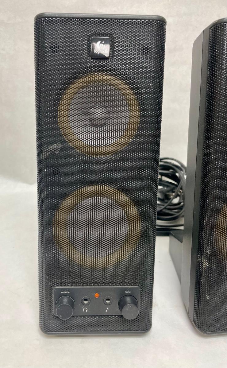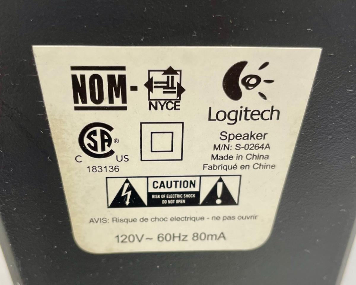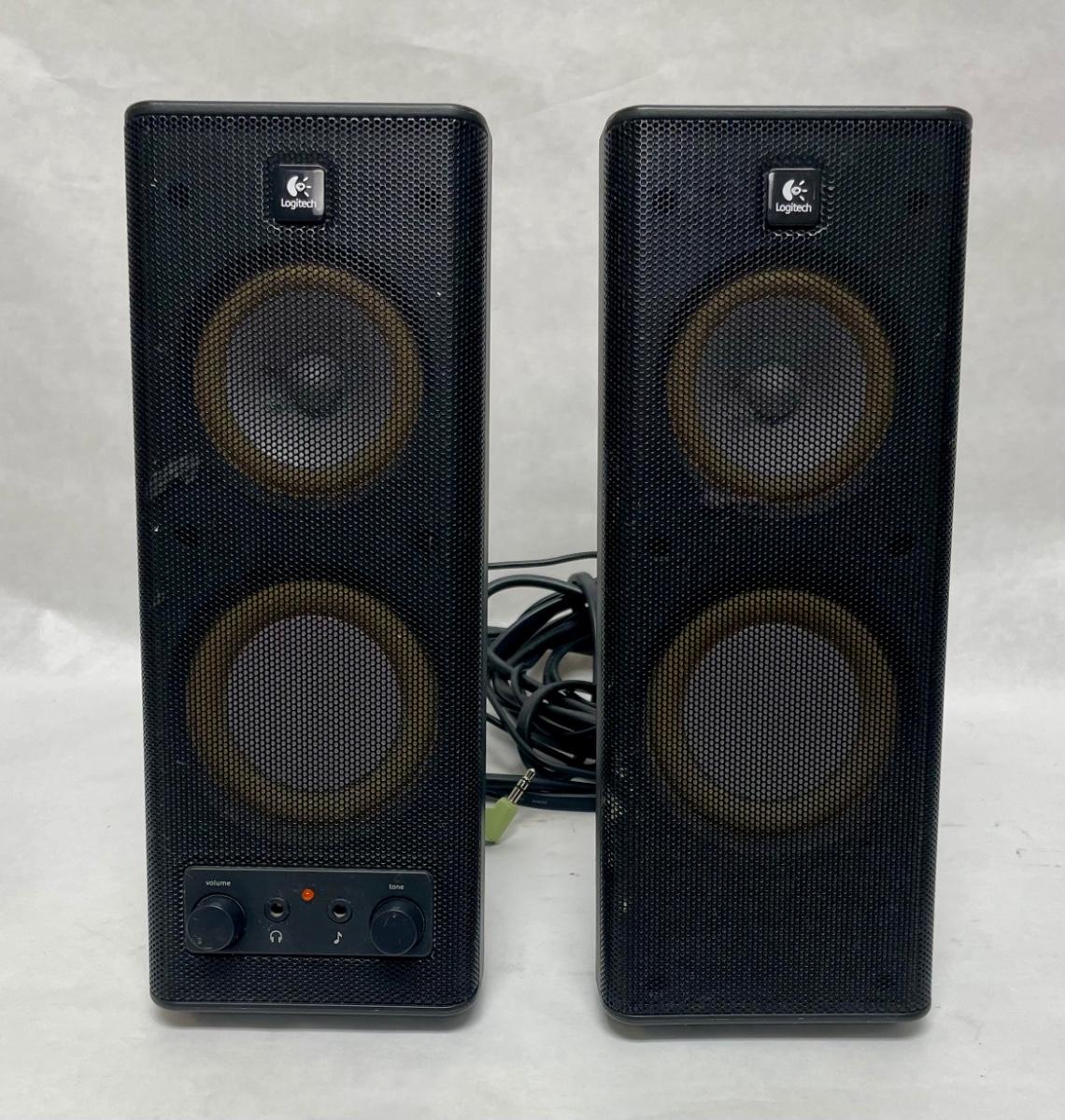 Model S-0264A. Speakers are powered and wired to each other, and have a simple audio plug to connect to the computer. Primary speaker has the on/off/volume knob, and a tone knob. Can sit on the desktop or on a nearby bookshelf. Output is 5W, height is approx. 9". Tested, in good working condition.