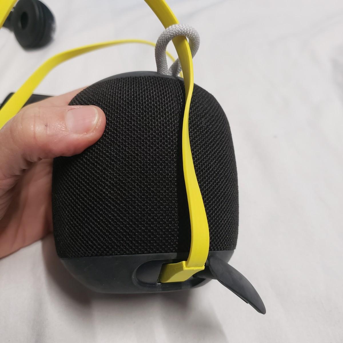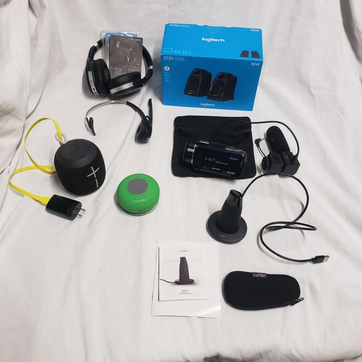 This media lot has six pieces of electronic equipment that all powered on when plugged in. We could not capture all devices with a power button light on. The Lumen health monitor pairs with your phone to help monitor various health systems. The BesteKer small, hand held digital camera comes with a detachable microphone. This device powered on, but we were unable to test it. The SoundBot small speaker has a suction cup to hold it in place. The Ultimate Ears is also a small speaker for easy travel. It comes with a charging cord.